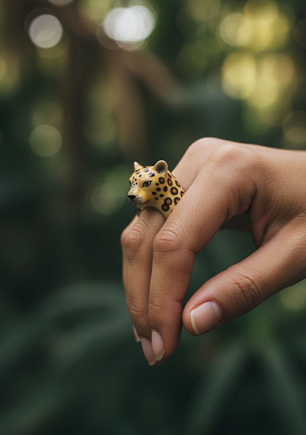 Фарфоровое кольцо в форме леопарда — маленькая скульптура, созданная для руки. Каждая деталь — от плавного изгиба морды до россыпи пятен — выполнена и расписана вручную, поэтому каждое изделие уникально. Гладкая фарфоровая поверхность приятно охлаждает кожу, создавая особое тактильное ощущение.