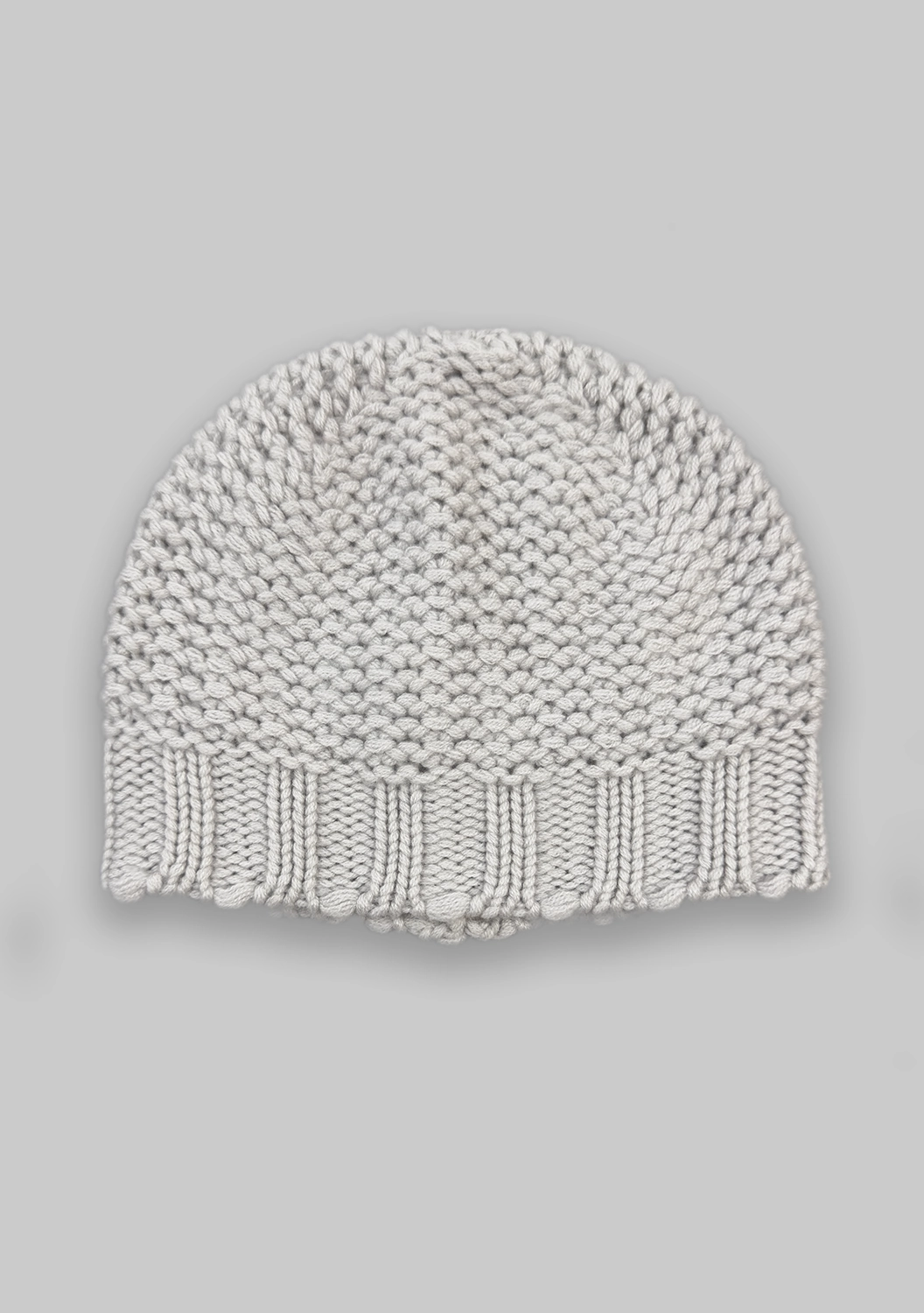 Эластичная нижняя часть аккуратно охватывает голову, не сдавливая, а крупные петли создают выразительный ручной характер изделия.