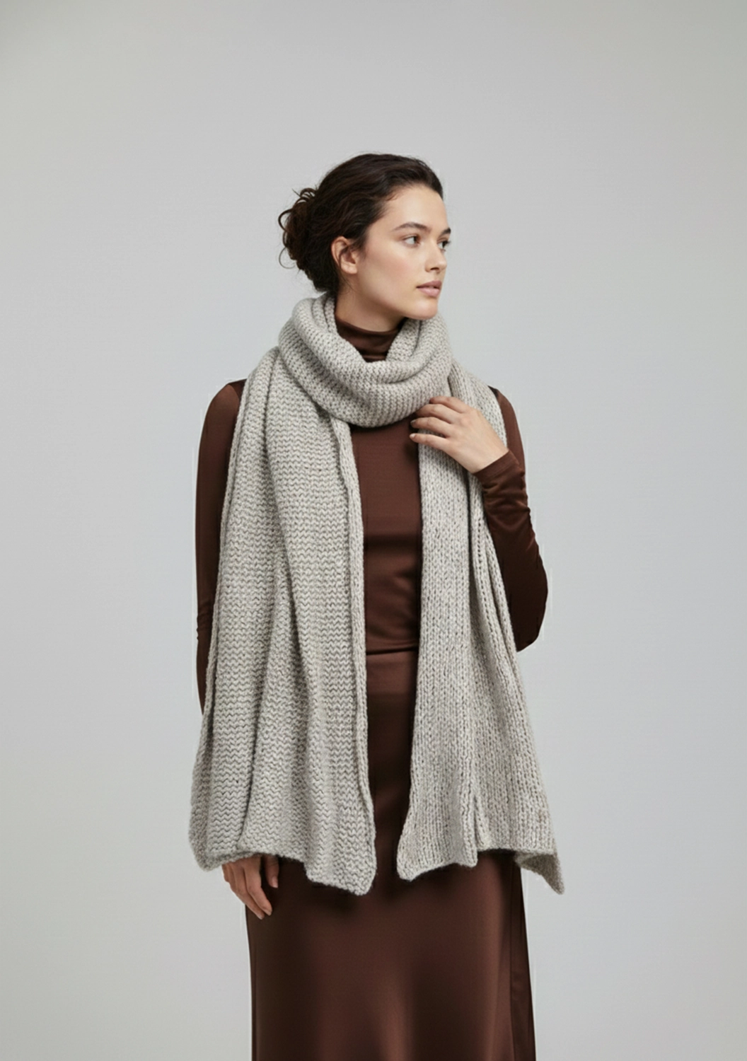 Он красиво драпируется, мягко обволакивает и создаёт уют сразу, как только касается кожи. Настоящий кашемир, который раскрывает свою ценность через ощущения: лёгкость, нежность и спокойную роскошь в каждом движении.