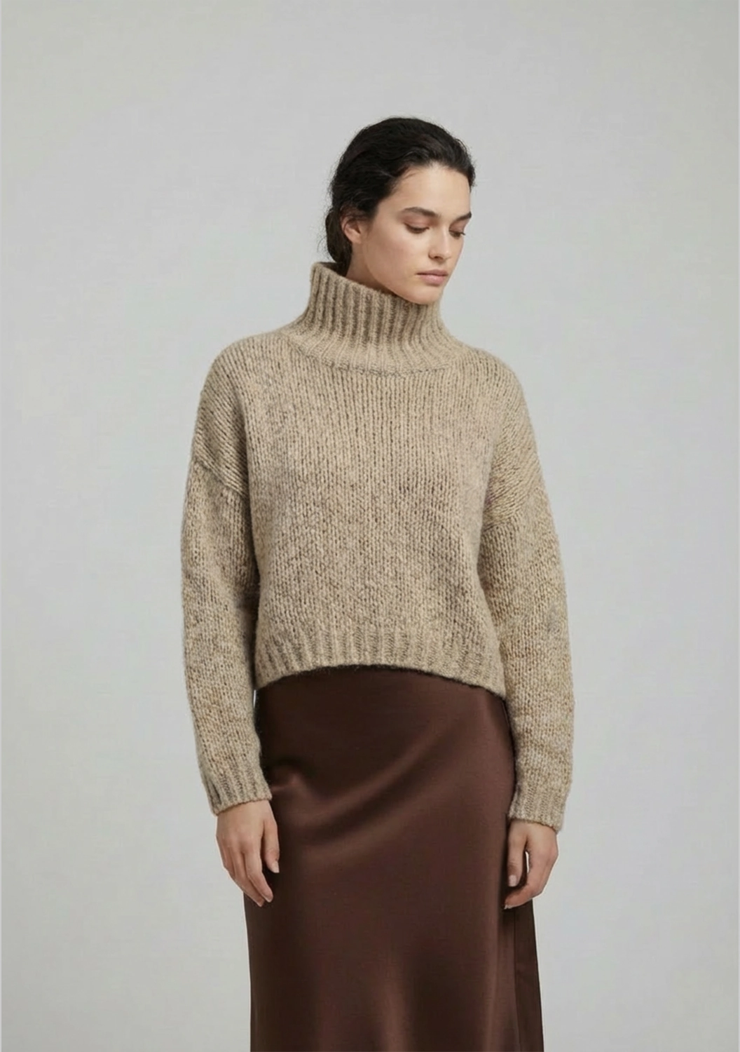 Укороченный силуэт и высокий ворот с мягкой эластичной резинкой подчёркивают нежность вязки и создают выразительную линию без лишних деталей. Джемпер свободно струится, легко подстраивается под движение и дарит то самое приятное ощущение тактильной роскоши, ради которого выбирают премиальные материалы.