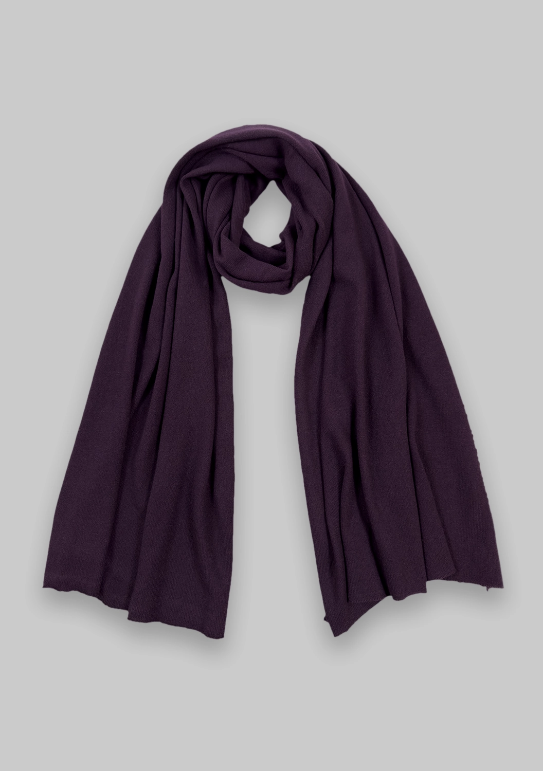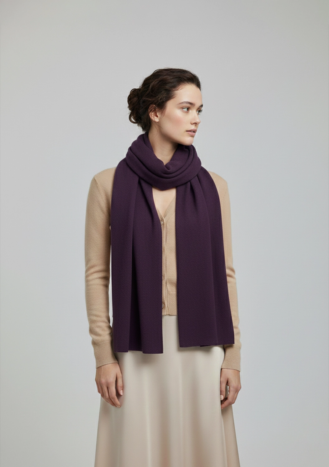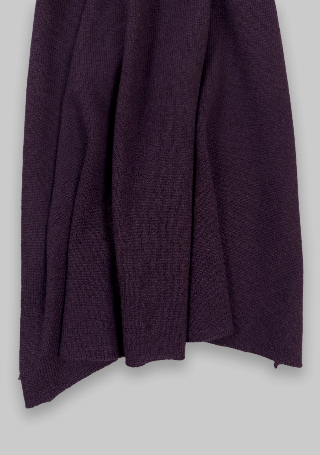 Его мягкая, почти воздушная текстура струится в руках, создавая то самое ощущение нежного прикосновения, ради которого выбирают настоящий кашемир. Глубокий сливовый оттенок выглядит благородно и подчёркивает чистоту линии — без лишних деталей, только роскошная ткань и идеальная посадка.