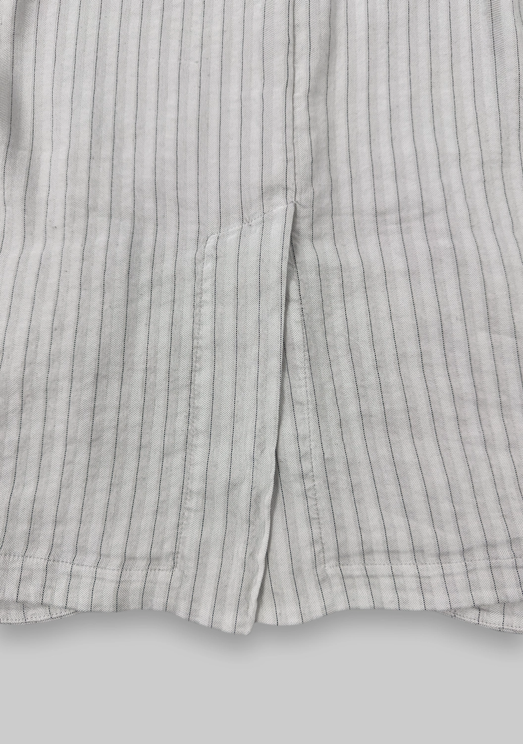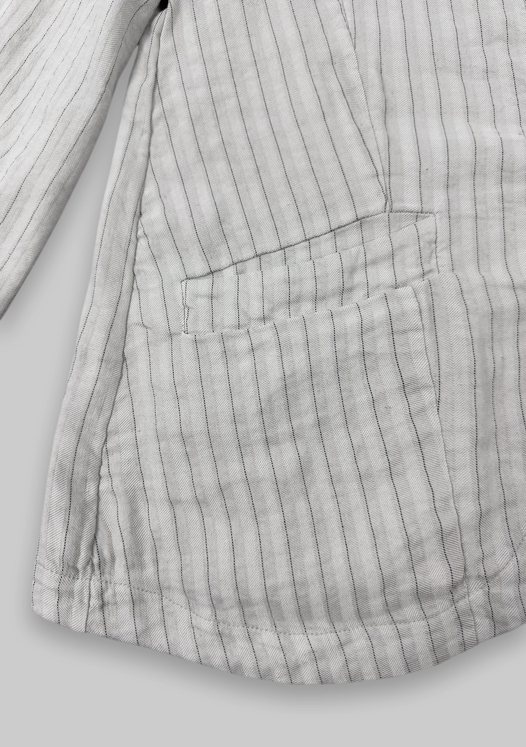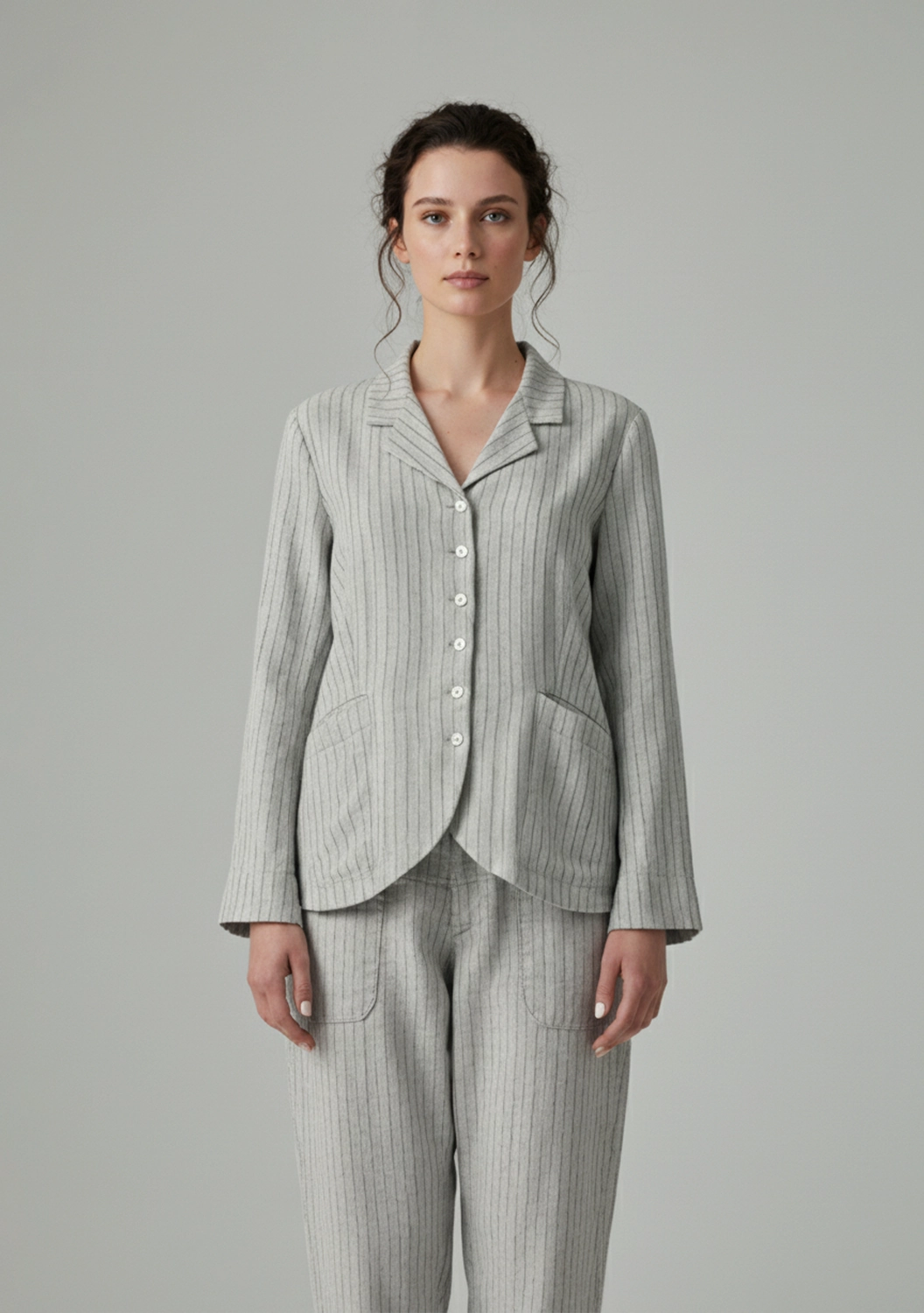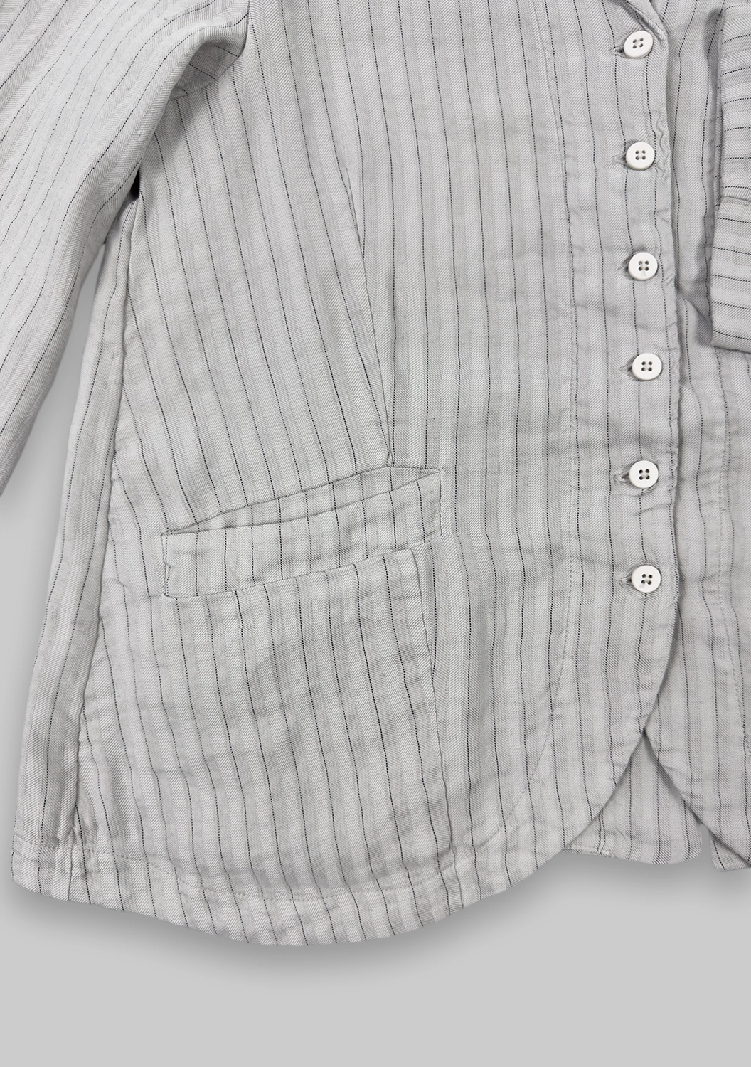 Жакет из микса льна и вискозы с добавлением стрейча сочетает лёгкость ткани и выразительный силуэт. Расклёшенная форма создаёт динамику и подчёркивает талию, а тонкая полоска визуально вытягивает линию. Лацканы и широкие карманы добавляют классический акцент, перекрывающийся разрез сзади открывает свободу движений. Финишная окраска придаёт ткани насыщенность оттенка и уникальную фактуру.
