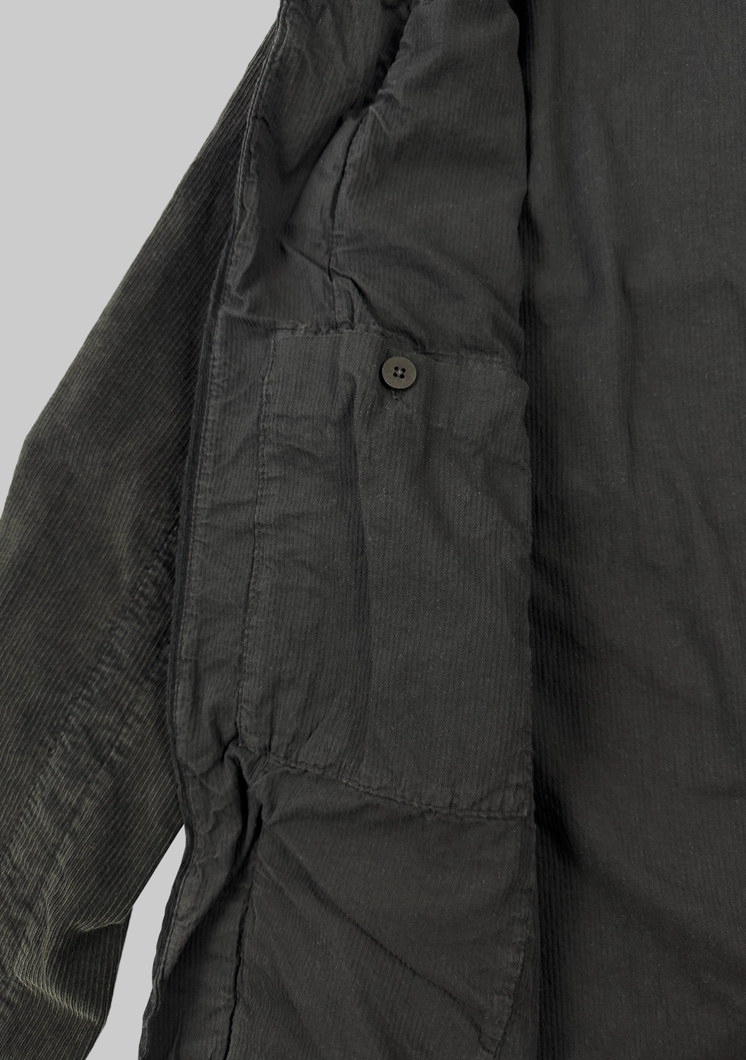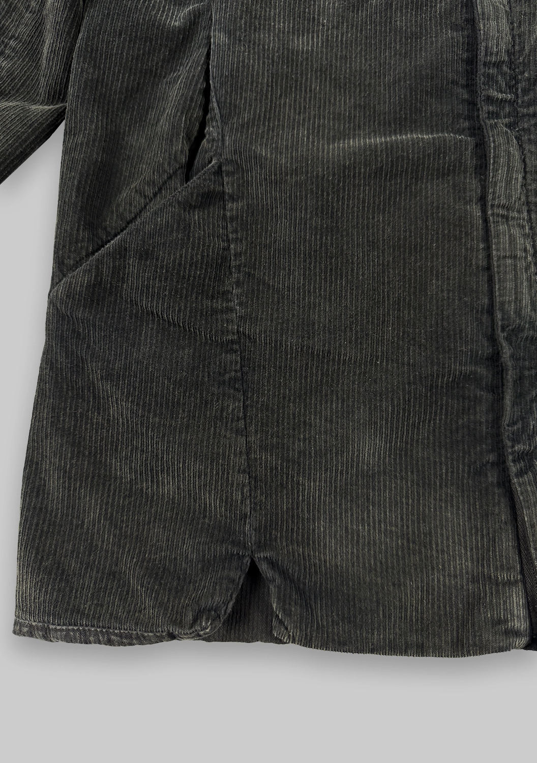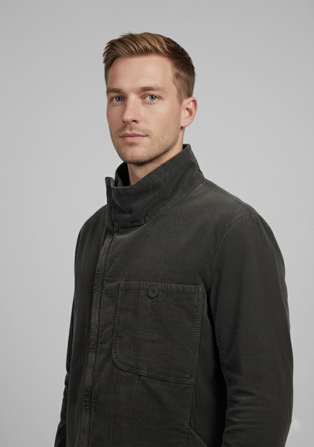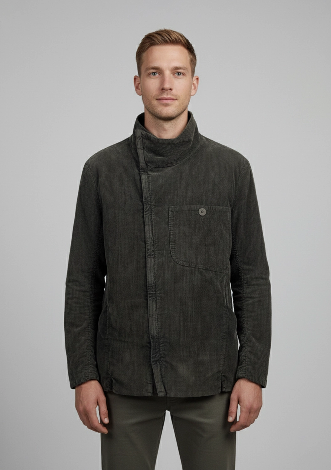 Мягкий вельвет с тонким рубчиком создаёт уютную бархатистую текстуру, которую хочется ощущать каждый раз, когда застёгиваешь молнию. Асимметричная застёжка и высокий воротник придают изделию характер — спокойный, но уверенный.