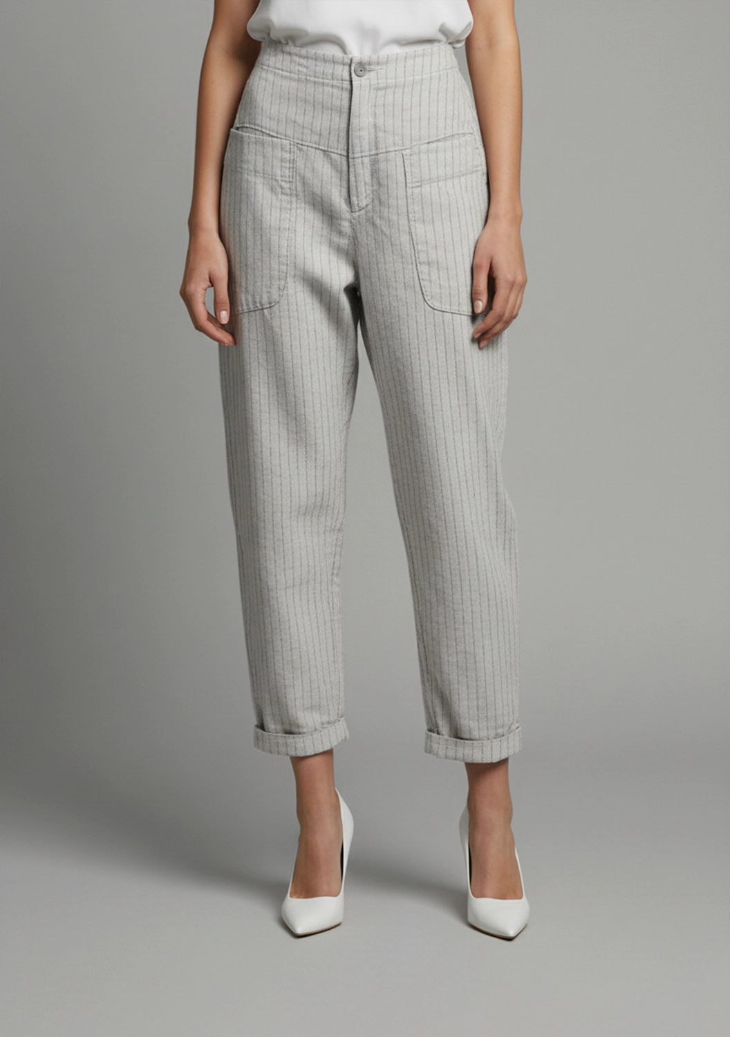 Брюки из микса льна и вискозы с добавлением стрейча мягко облегают, сохраняя свободу движений. Лёгкая полоска визуально вытягивает силуэт, высокая посадка подчёркивает талию, а накладные карманы создают акцент на линии бёдер. Небольшие отвороты добавляют непринуждённости, а финальная окраска придаёт ткани глубокий, живой оттенок.