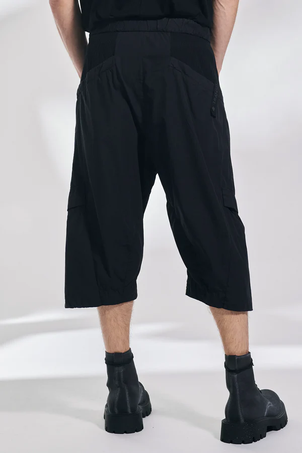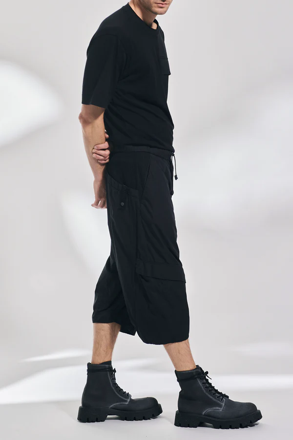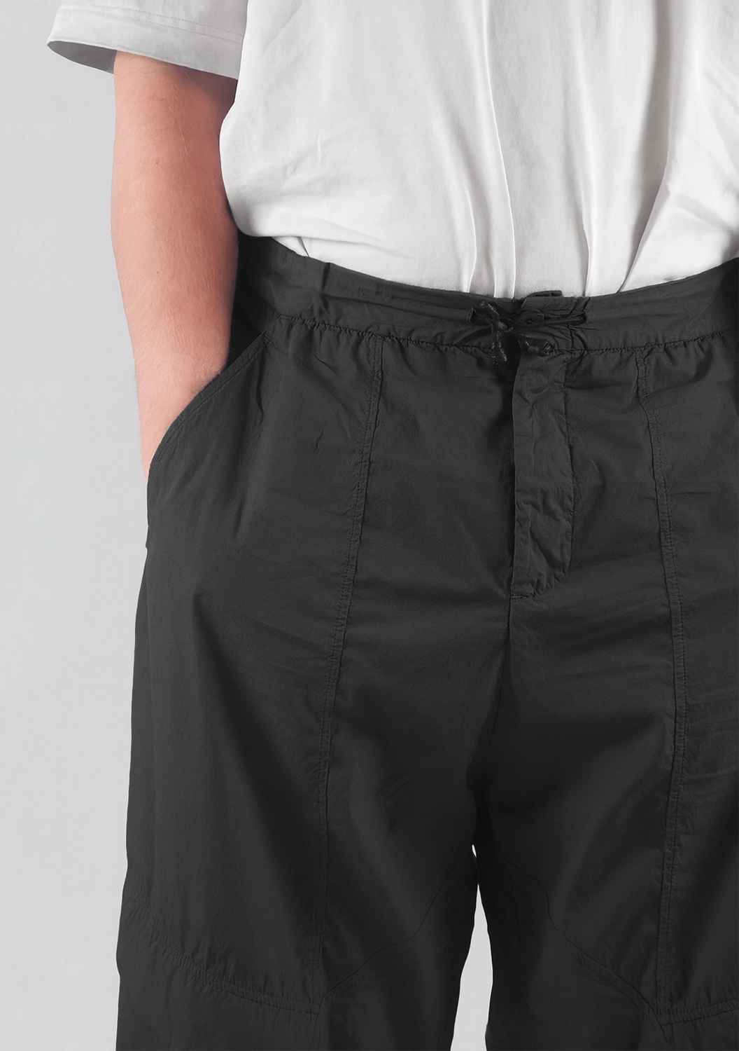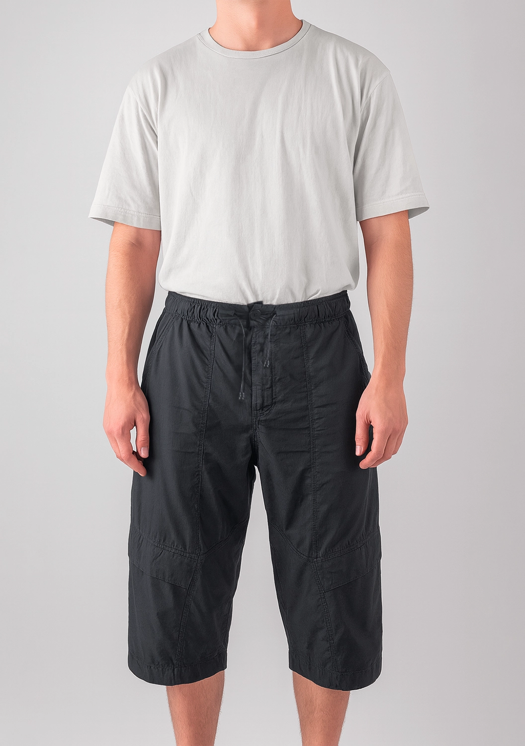 Укороченные брюки-карго оверсайз из хлопковой парашютной ткани — идеальный выбор для тех, кто ищет баланс между комфортом и модным дизайном. Оверсайз крой с контрастными вставками создает современный образ, а эластичный пояс с вощеным шнурком и имитацией застежки на пуговицы обеспечивает удобство. Косые передние карманы, боковые карманы с клапанами и задние карманы добавляют функциональности.