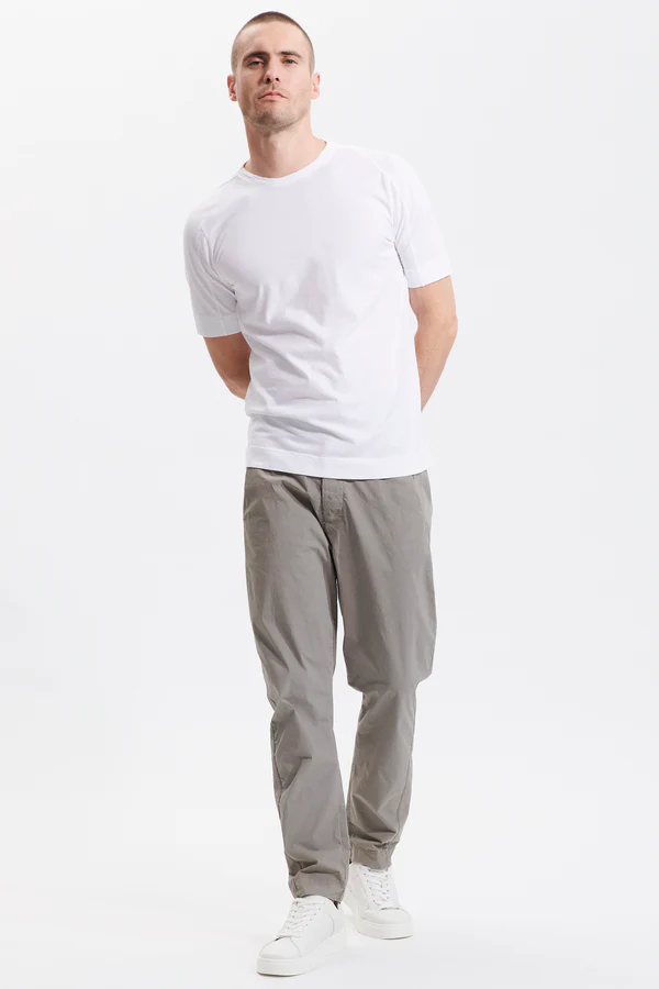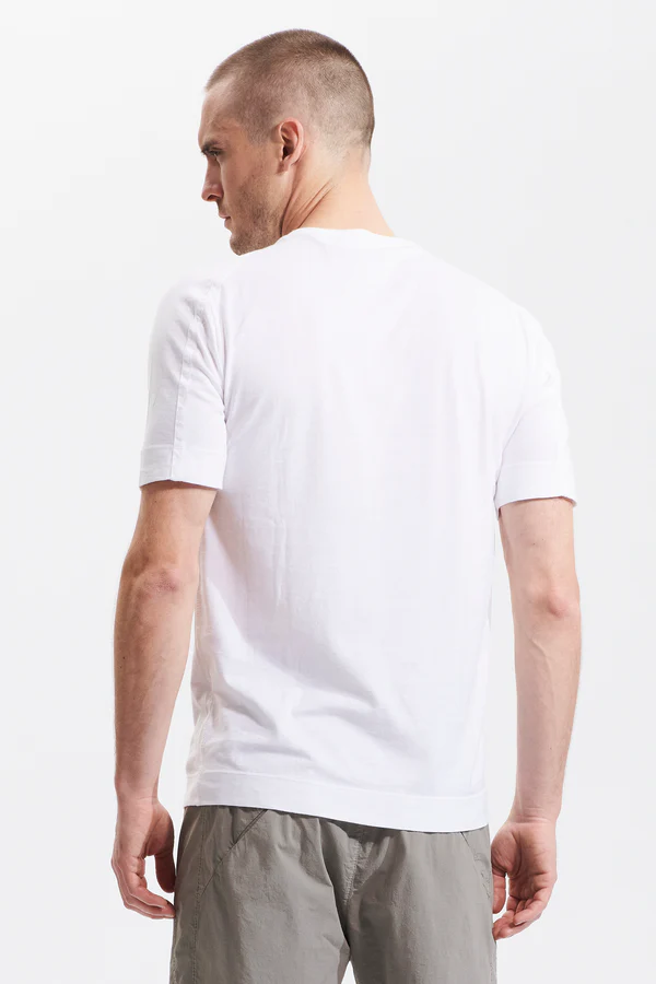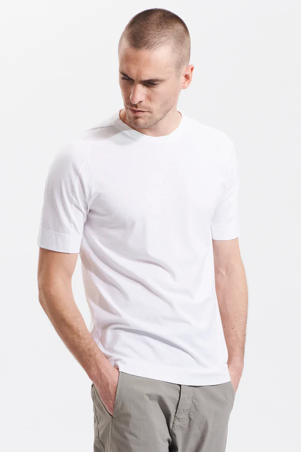 Футболка из мягкого хлопкового трикотажа с круглым вырезом сочетает классический стиль и продуманные детали. Вязаная хлопковая отделка воротника с изысканной льняной вставкой на спине и прострочка на задней части плеч добавляют утонченности. Идеальный выбор для комфортных и стильных повседневных образов.