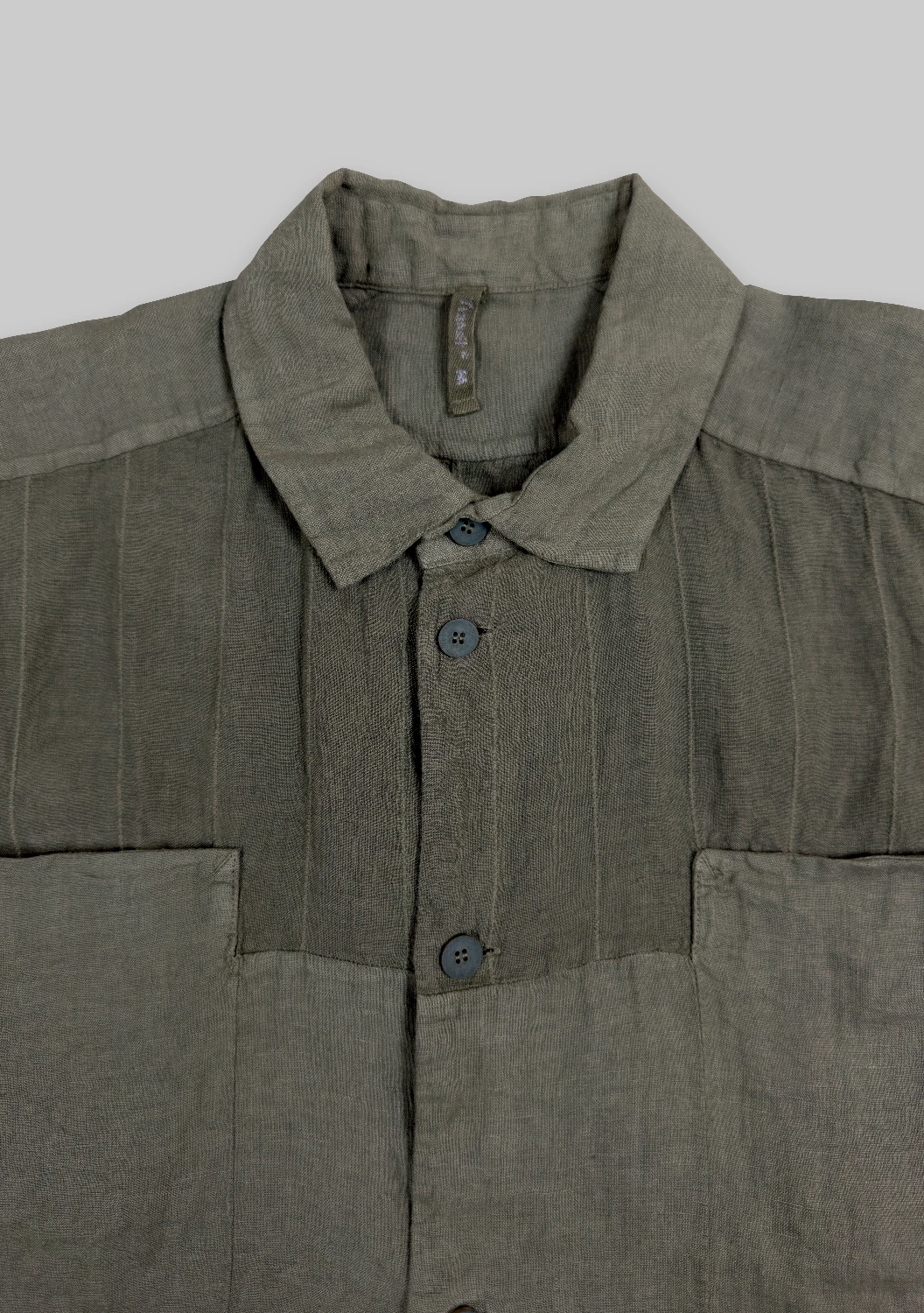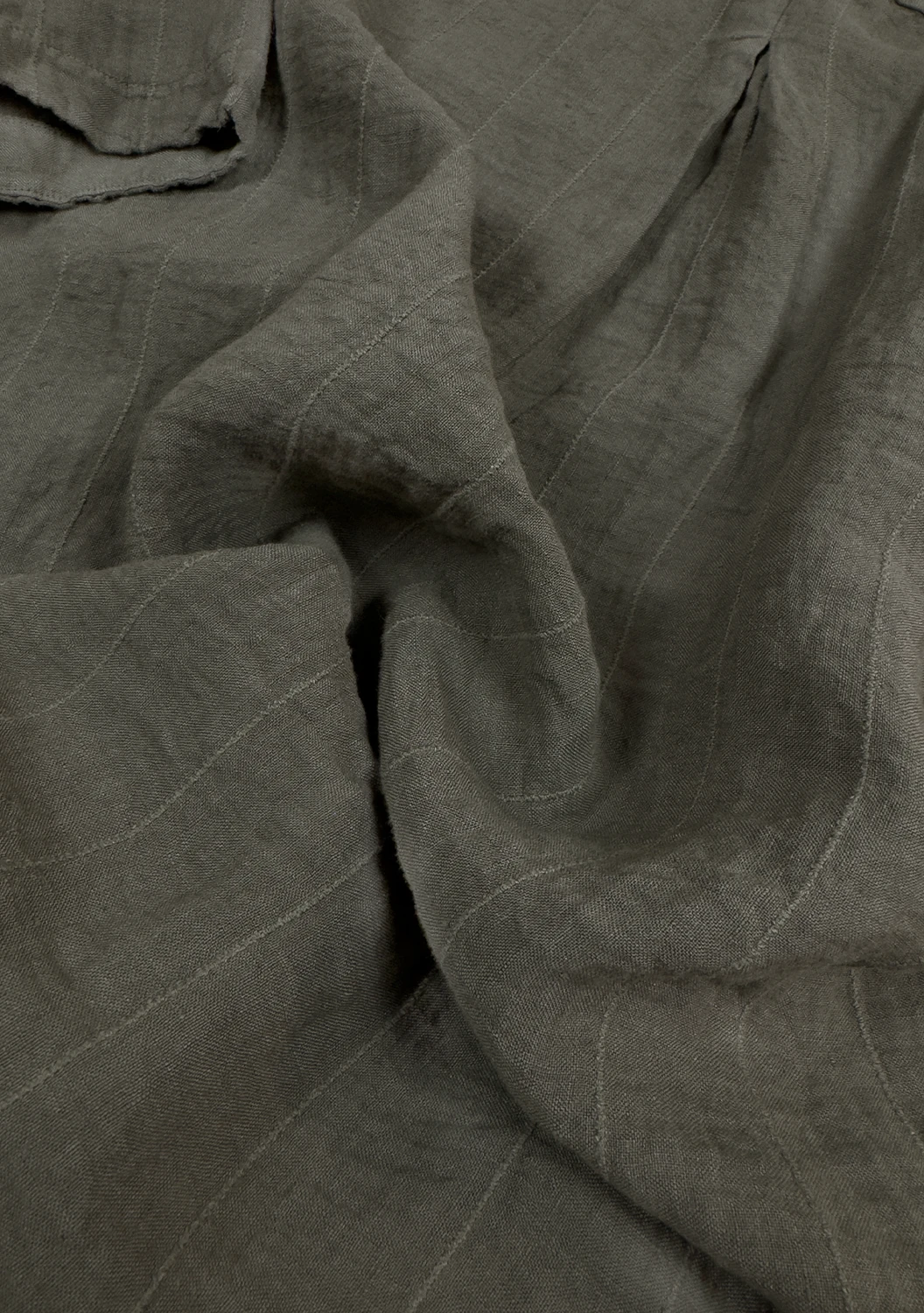 Рубашка из льна — это пример дизайнерского баланса между фактурностью и свободой. Верхняя часть изделия выполнена из ткани с рельефными вертикальными полосами, которые создают интересный визуальный контраст и подчёркивают архитектурность кроя. Нижняя часть — гладкий лен с лёгким блеском и естественной текстурой.