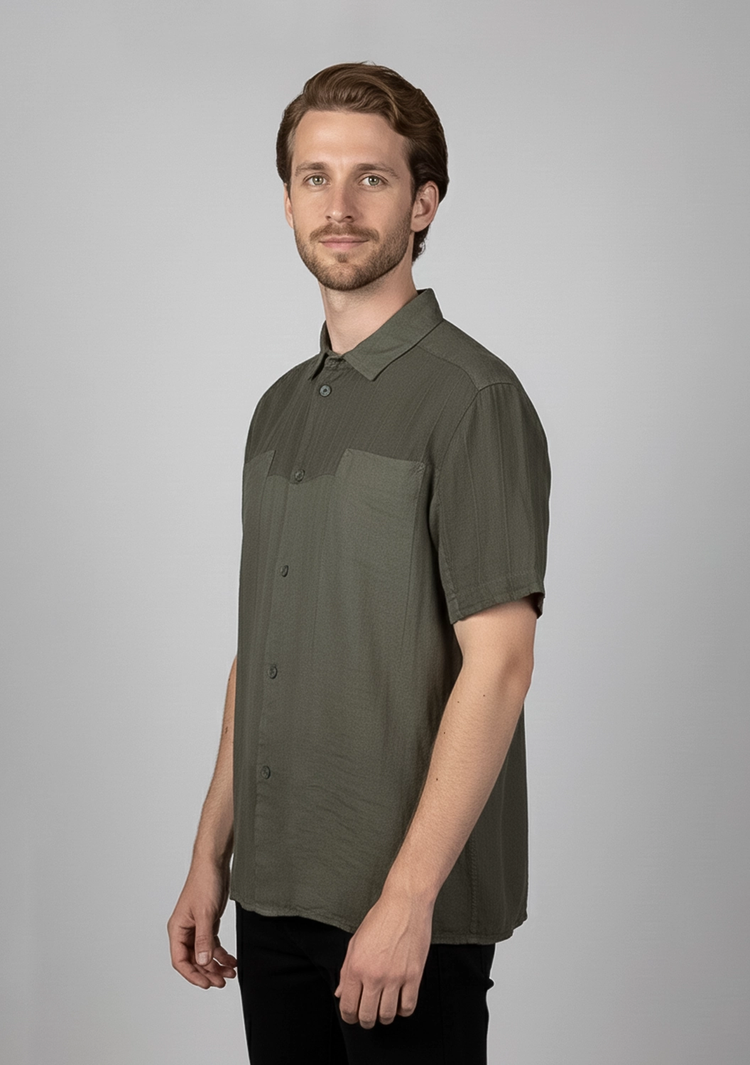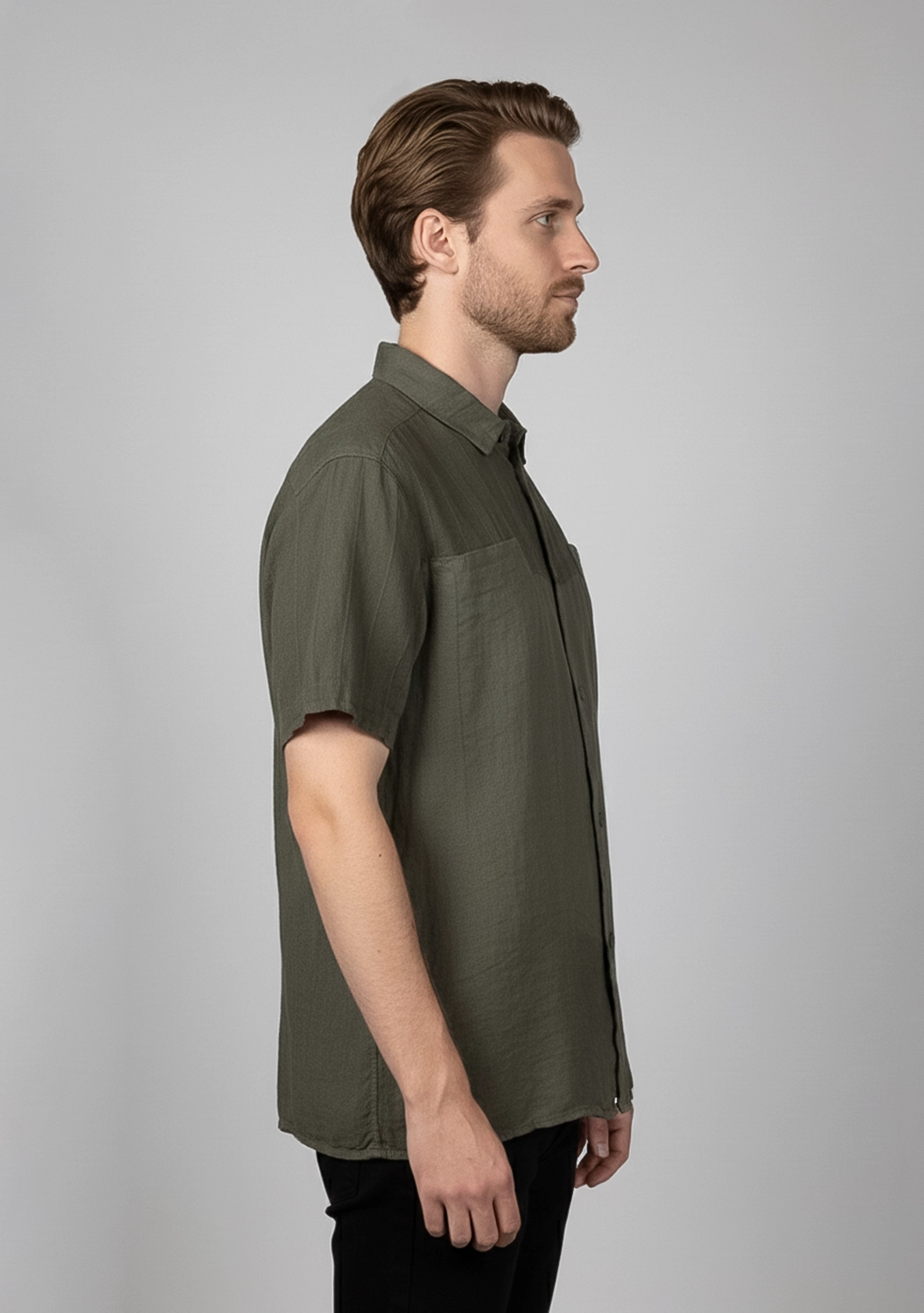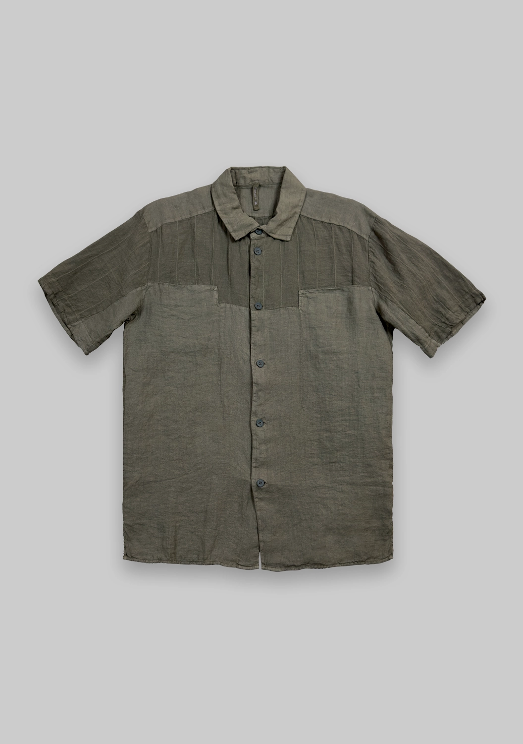 Модель отличается расслабленным силуэтом, аккуратным воротником и крупными накладными карманами, будто вшитыми в конструкцию. Материал приятно охлаждает кожу и дышит, даря ощущение свежести даже в жару. Эта рубашка создана для тех, кто ценит уникальность, тактильный комфорт и спокойную эстетику.