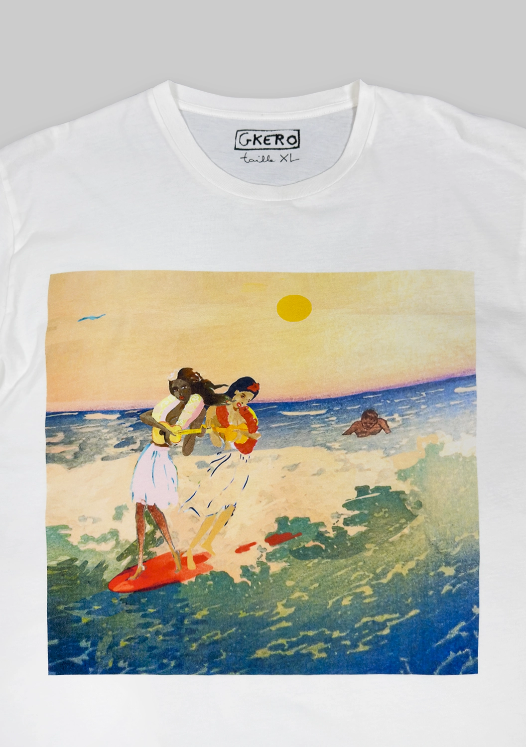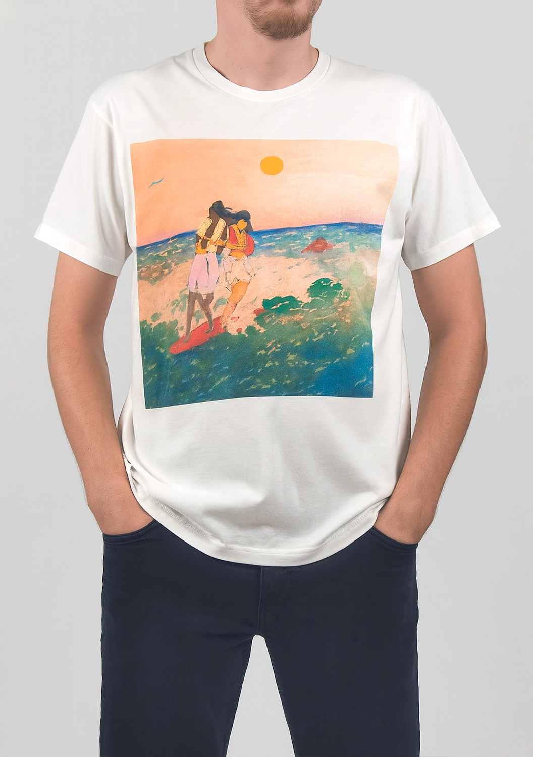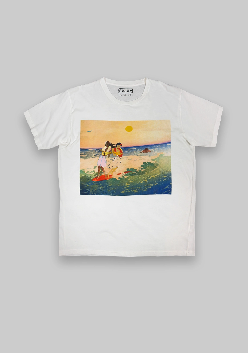 Футболка Sunset от G.Kero из мягкого хлопка с авторским рисунком переносит на берег океана. На белом фоне — картина с закатом и серфингистами, которая выглядит как настоящий арт-объект. Лёгкая ткань дарит комфорт и свободу движений, а яркий принт делает образ уникальным и запоминающимся.