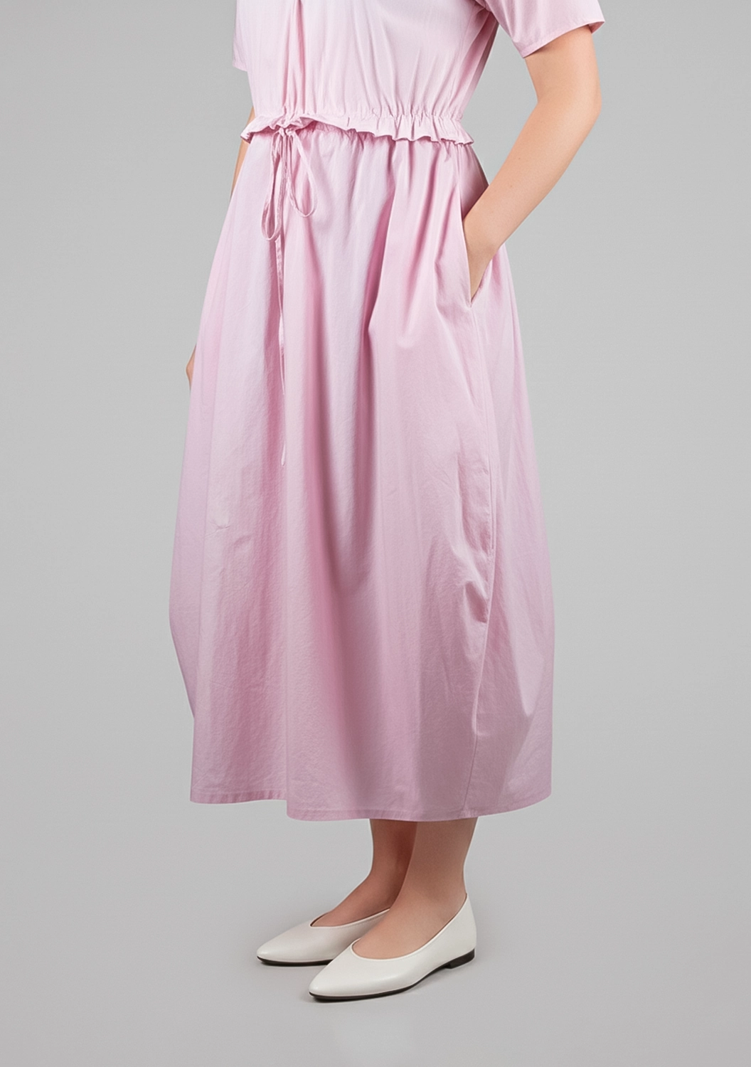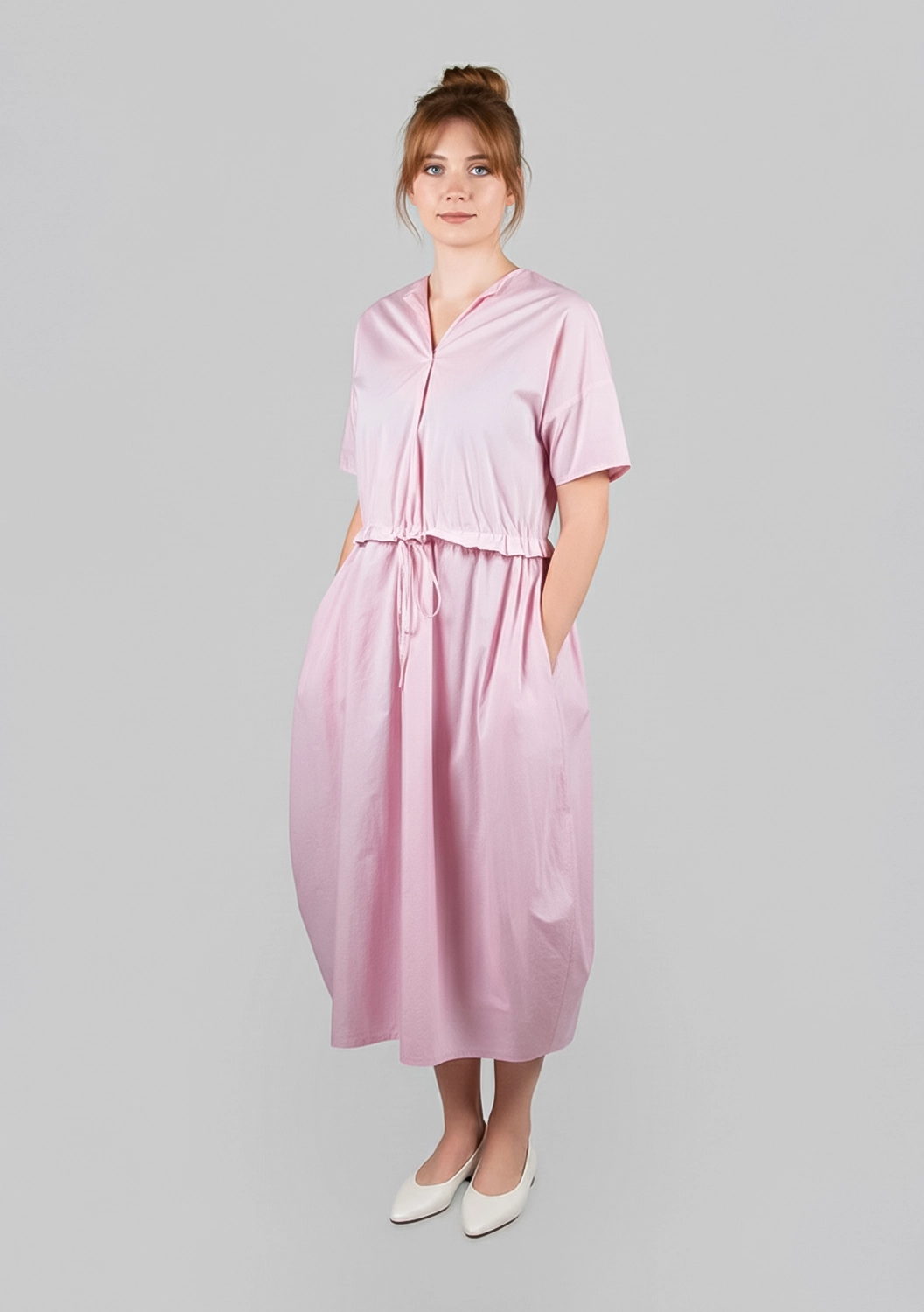 Воздушное платье MC WORK от Manuelle Guibal из тонкого хлопка окутывает легкостью и свежестью. Лаконичный V-образный вырез, мягкая драпировка и утягивающий пояс на талии создают непринужденный силуэт. Светлый оттенок придает образу деликатную мягкость, а шелковистая поверхность ткани радует тактильно. Идеальный вариант для тех, кто ценит комфорт в движении и естественную элегантность.