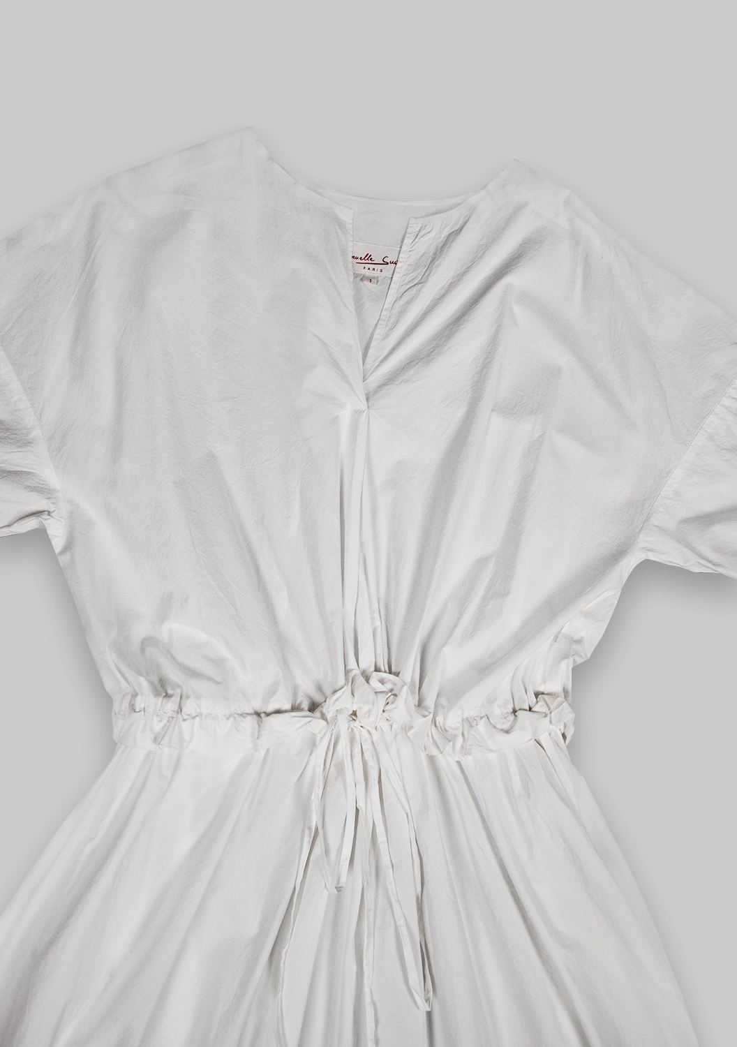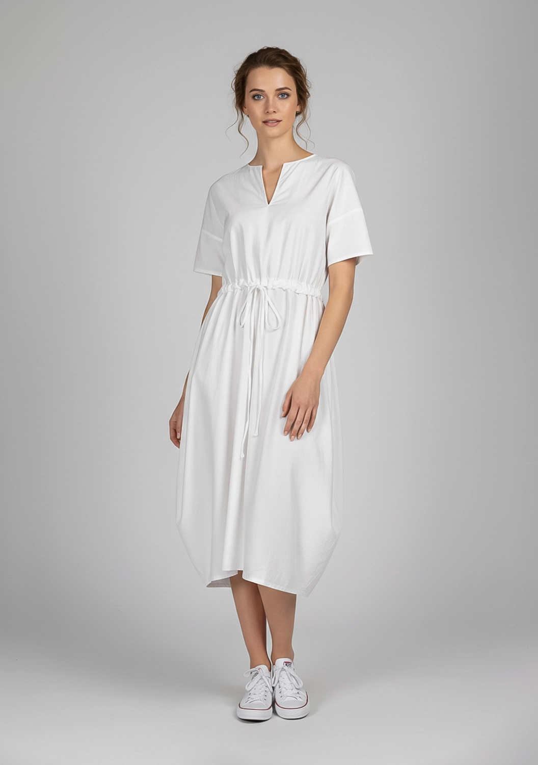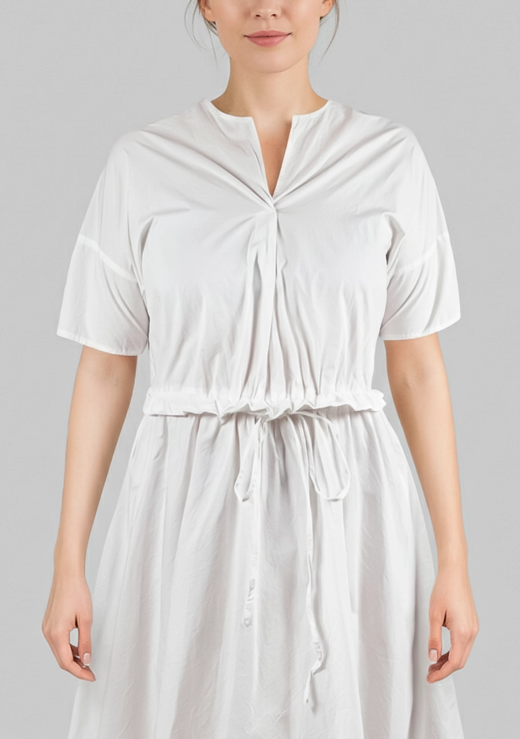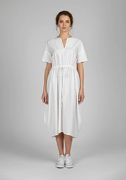 Воздушное платье MC WORK от Manuelle Guibal из тонкого хлопка окутывает легкостью и свежестью. Лаконичный V-образный вырез, мягкая драпировка и утягивающий пояс на талии создают непринужденный силуэт. Светлый оттенок придает образу деликатную мягкость, а шелковистая поверхность ткани радует тактильно. Идеальный вариант для тех, кто ценит комфорт в движении и естественную элегантность.