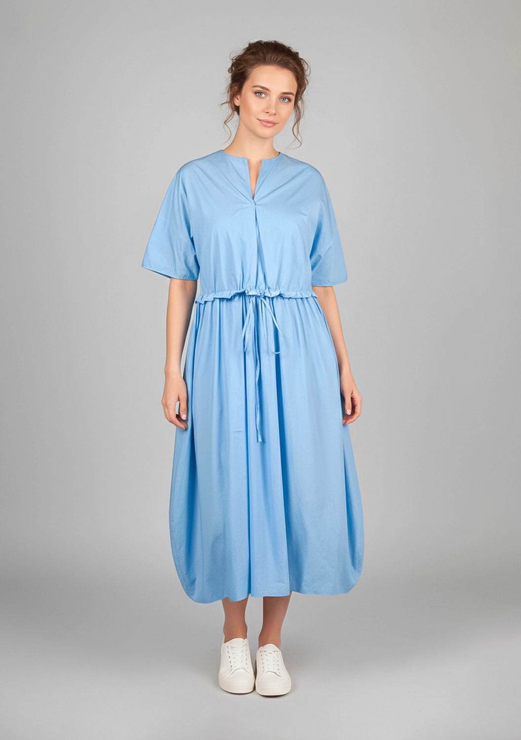 Воздушное платье MC WORK от Manuelle Guibal из тонкого хлопка окутывает легкостью и свежестью. Лаконичный V-образный вырез, мягкая драпировка и утягивающий пояс на талии создают непринужденный силуэт. Светлый оттенок придает образу деликатную мягкость, а шелковистая поверхность ткани радует тактильно. Идеальный вариант для тех, кто ценит комфорт в движении и естественную элегантность.
