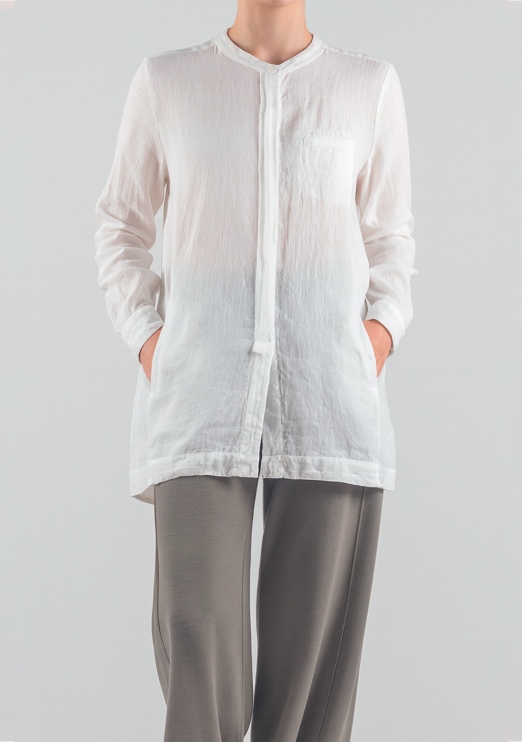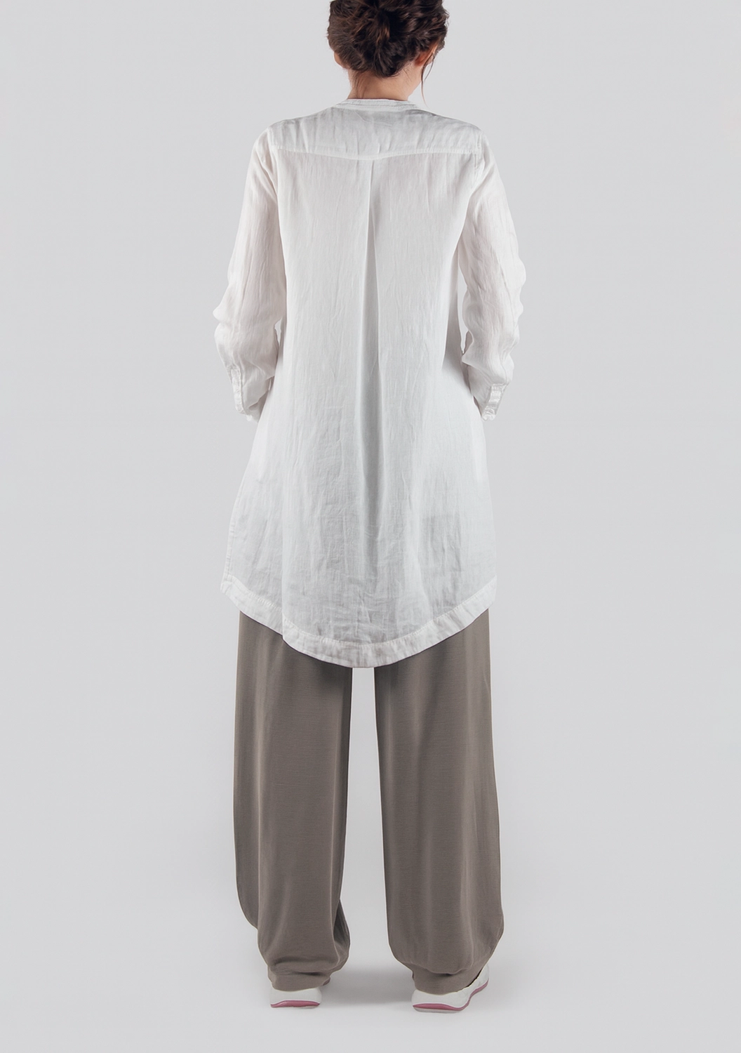 Длинная блуза из легкого льна сочетает утонченный стиль и комфорт. Отложной воротник, планка из вискозного жоржета с потайными пуговицами и нагрудный карман создают изысканный дизайн. Карманы в строченых вытачках и ряд пуговиц на манжетах добавляют практичности, а спинка с кокеткой и складкой — оригинальности. Идеальна для пляжного отдыха и прогулок в жаркие дни.