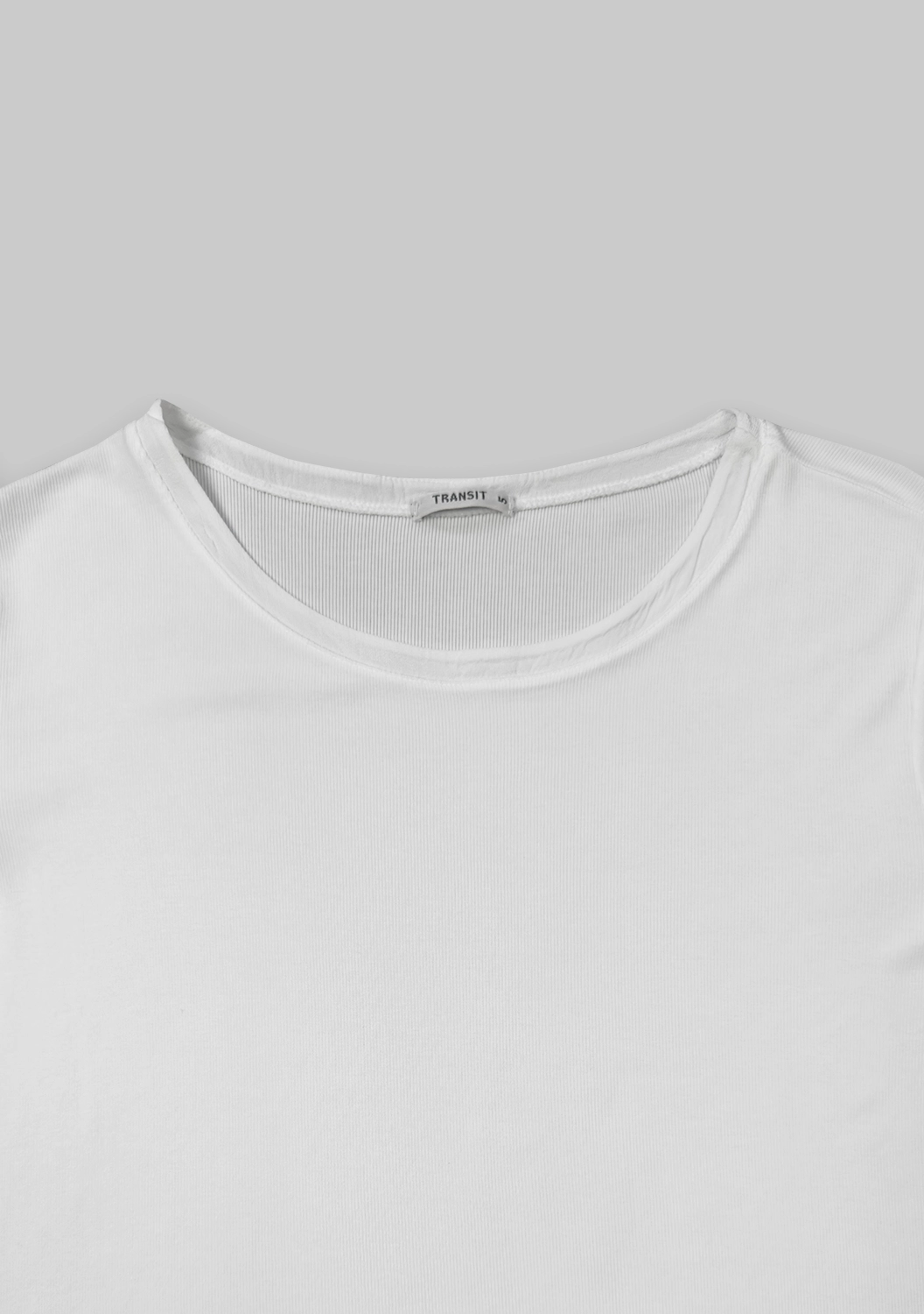 Футболка из легкого эластичного трикотажа с воротником из вискозного жоржета идеально подчеркивает фигуру. Окрашена после пошива для эксклюзивного оттенка.
