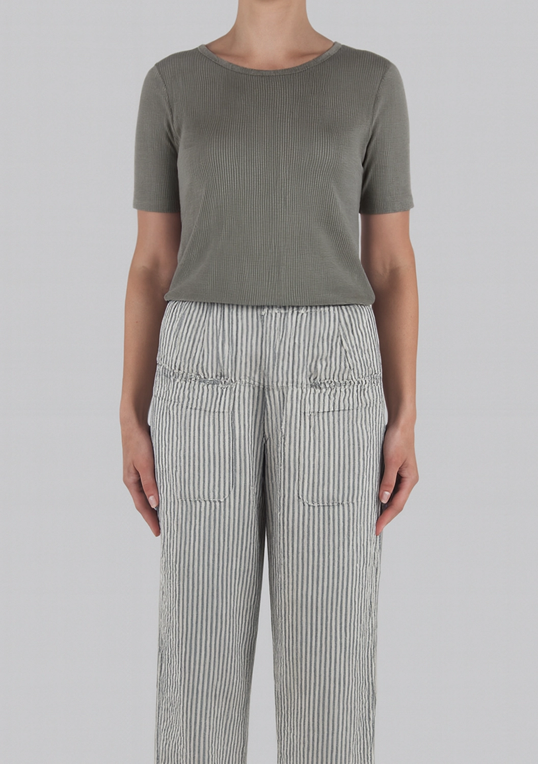 Футболка из легкого эластичного трикотажа с воротником из вискозного жоржета идеально подчеркивает фигуру. Окрашена после пошива для эксклюзивного оттенка.