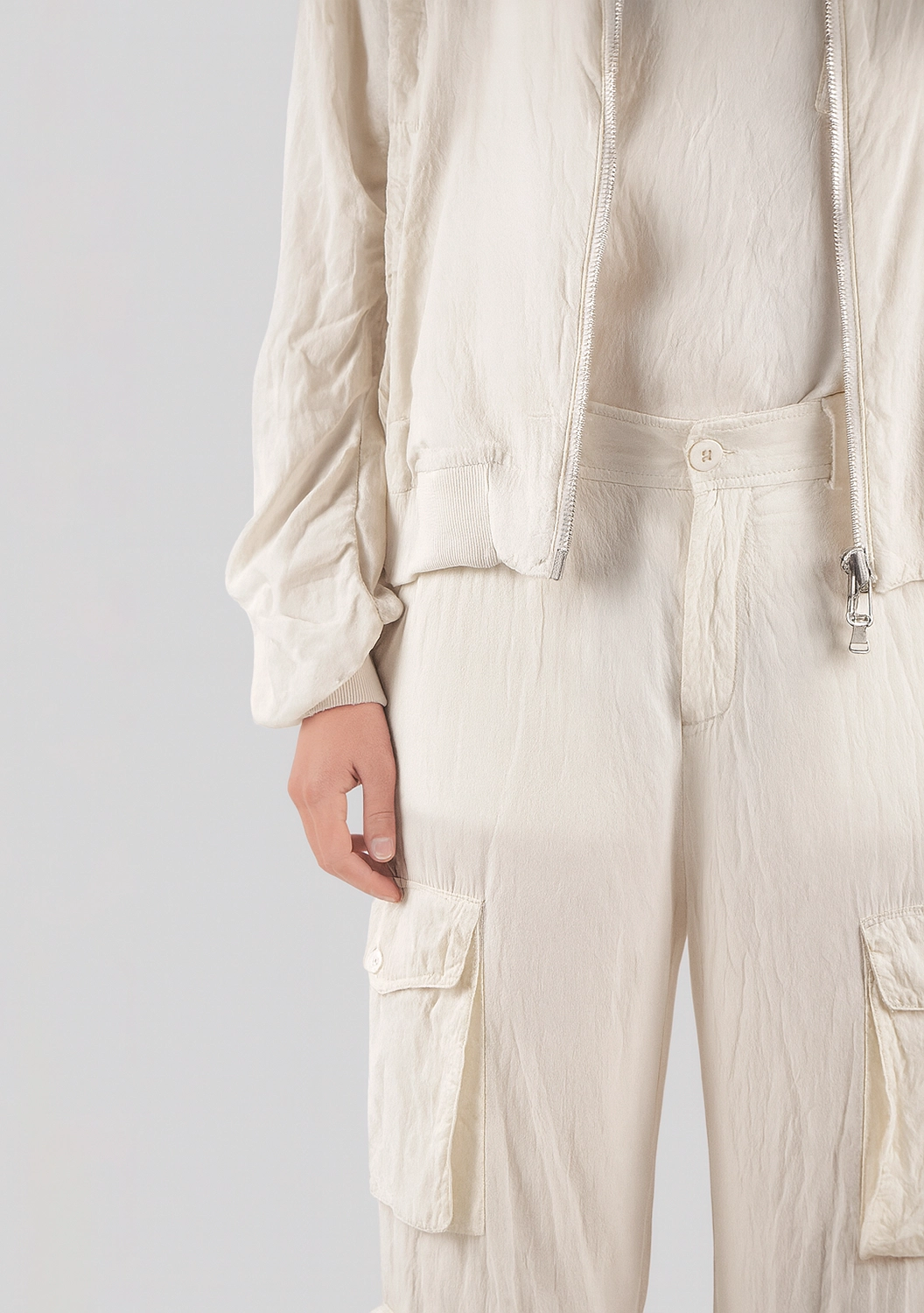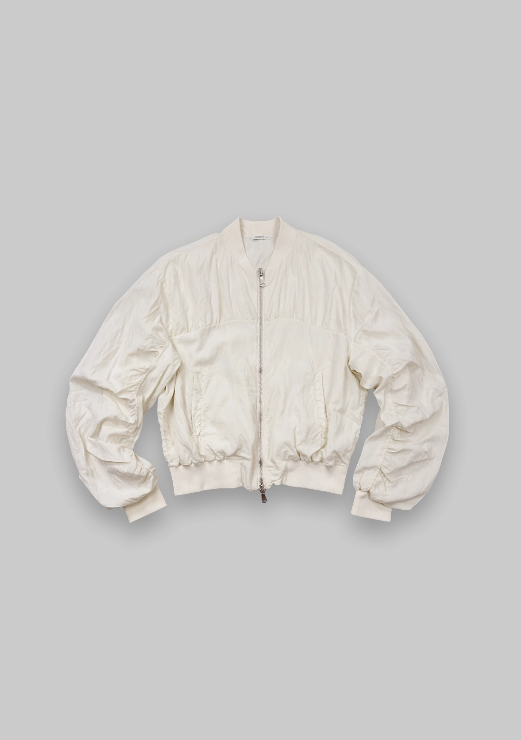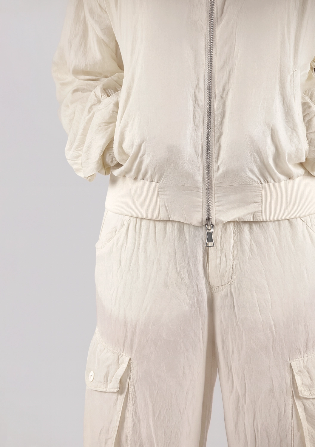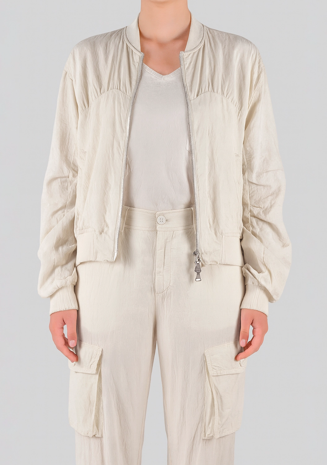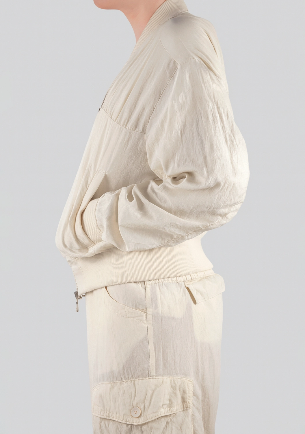 Укороченная куртка-бомбер из смеси шелка с резинкой на воротнике, манжетах и подоле идеальна для прохладных дней. Вырезы на рукавах, сборка на кокетке и диагональные карманы с обтачкой добавляют оригинальности. Застежка на молнию и окрашивание после пошива завершают современный дизайн.