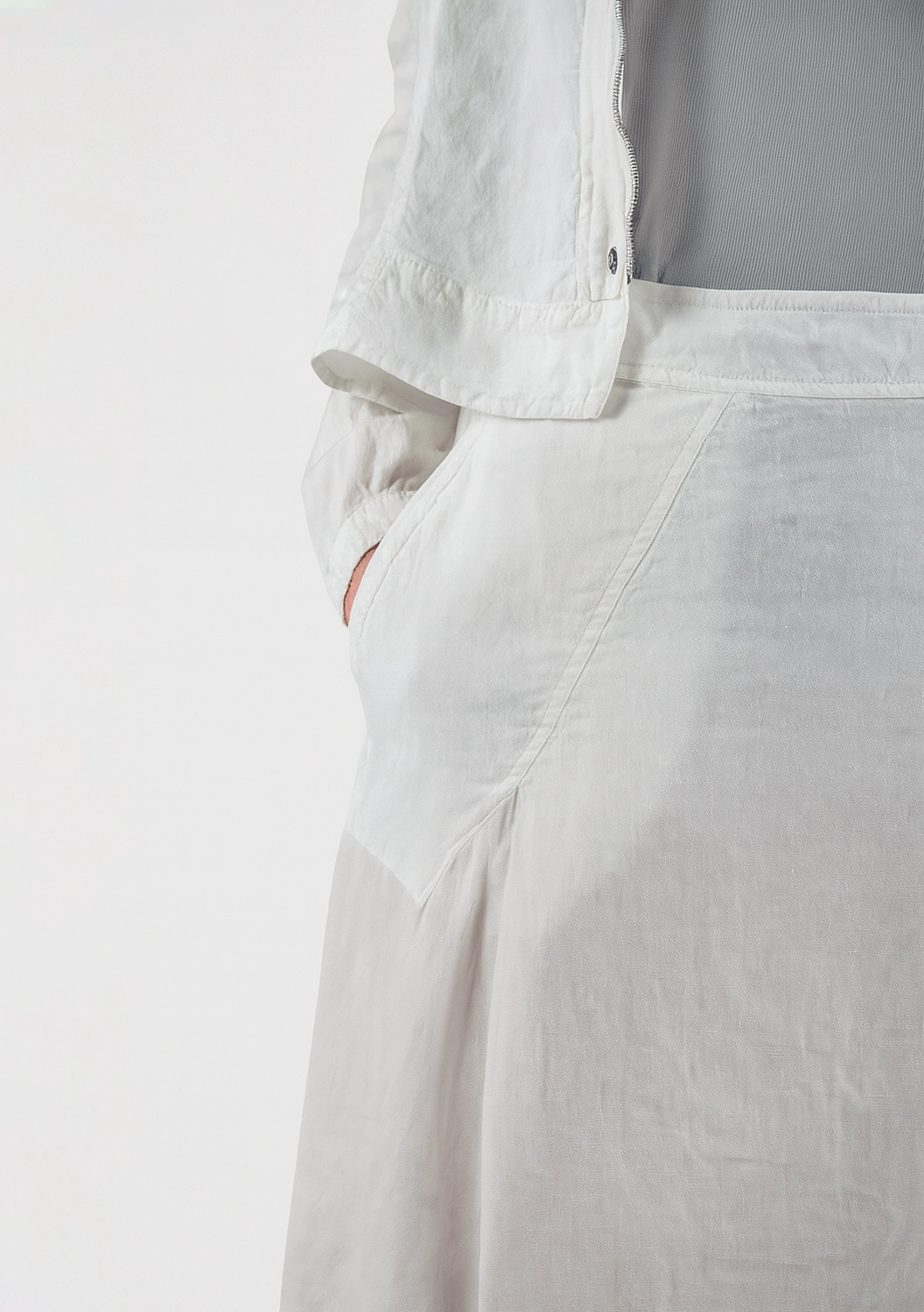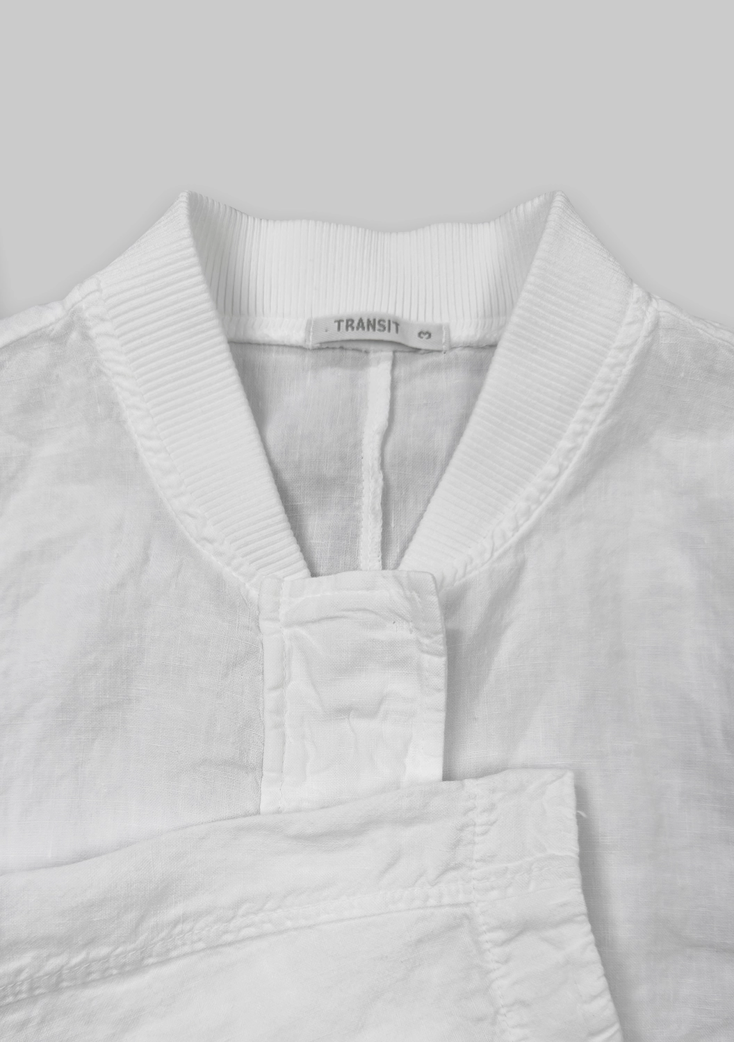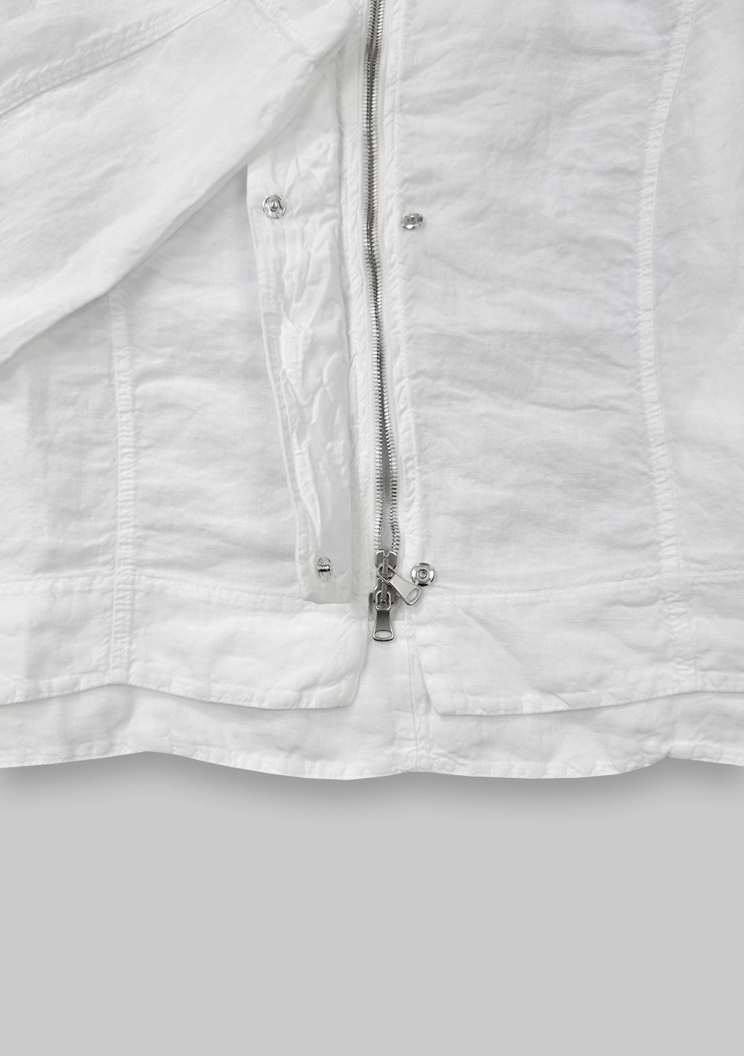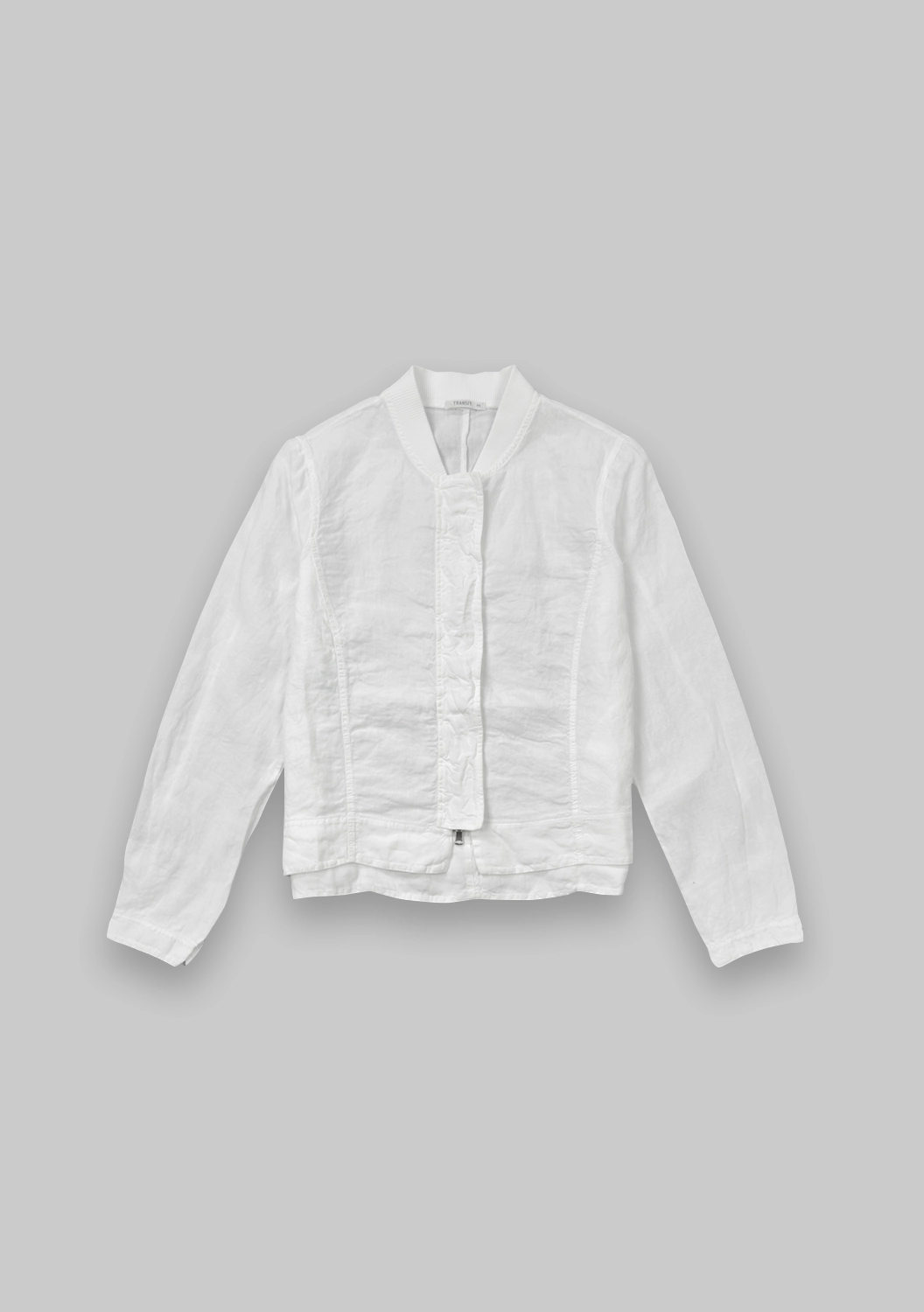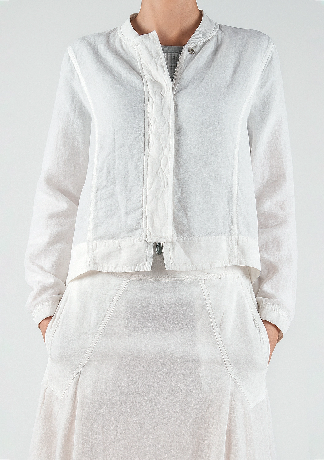 Льняная куртка с вязаным воротником и передней молнией, закрытой планкой с тремя кнопками, идеально сочетает стиль и комфорт. Боковые карманы в швах и небольшие вентиляционные разрезы на подоле добавляют практичности.