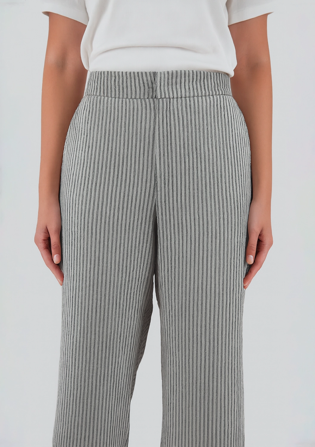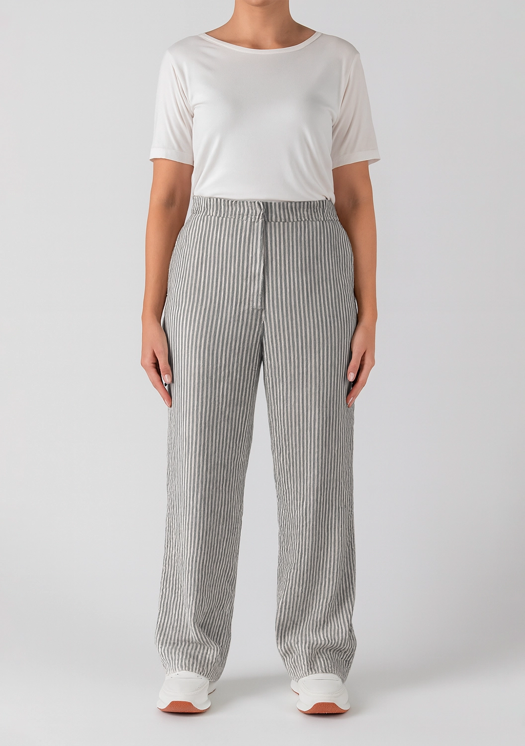 Брюки с рельефной текстурой и полосатым узором, а также с эластичной вставкой на поясе идеально сочетают шик и комфорт.
