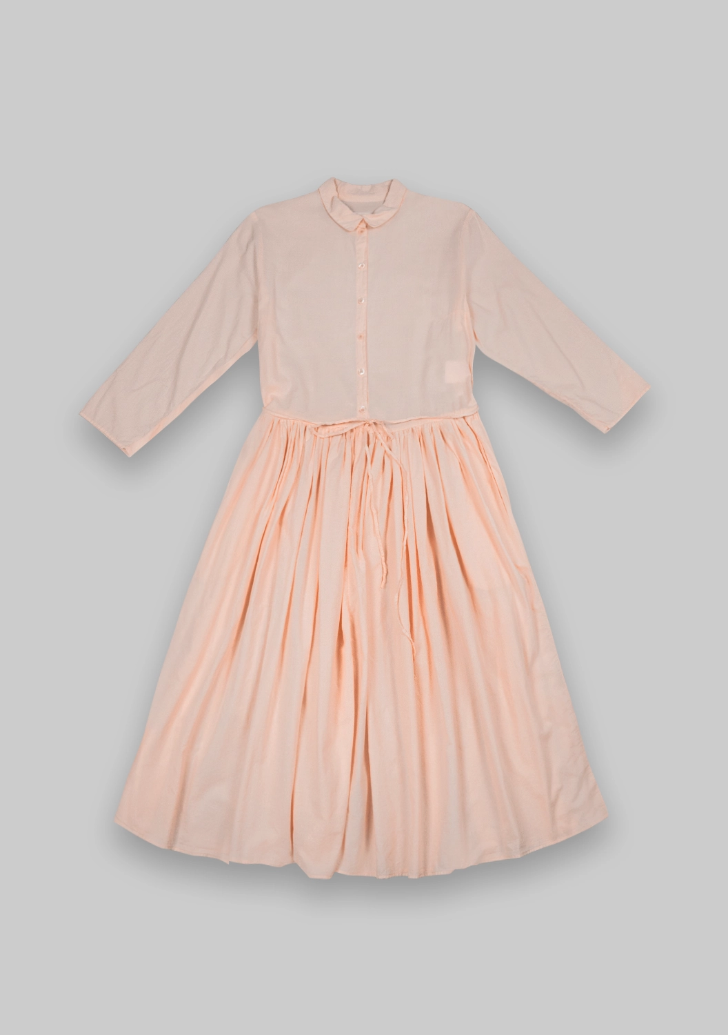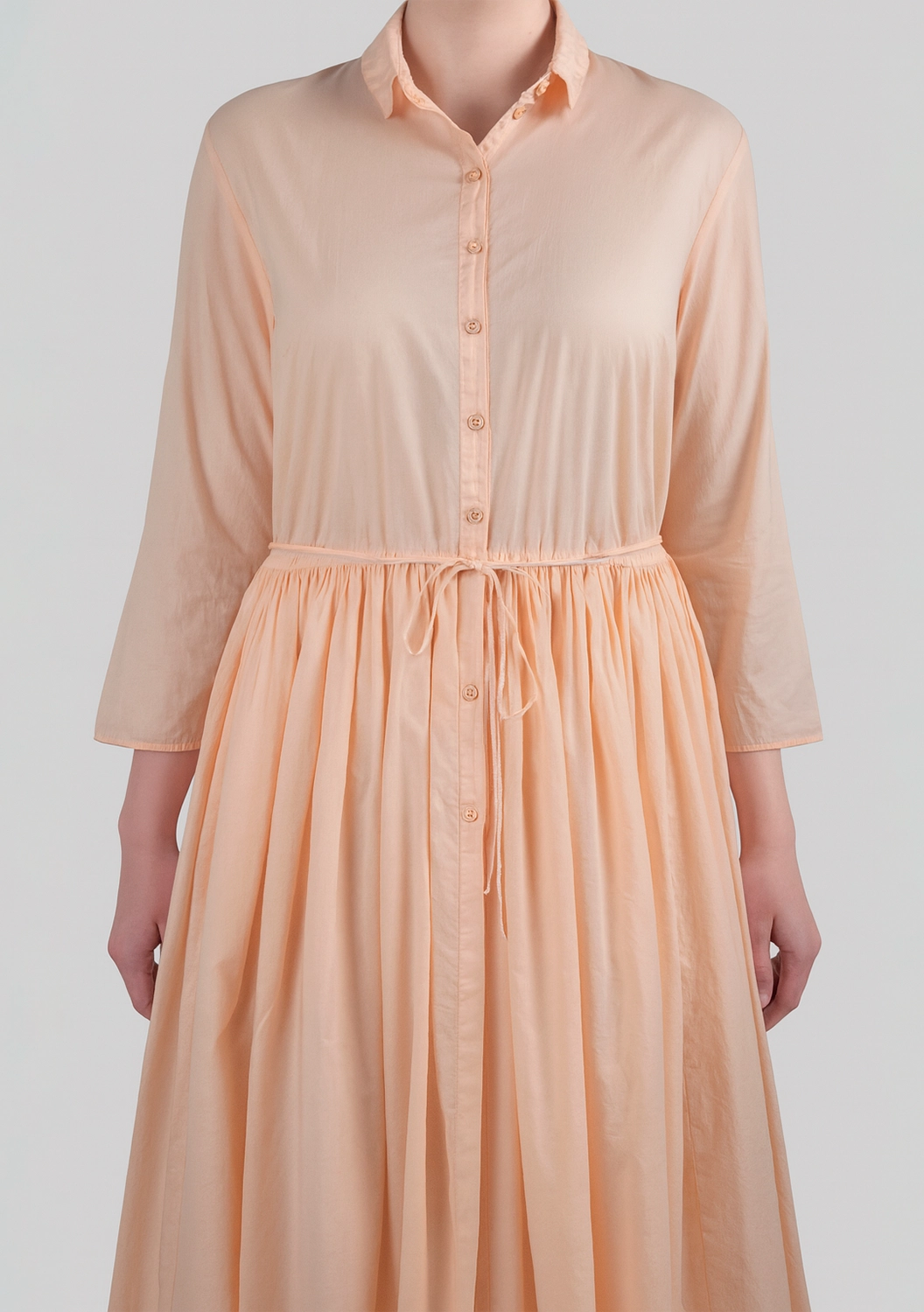 Платье-рубашка DELI из 100% хлопка в нежном оттенке. Модель с отложным воротником, планкой на пуговицах и удобными втачными карманами в боковых швах. Линия талии акцентирована тонким регулируемым поясом на кулиске, создающим мягкую сборку и женственный силуэт. Рукава 3/4 придают образу лёгкость, а свободный расклёшенный низ обеспечивает комфорт в движении. Идеально для повседневных и летних образов.