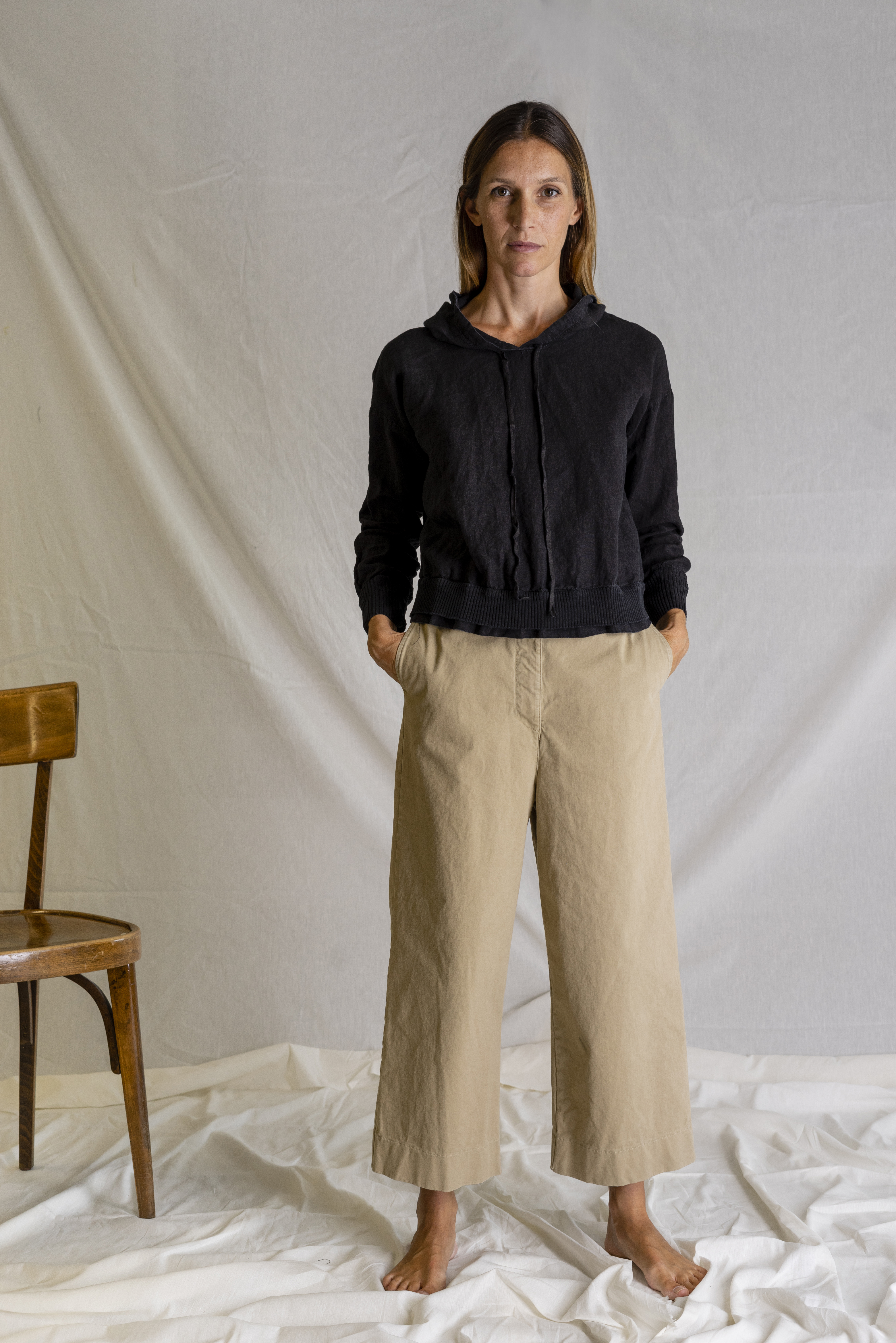 Свободные хлопковые брюки с застежкой на пуговицы, дополнены двумя два боковыми карманами и двумя накладными карманами сзади.