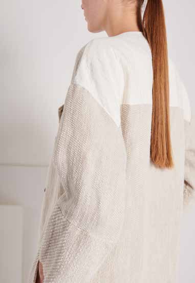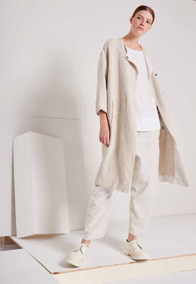Итальянская марка Transit осуществляет полный процесс производства изделий и является семейным бизнесом. Высококачественное сырье, невычурная элегантность, индивидуальность, свобода. Тесному костюму по фигуре бренд предлагает канонический монохромный комплект. Основу палитры составляют бетонный, стальной, антрацитовый и брезентовый оттенки. В компании утверждают, что именно пыльные и «закатные» цвета лучше подчеркивают текстуру натуральных тканей. Легкое пальто без воротника, прямого силуэта, на кнопках, рукав 3/4, имееются вертикальные прорезные карманы.
