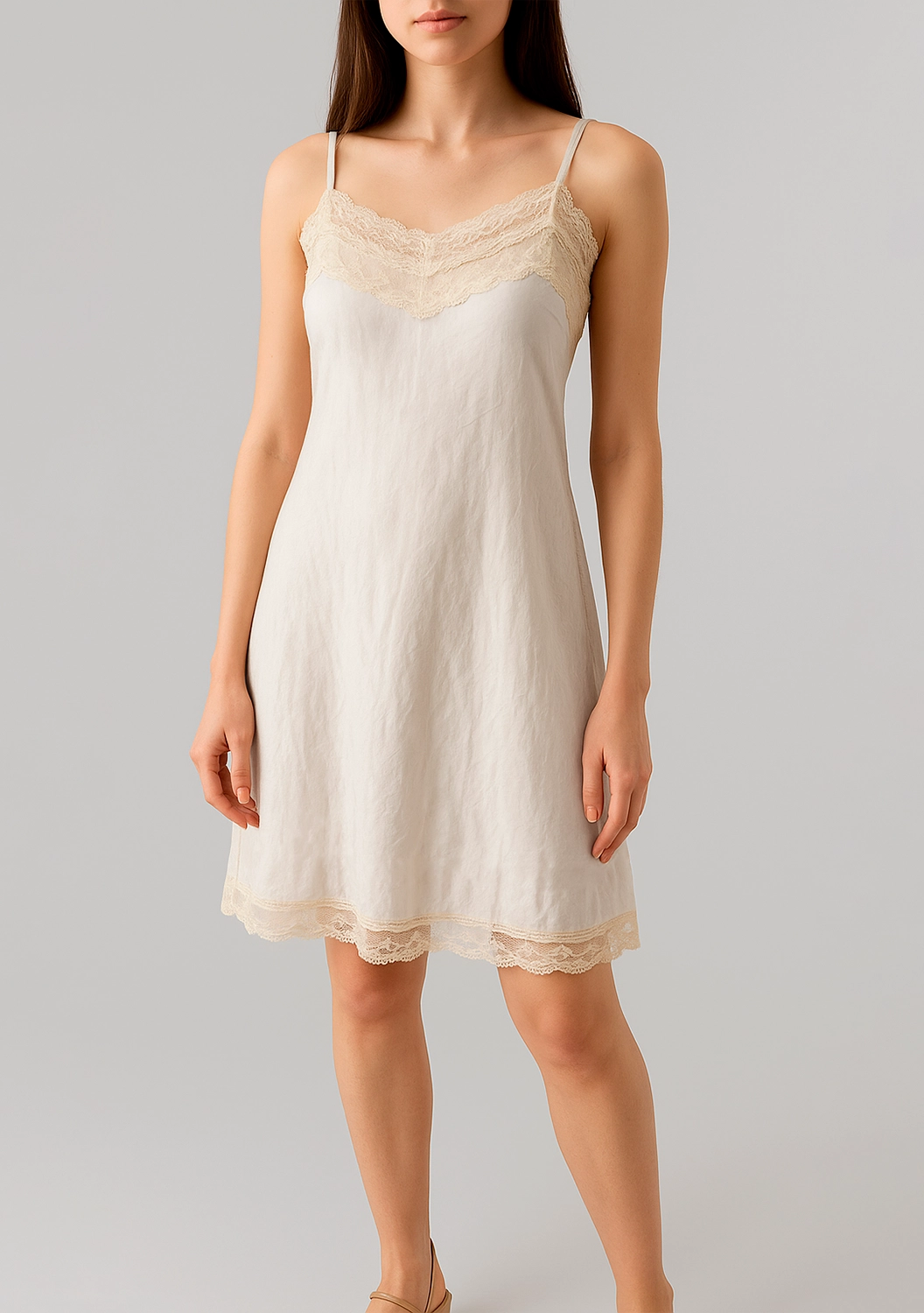 Очаровательное платье Ink slip из 100% шелка — воплощение изысканности и комфорта. Элегантный силуэт с тонкими бретельками подчеркивает женственность, а изящная кружевная отделка на груди и подоле добавляет утонченный шарм. Мягкий шелк нежного кремового оттенка нежно струится по фигуре, обеспечивая непревзойденную легкость и приятное ощущение на коже. Это платье станет настоящей жемчужиной вашего гардероба.