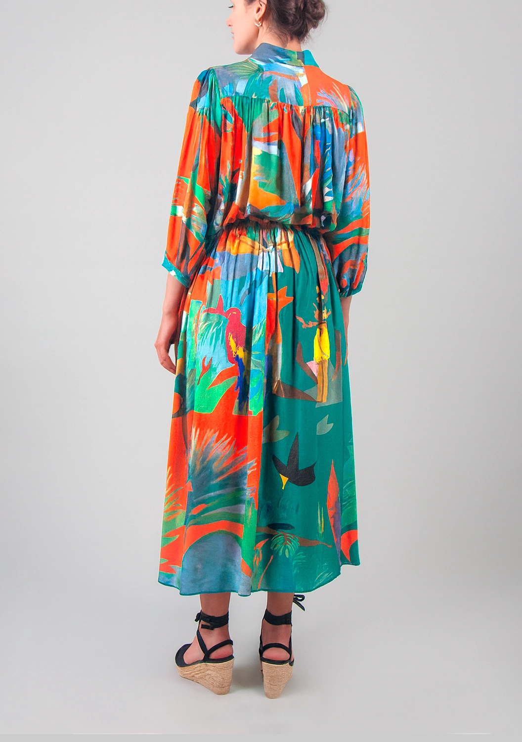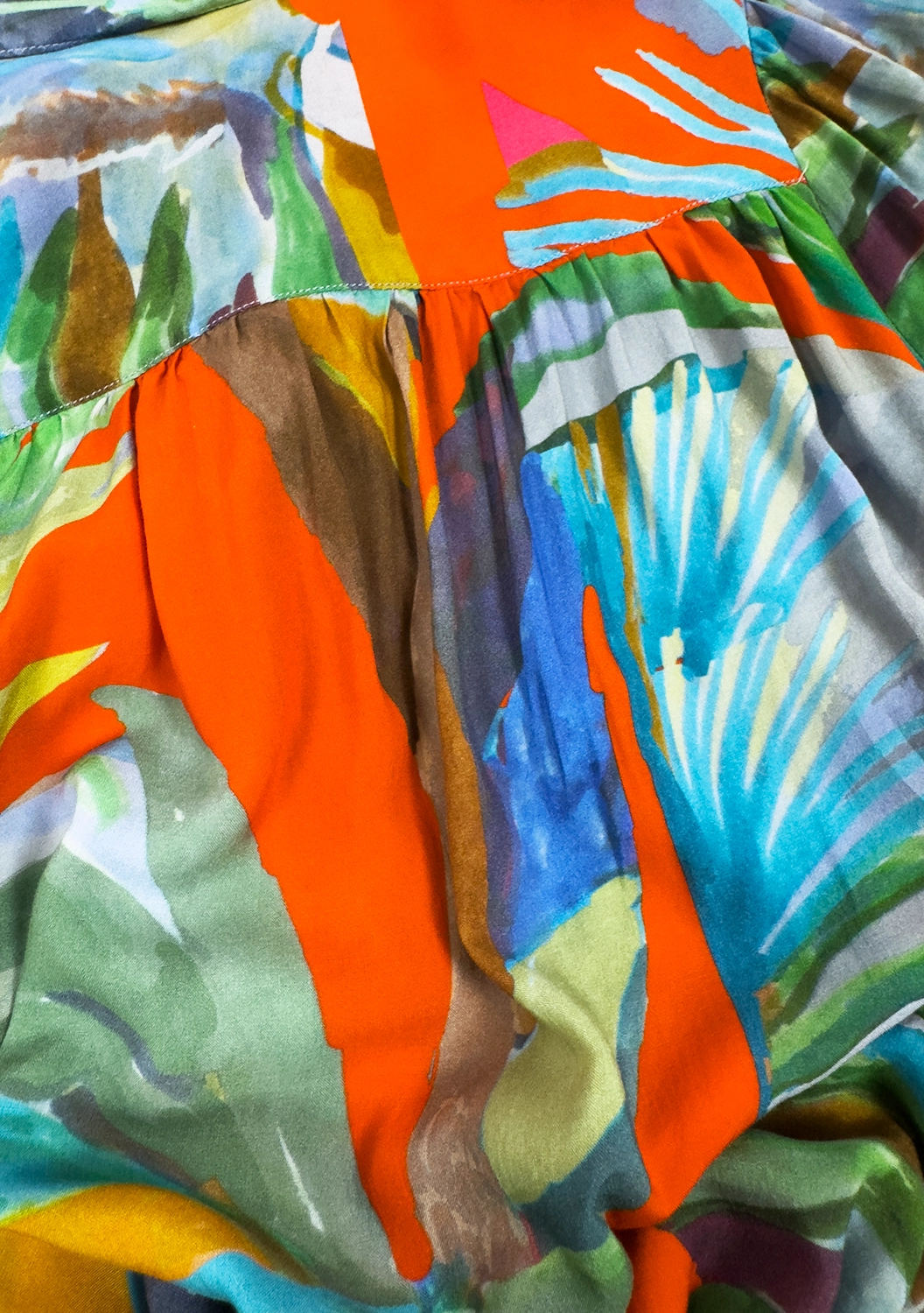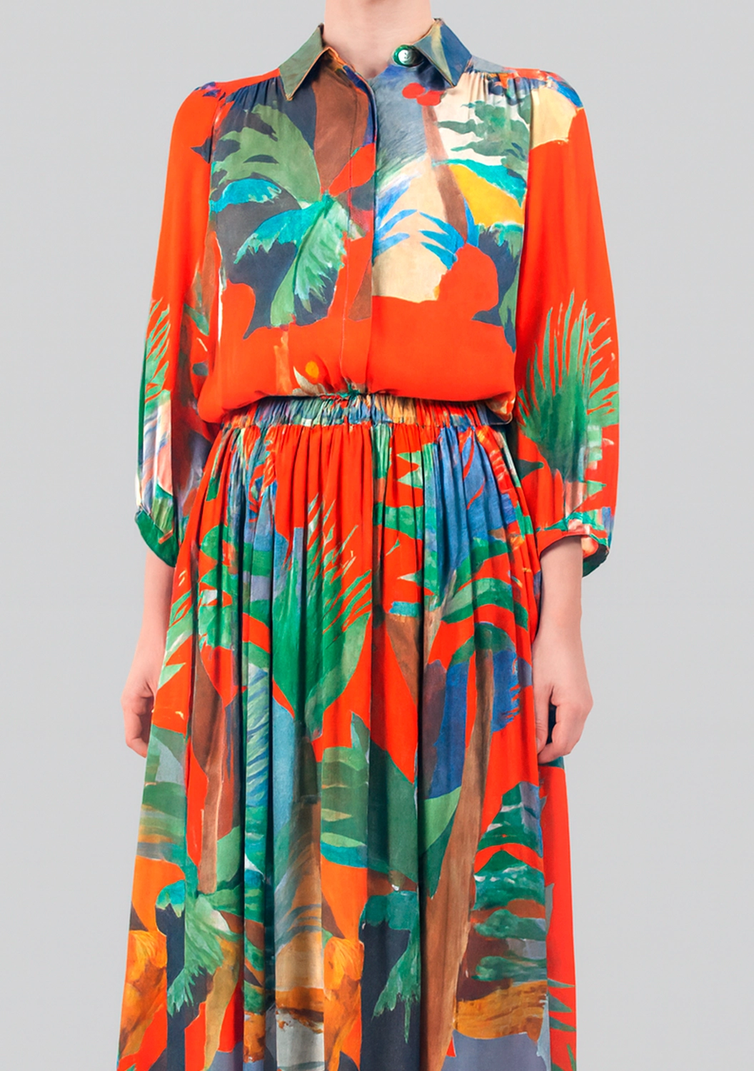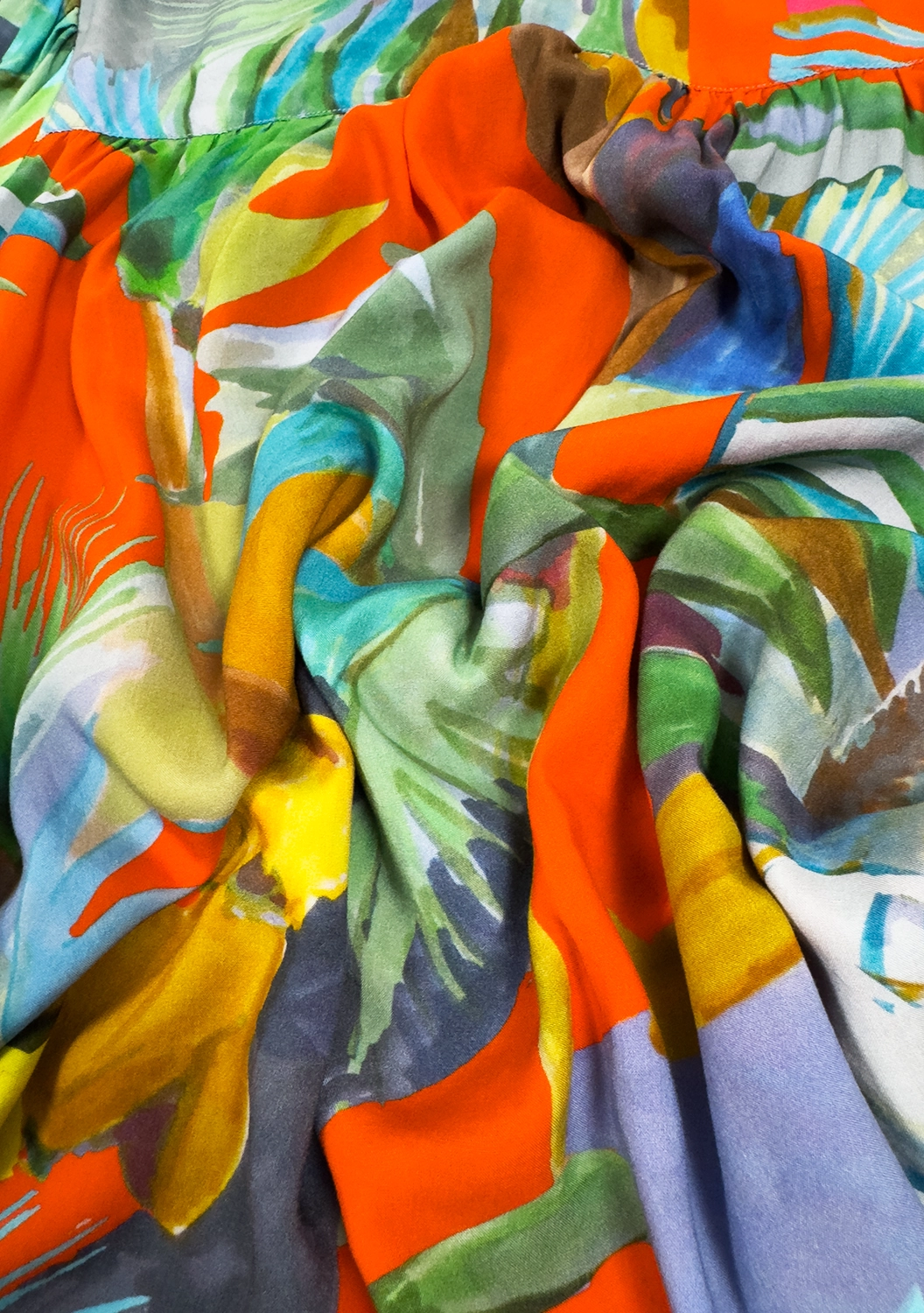 Блузка из вискозы G.Kero — лёгкая, струящаяся и яркая, как тропическая картина. Сочный оранжевый фон с акварельными рисунками листьев и птиц наполняет образ энергией и свободой. Мягкая ткань нежно касается кожи, даря комфорт и воздушность в каждом движении.