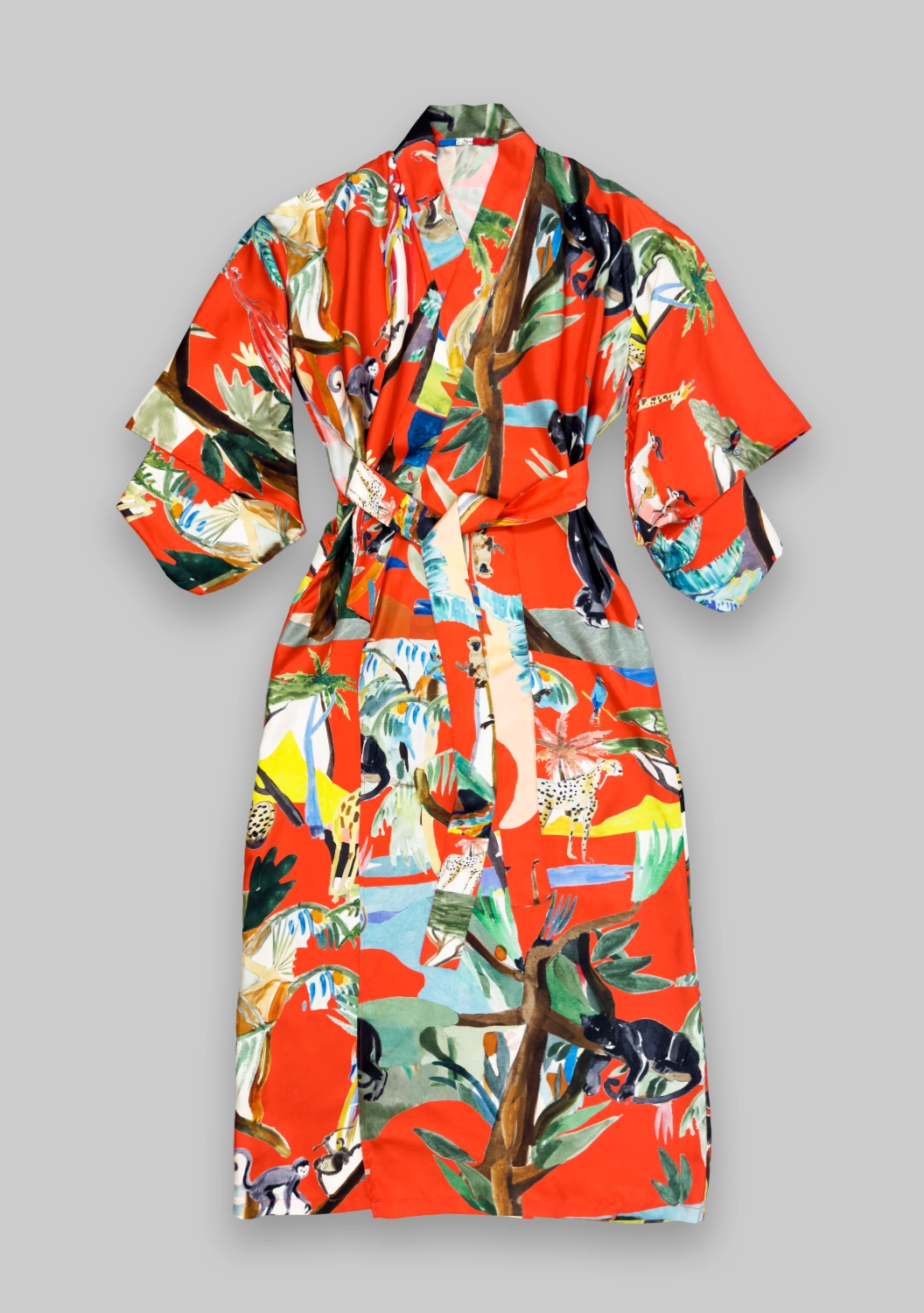 Яркое шелковое кимоно G.Kero — это воплощение тропической мечты. Насыщенный яркий фон оживляют акварельные рисунки экзотических животных и птиц: любопытные обезьяны, изящные жирафы, пятнистые гепарды, пестрые попугаи и стройные антилопы, утопающие в зелени пальм. Легкая, гладкая на ощупь ткань обволакивает тело, создавая ощущение прохлады и мягкости. Свободный крой и пояс подчеркивают силуэт, а уникальный авторский принт превращает кимоно в произведение искусства, которое хочется рассматривать снова и снова.