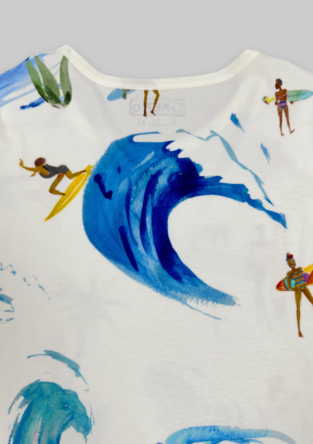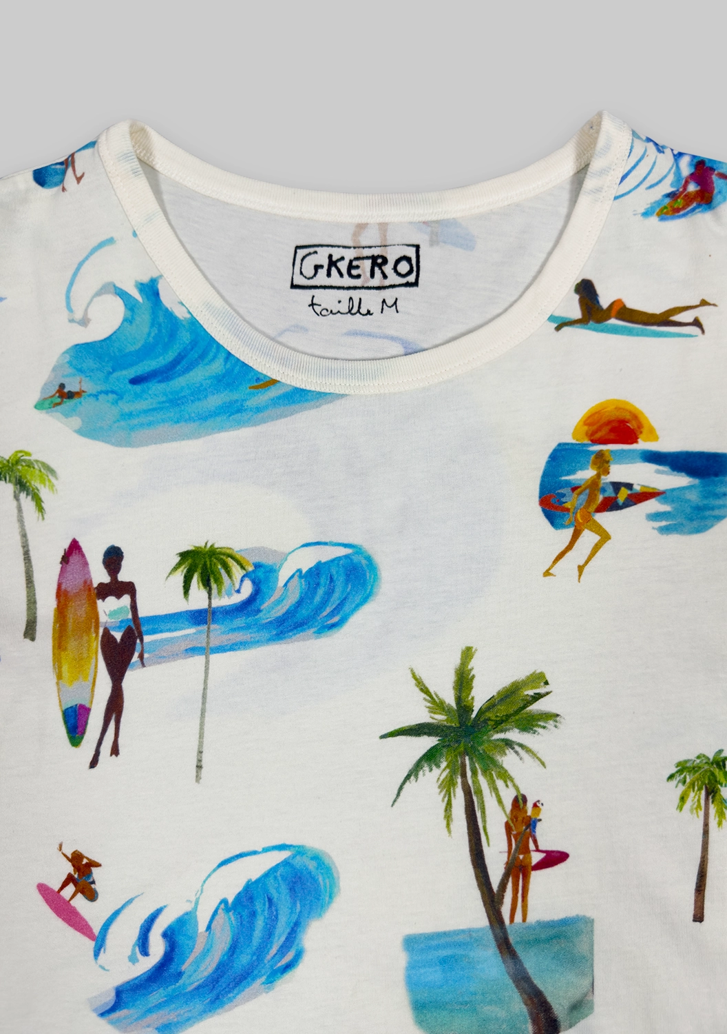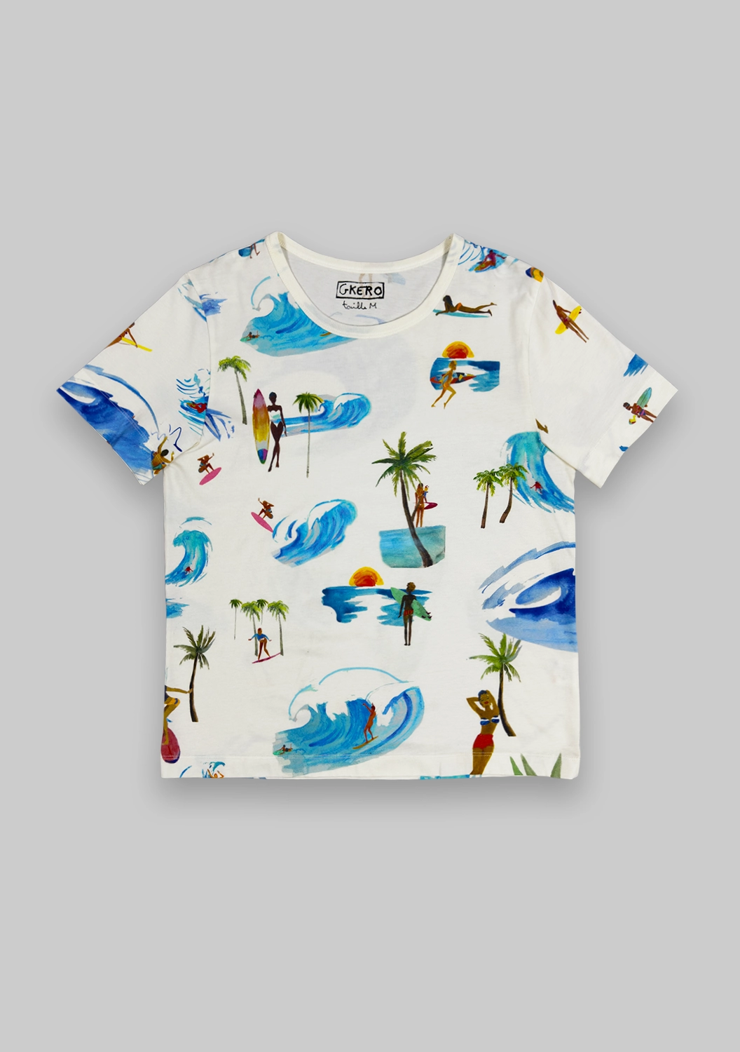 Футболка из хлопка G.Kero переносит в атмосферу лета и океанских волн. На белом фоне — живые акварельные рисунки с серфингом, пальмами и закатами, создающие ощущение свободы и отдыха у моря. Мягкая ткань приятно ложится на кожу и дарит лёгкость каждому движению.