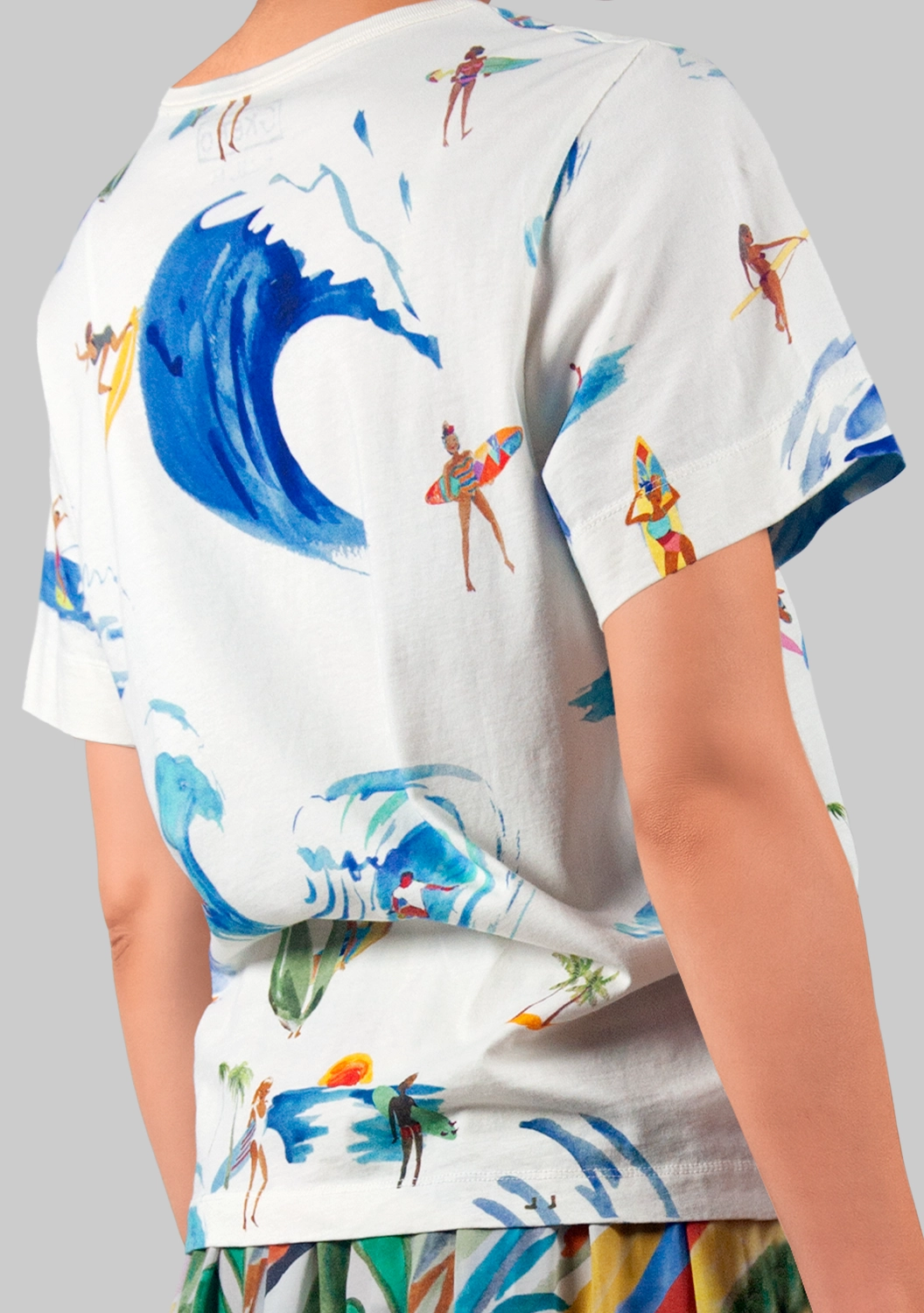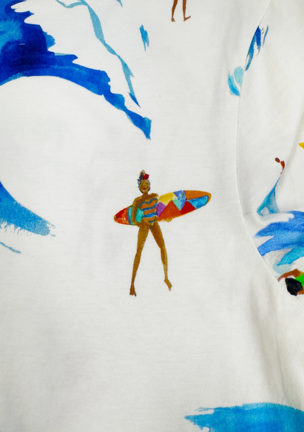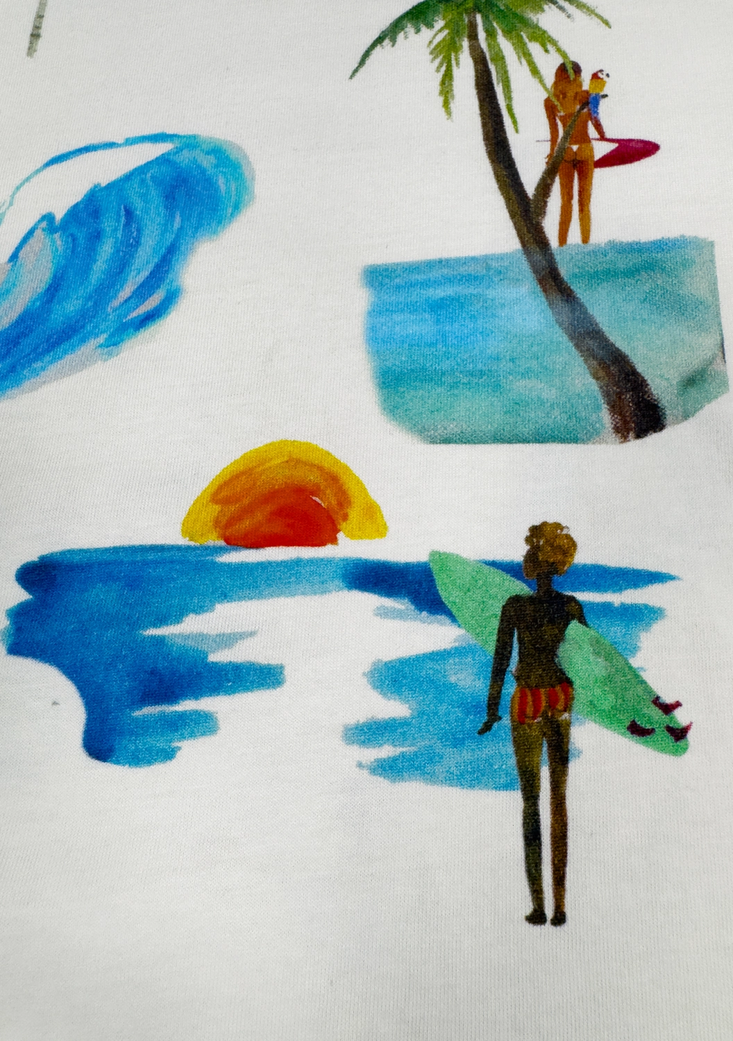 Футболка из хлопка G.Kero переносит в атмосферу лета и океанских волн. На белом фоне — живые акварельные рисунки с серфингом, пальмами и закатами, создающие ощущение свободы и отдыха у моря. Мягкая ткань приятно ложится на кожу и дарит лёгкость каждому движению.