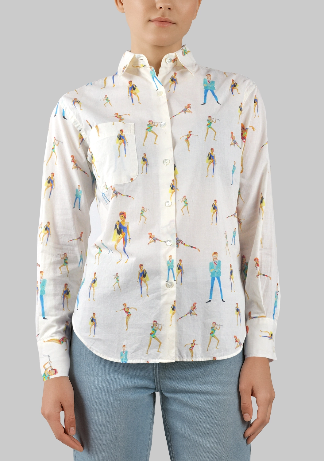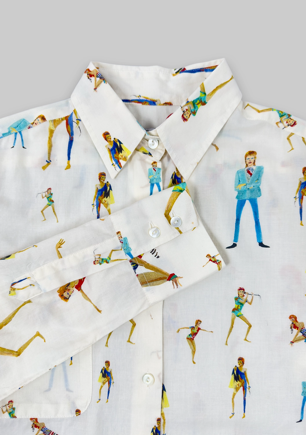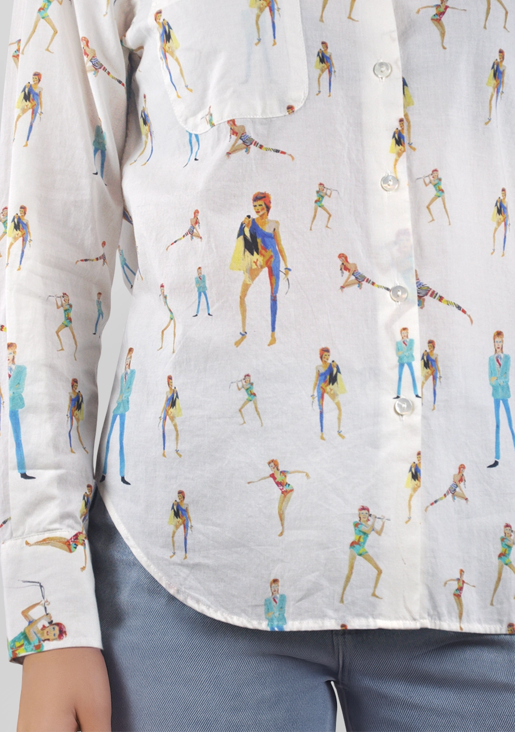 Главный акцент — авторский принт с изображением Дэвида Боуи в его культовых сценических образах. Он превращает рубашку в настоящее произведение искусства, пропитанное духом глэм-рока, свободы и креатива.
