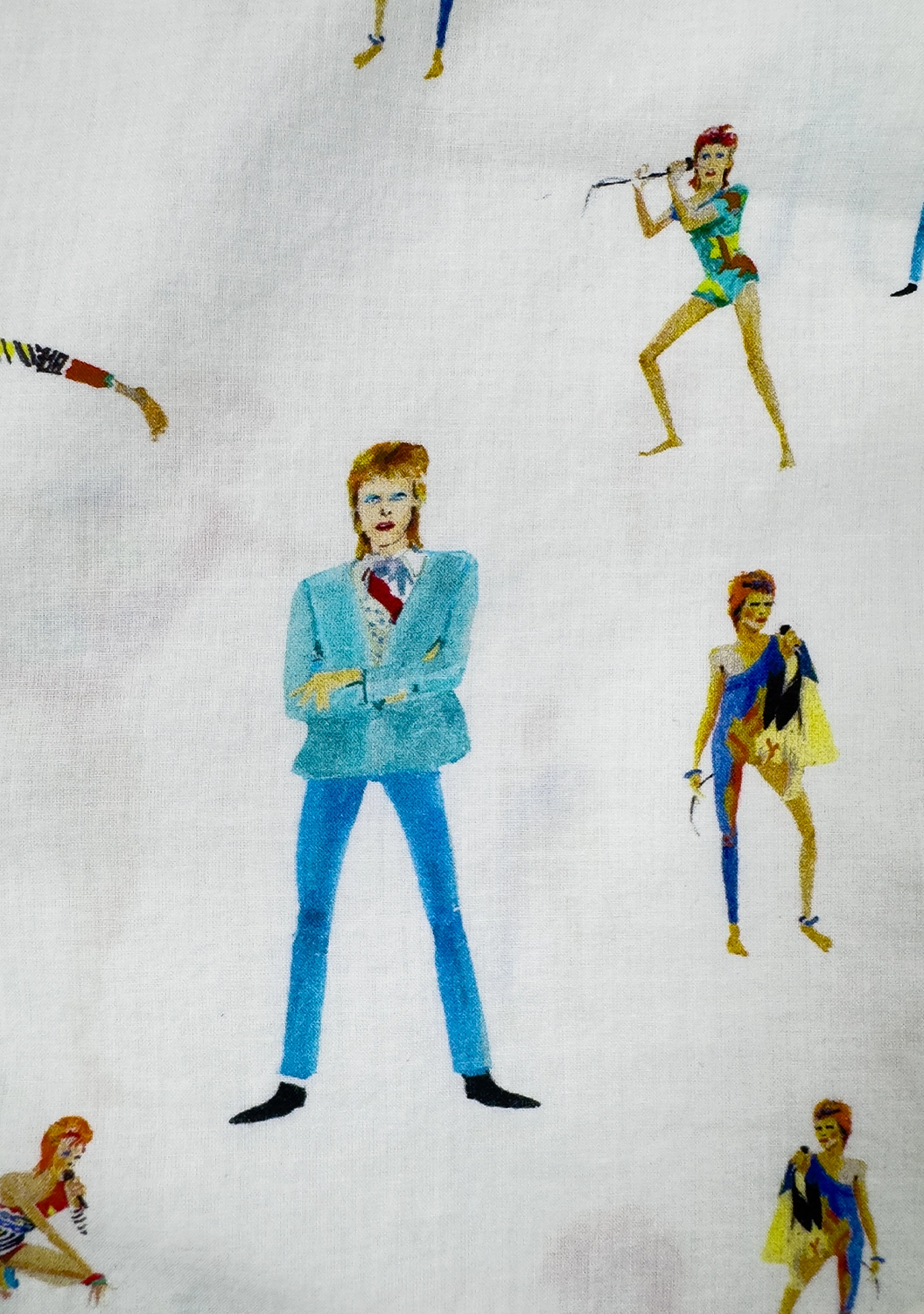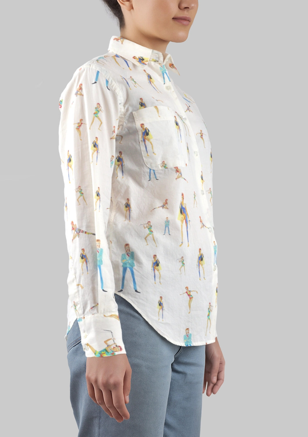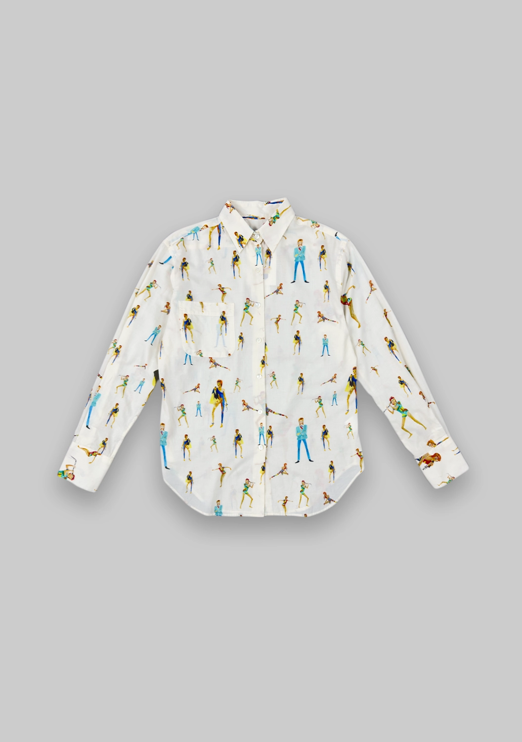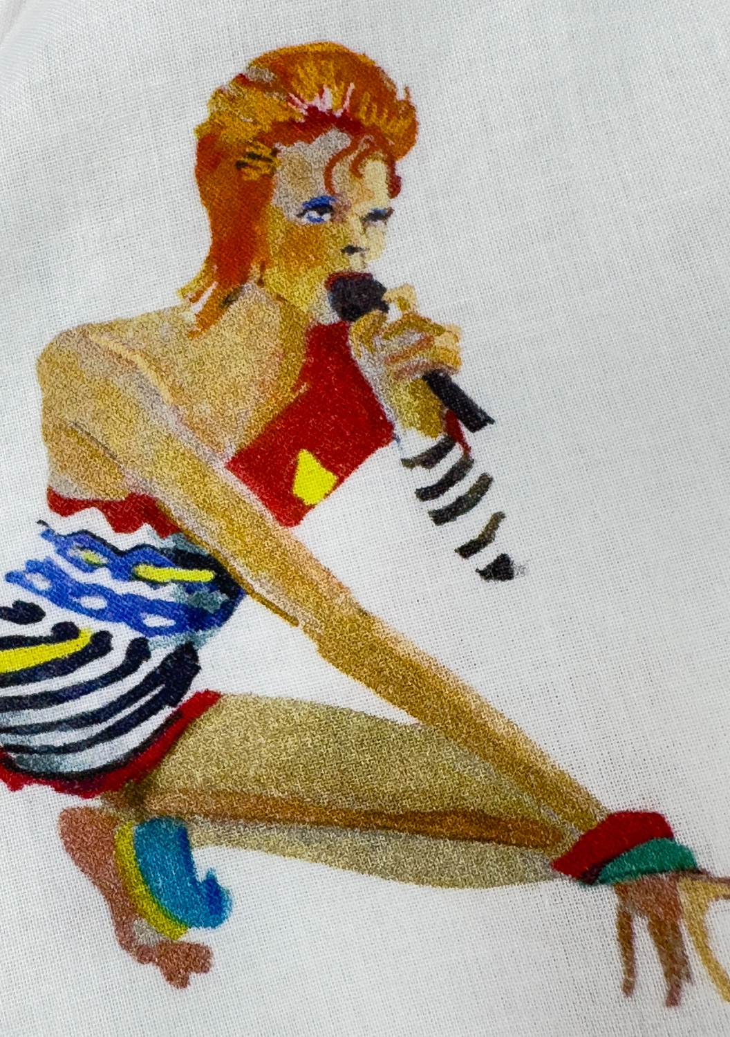 Главный акцент — авторский принт с изображением Дэвида Боуи в его культовых сценических образах. Он превращает рубашку в настоящее произведение искусства, пропитанное духом глэм-рока, свободы и креатива.