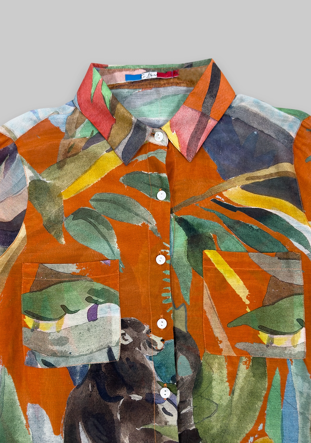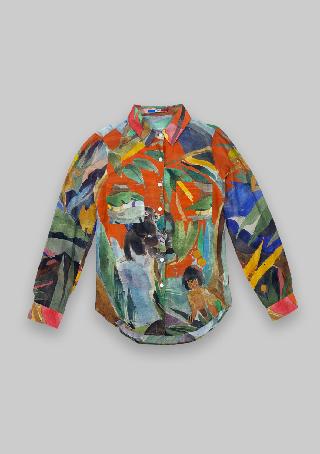 Рубашка Monkey Trees Rouge CS из хлопка и шёлка от G.Kero — словно живописное полотно, ожившее на ткани. Яркий рисунок с тропической растительностью и фигурами создаёт эффект объёмной картины. Лёгкая полупрозрачная ткань сочетает прохладу шёлка и мягкость хлопка, даря особое ощущение нежности и свободы.