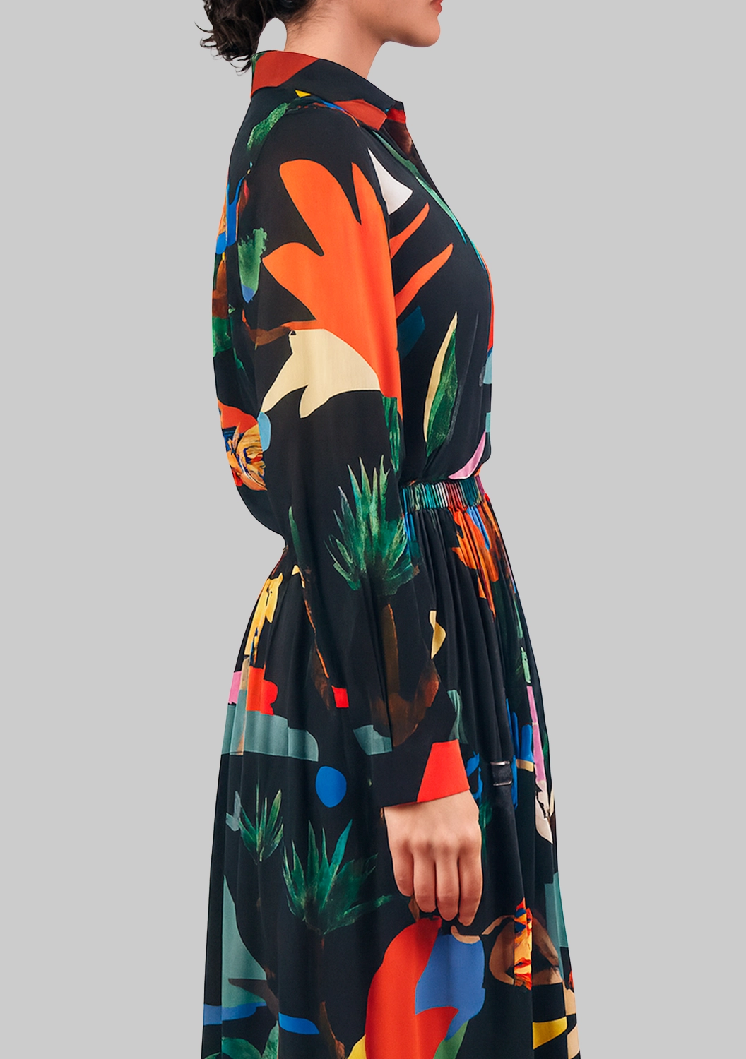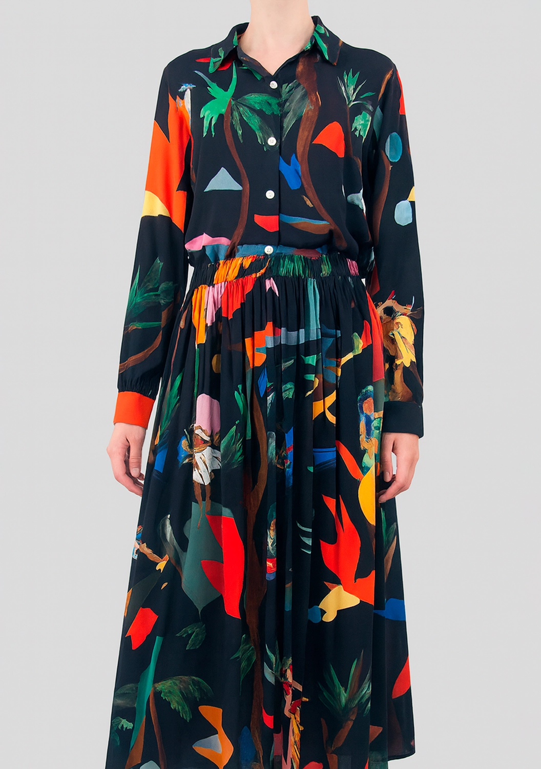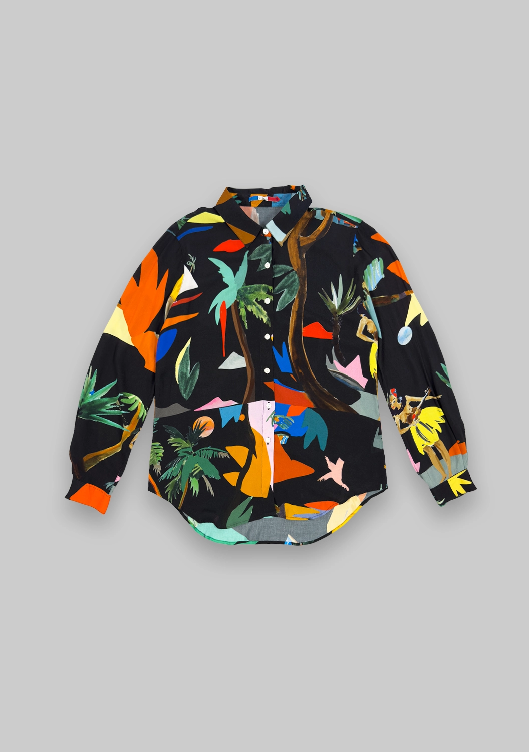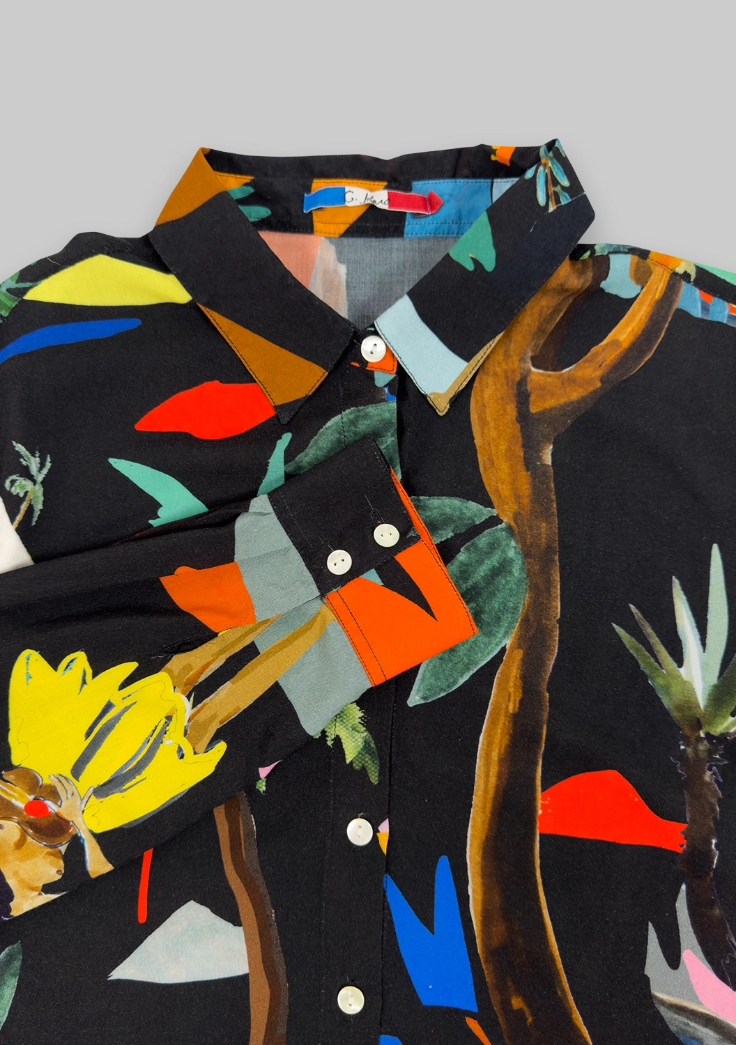 Рубашка Black Moon из вискозы от G.Kero — это смелое сочетание тёмного фона и ярких акварельных акцентов. Экзотический принт с пальмами, танцующими фигурами и тропическими деталями создаёт эффект живой картины. Лёгкая вискоза мягко драпируется и дарит ощущение свободы, а классический крой с длинным рукавом делает модель универсальной: её легко носить как с юбкой, так и с брюками.