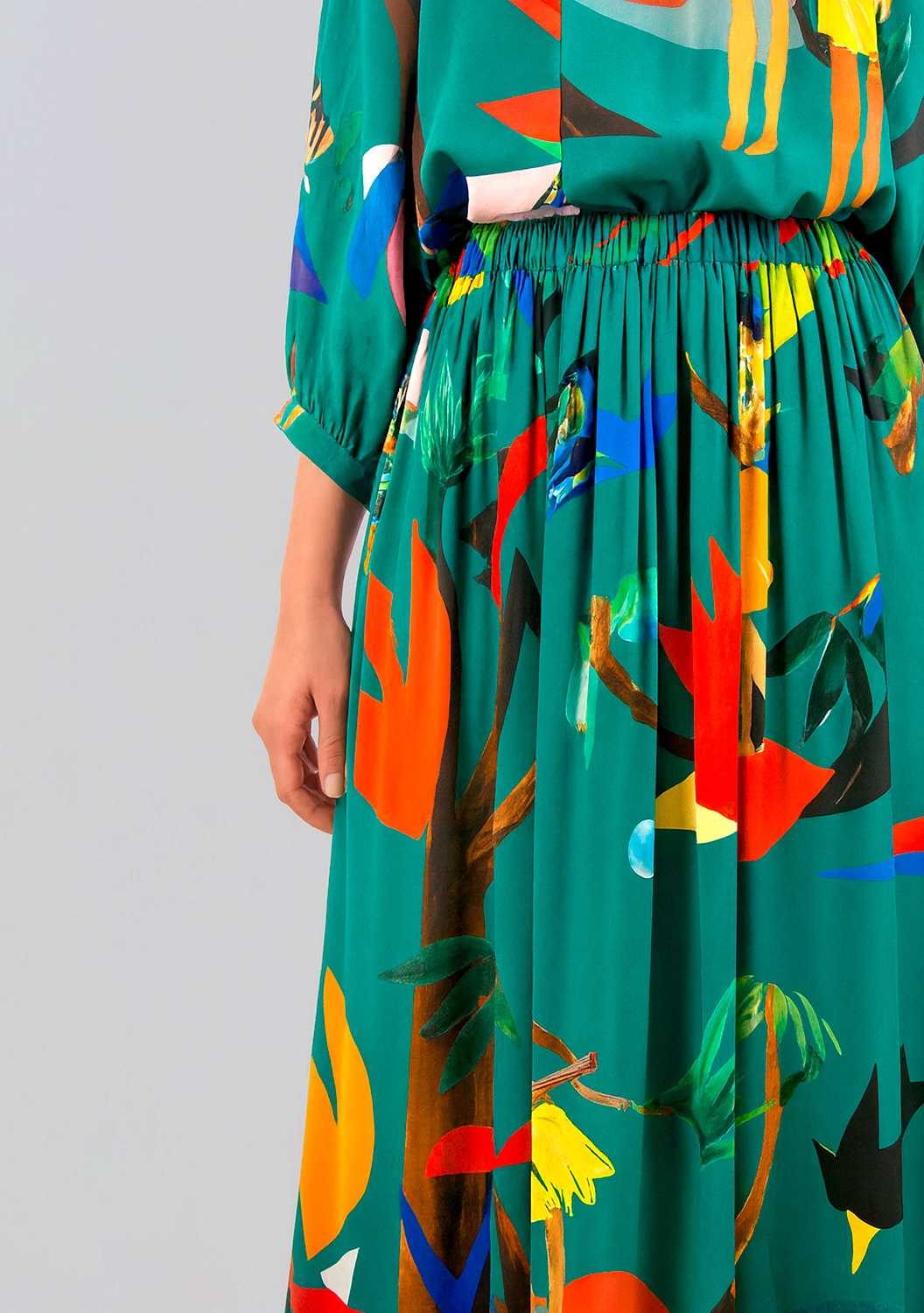 Юбка Green moon из вискозы от G.Kero — это настоящая картина в движении. На насыщенном изумрудном фоне оживают яркие мазки с тропическими мотивами и танцующими фигурами. Лёгкая ткань струится при каждом шаге, а мягкий пояс на резинке обеспечивает удобную посадку. Юбка дарит ощущение свободы и превращает повседневный образ в арт-перформанс.