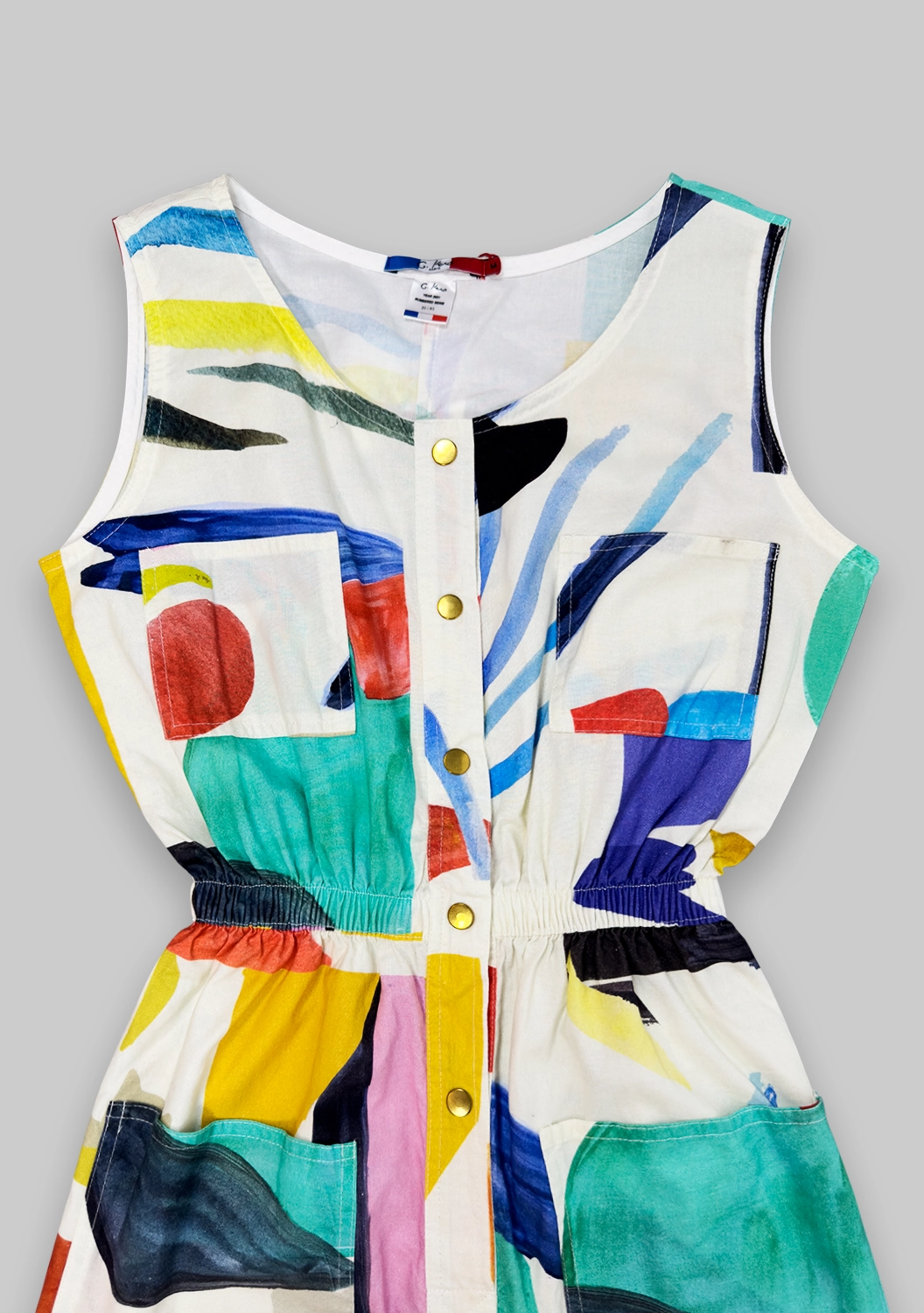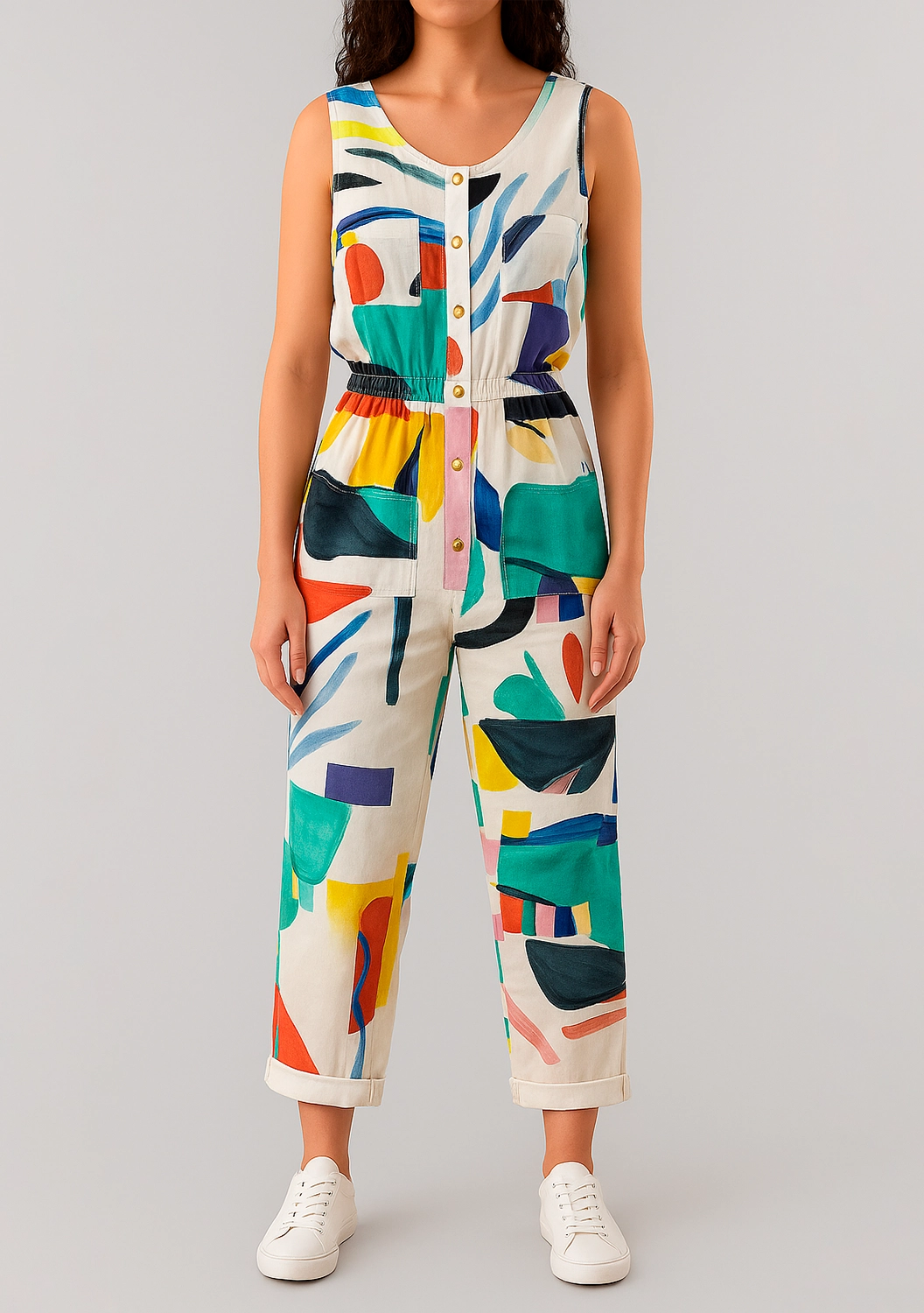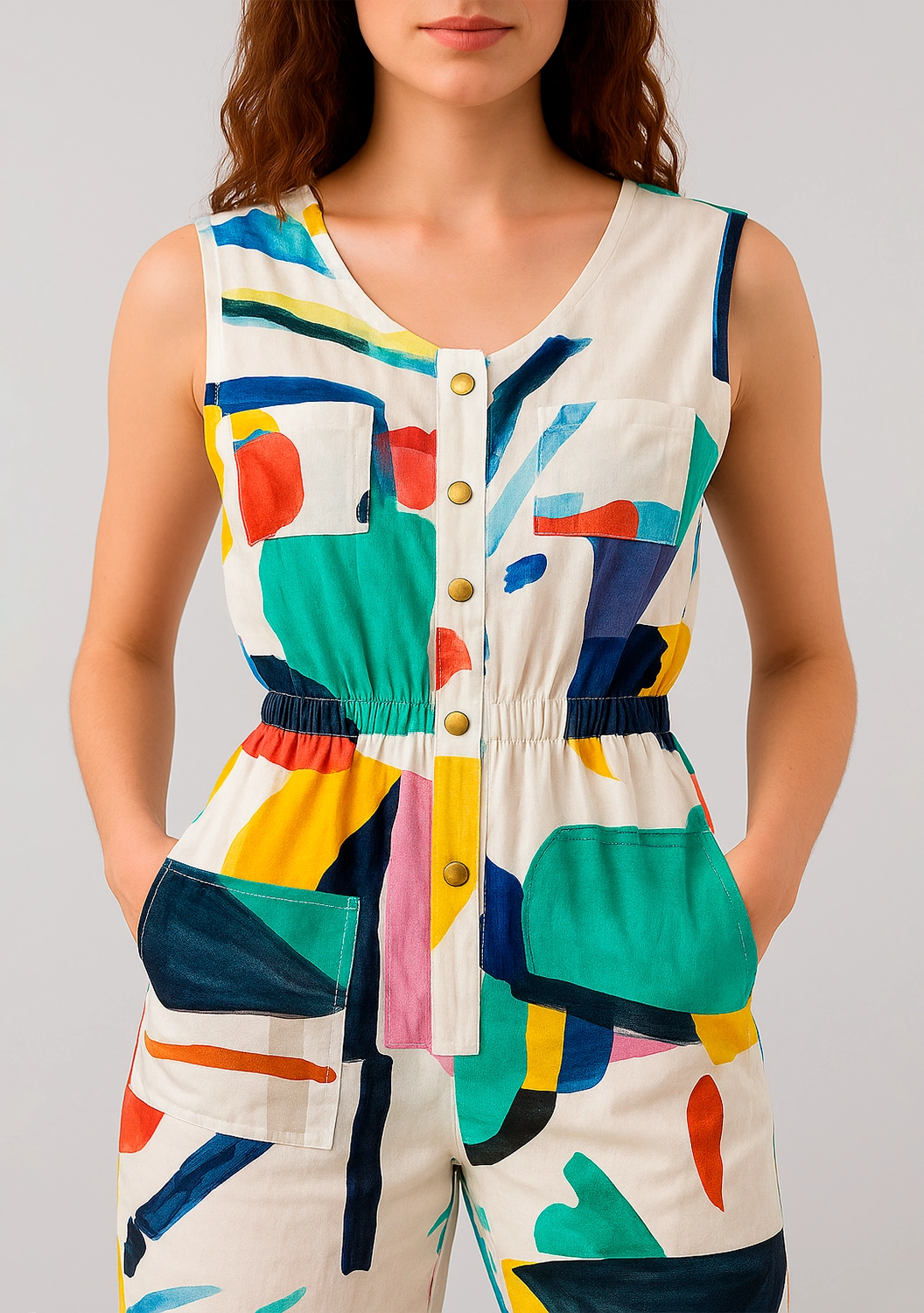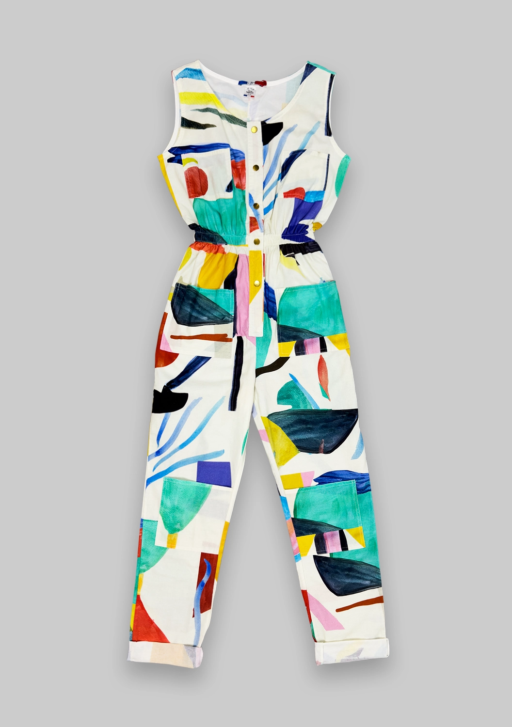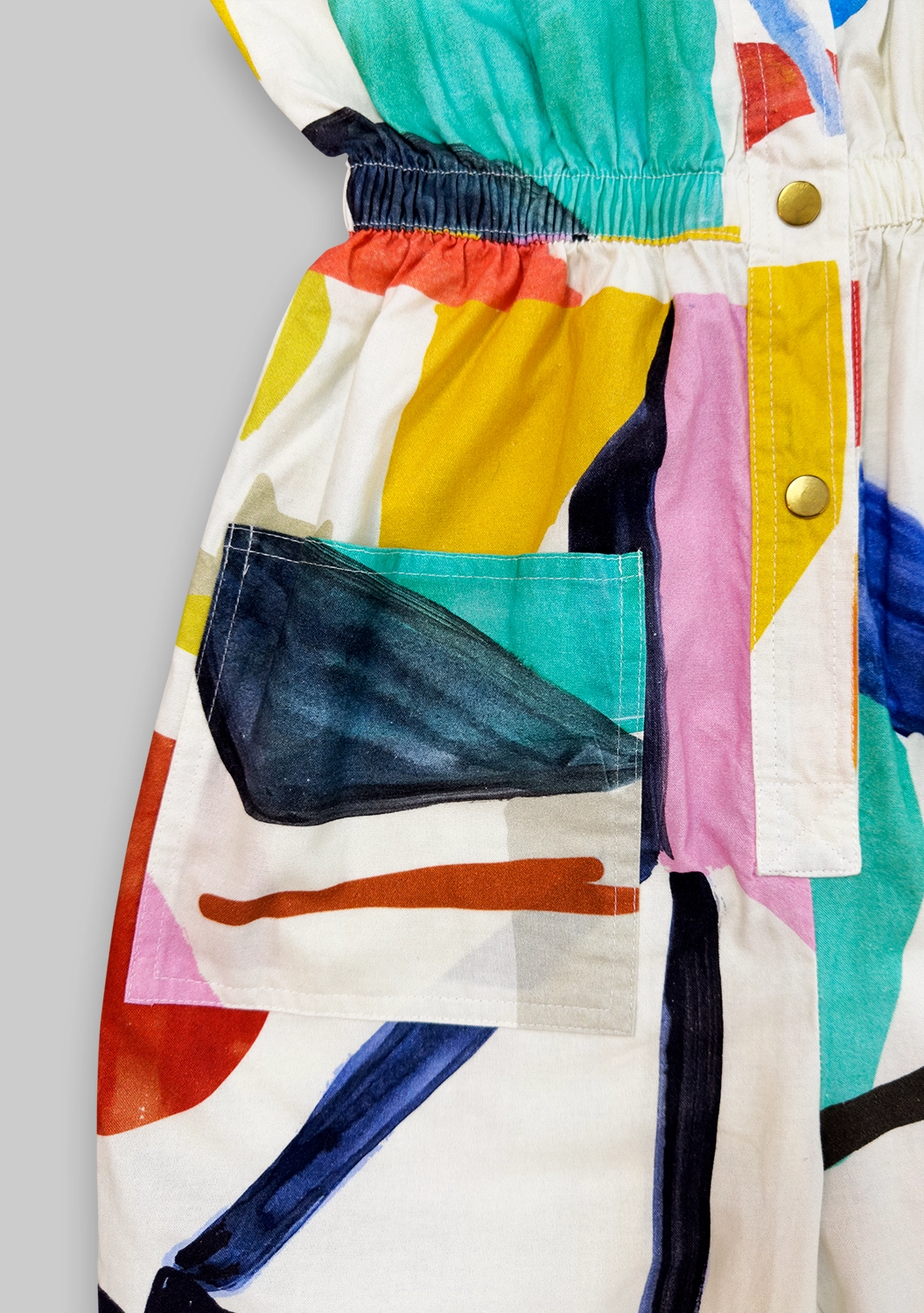 Комбинезон из хлопка Abstrait happy — воплощение летней свободы и креативной энергии. Яркий абстрактный принт с насыщенными цветами напоминает мазки на холсте, превращая вещь в произведение искусства. Легкий, мягкий хлопок приятно ощущается на коже, а приталенный силуэтом с резинкой на талии крой подчеркивает фигуру, не ограничивая движения. Практичные накладные карманы добавляют расслабленную нотку, делая образ одновременно стильным и удобным.