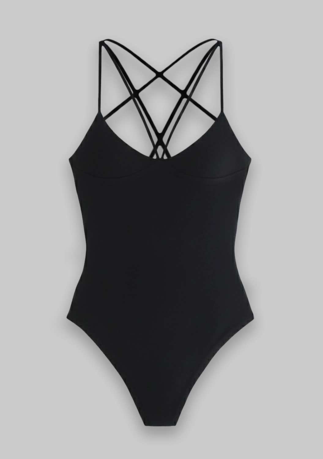 Главный акцент — изящная паутина тонких лямок: спереди они формируют аккуратный V-силуэт, а сзади переплетаются в выразочный геометричный рисунок. Лаконичный перед и открытая спина гармонично сочетают сдержанность и смелость.