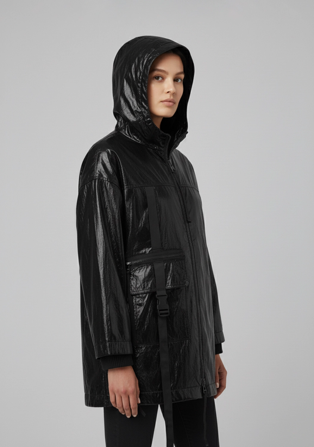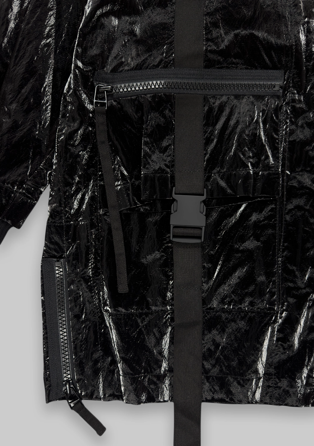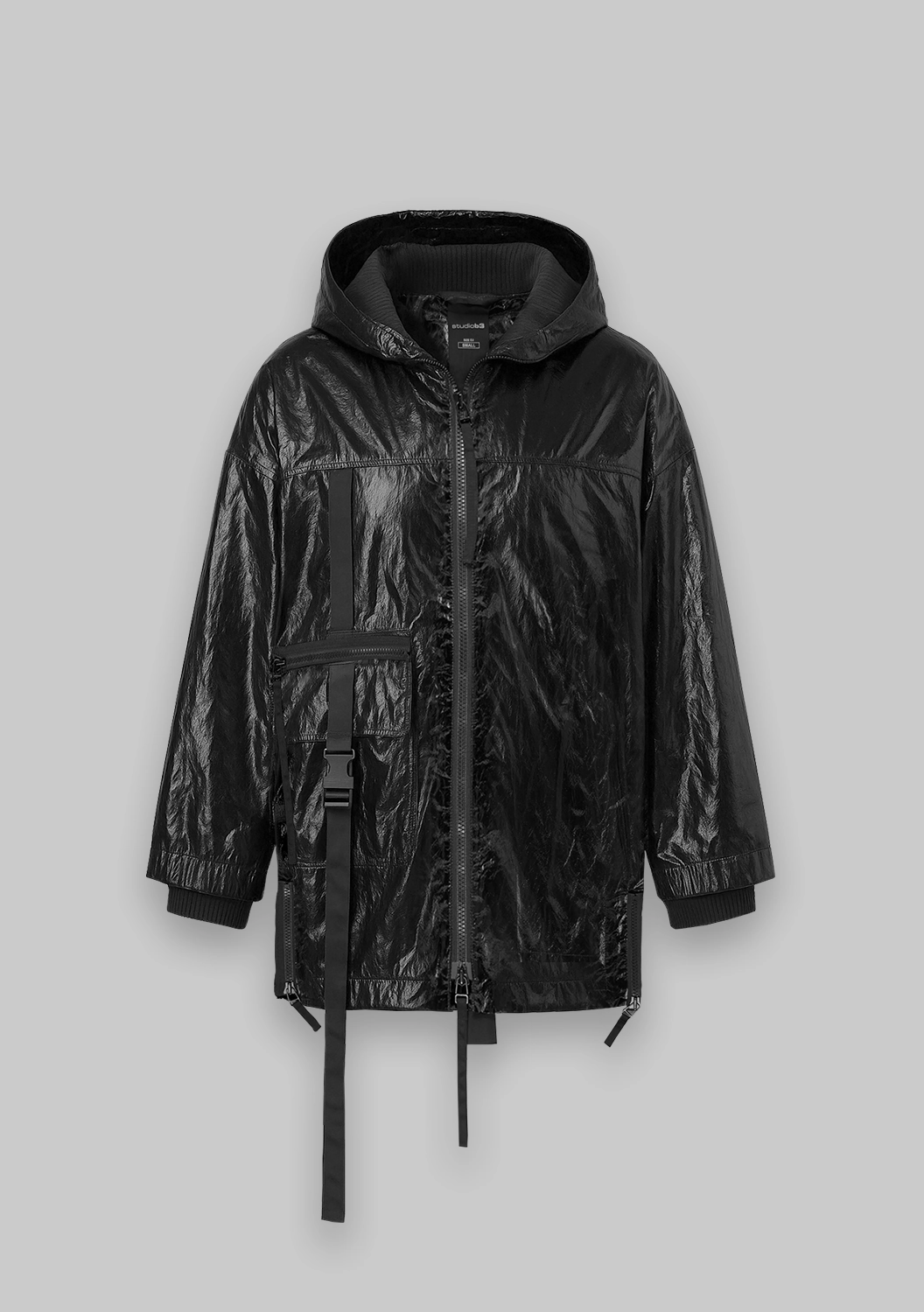 Создан из легкого технологичного материала с глянцевым металлическим блеском, он притягивает взгляд и при этом остаётся невероятно лёгким и комфортным. Свободный крой, капюшон и функциональные детали — молнии, ленты, пряжки — создают динамичный силуэт с урбанистическим характером.