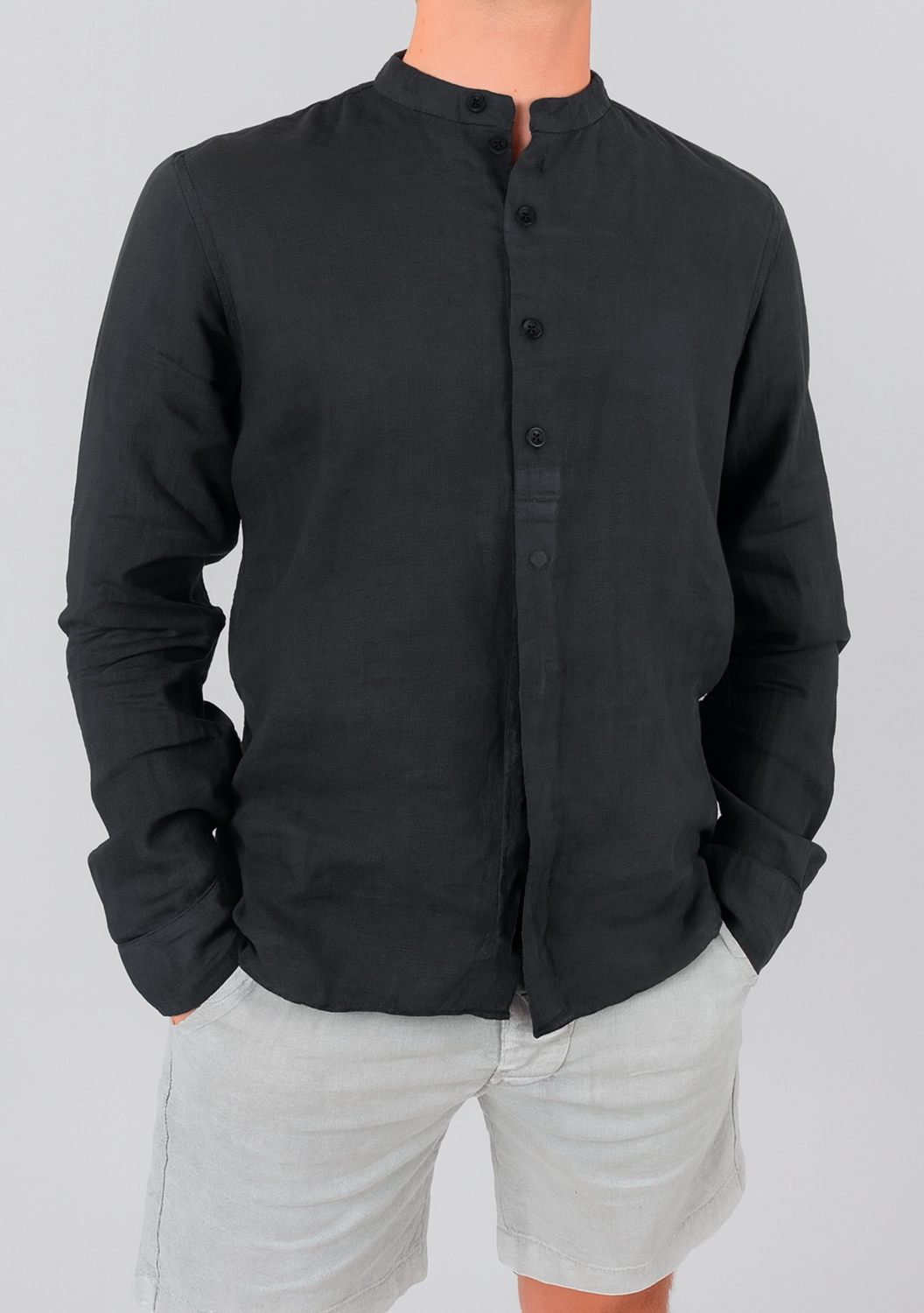 Лаконичная рубашка из 100% льна с воротником-стойкой — воплощение легкости и тактильного комфорта. Мягкая, дышащая ткань дарит ощущение прохлады, а свободный крой добавляет стильный акцент. Идеальный выбор для ценителей минимализма и натуральных материалов.