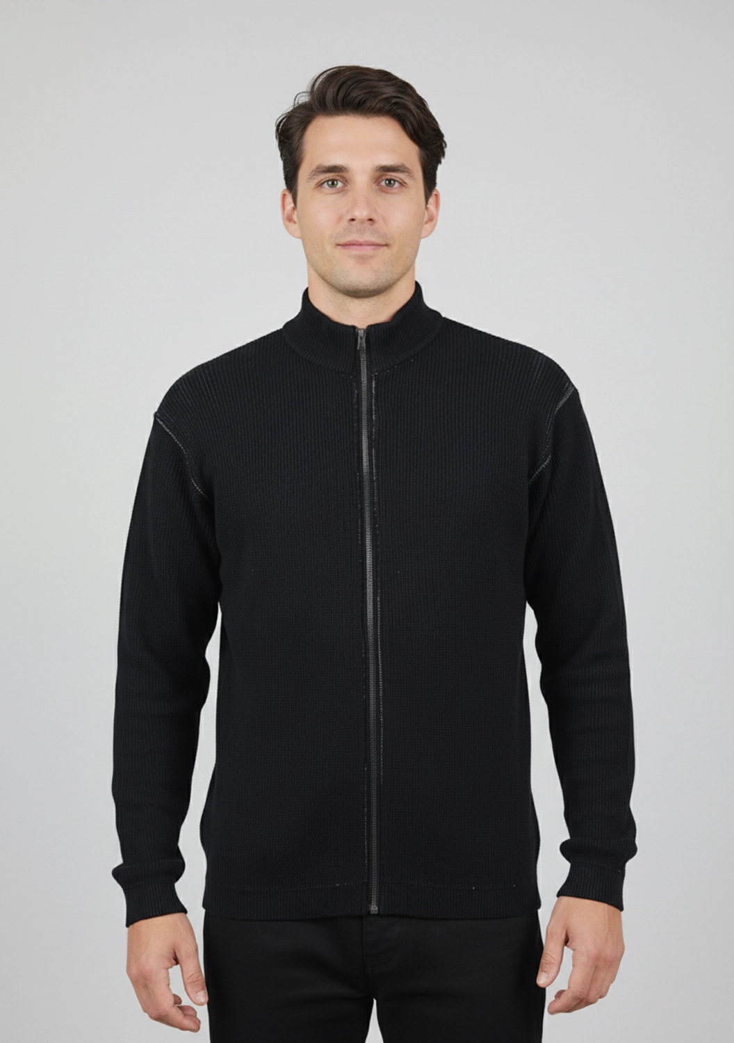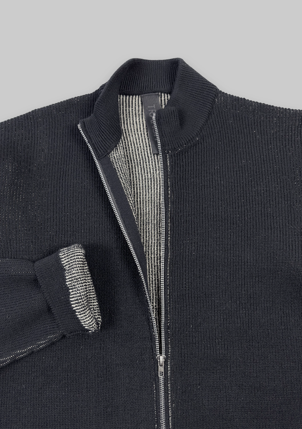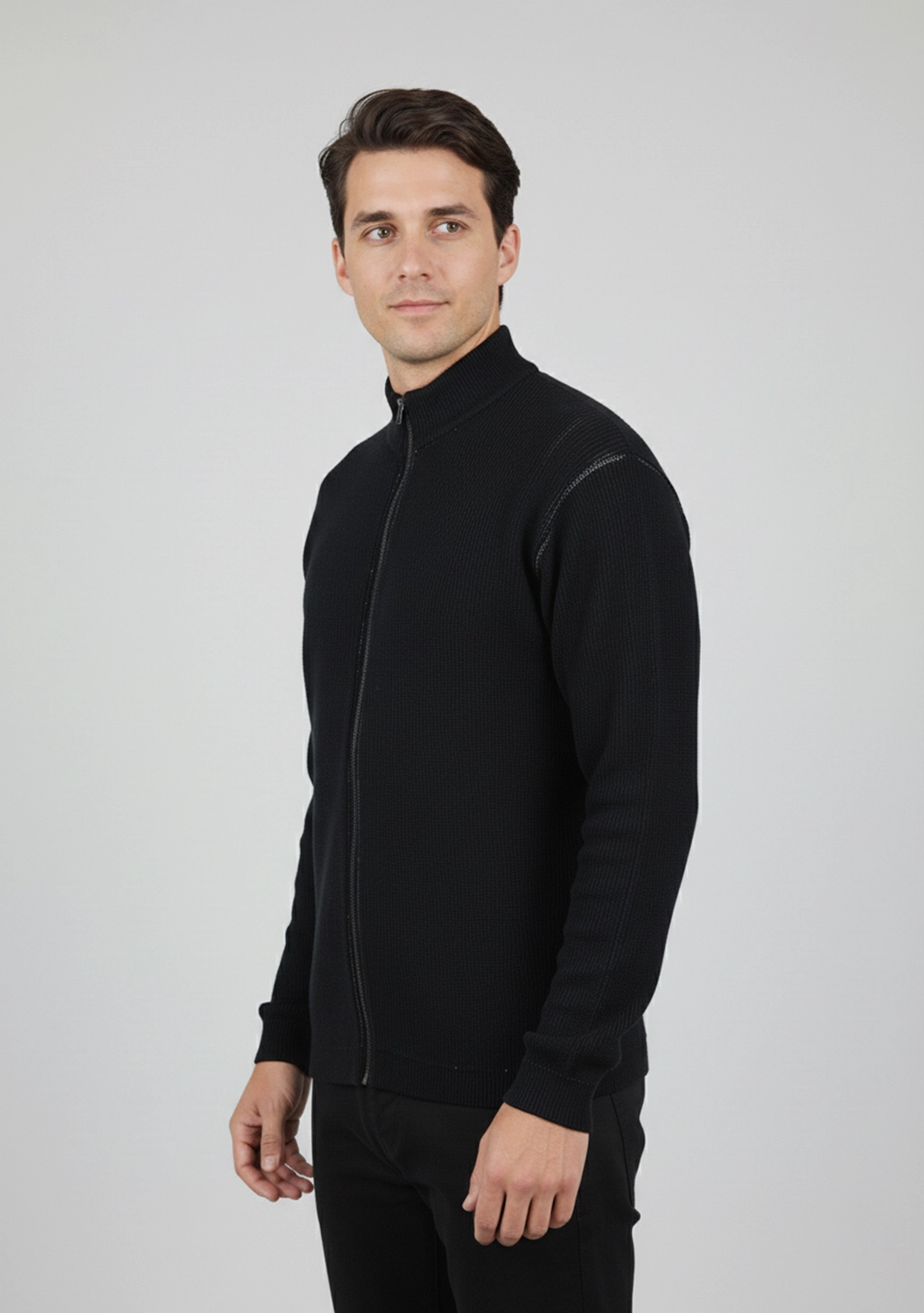 Мягкий фактурный трикотаж приятно прилегает к телу, сохраняя тепло и дышащие свойства натурального льна. Прямой силуэт с высоким воротником и молнией придаёт образу современную чистоту, а выверенные детали — наружные швы, плотные манжеты и глубокие карманы — подчеркивают характер бренда.