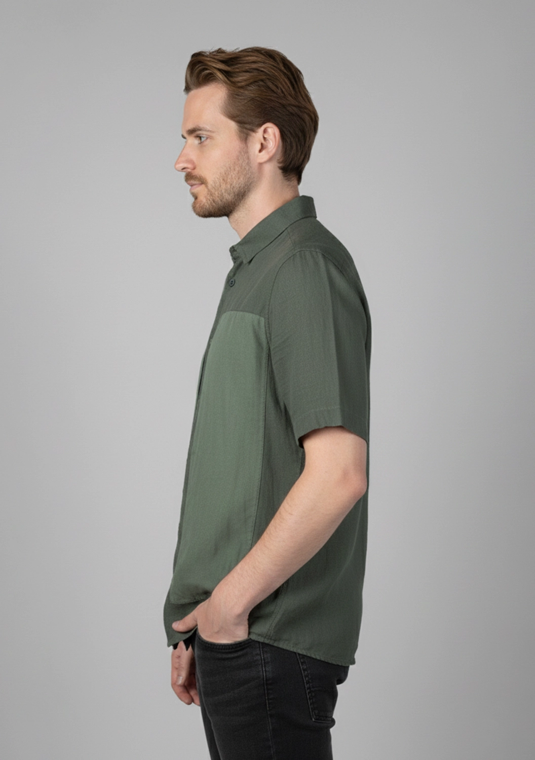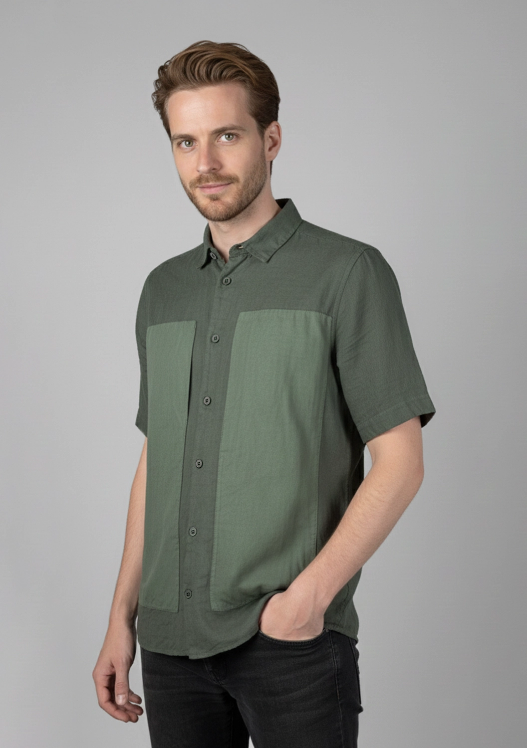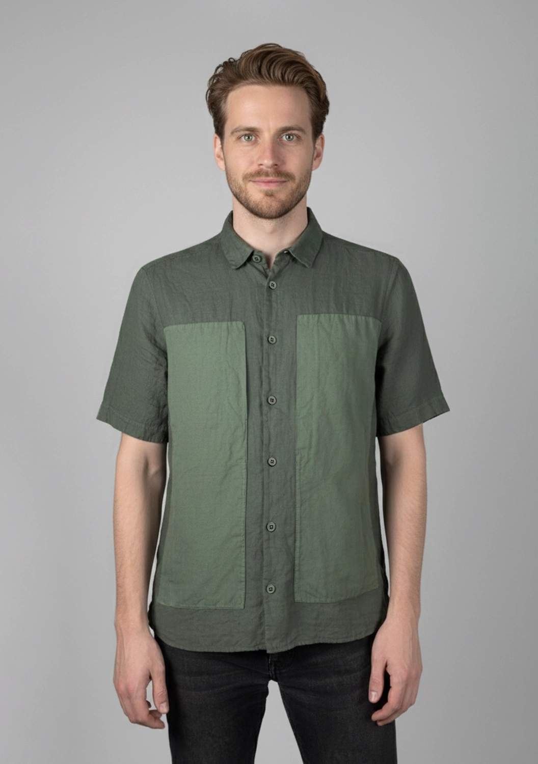 Рубашка изо льна с коротким рукавом, в выразительном оттенке с контрастными карманами — вещь, которая говорит сама за себя. Фактурная ткань приятно охлаждает кожу, создавая ощущение легкости и комфорта даже в жаркую погоду. Большие накладные карманы придают модели архитектурный характер и подчёркивают индивидуальность образа. Мягкий воротник и матовые пуговицы завершают минималистичный, но выразительный силуэт. Эта рубашка — про честную простоту и выразительные тактильные ощущения.
