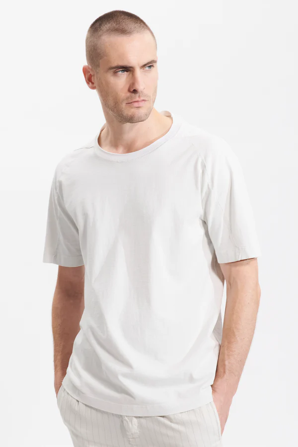 Футболка из плотного хлопкового трикотажа свободного кроя — идеальный выбор для тех, кто ценит удобство и лаконичный дизайн. Вязаный воротник и специальная строчка на воротнике и проймах рукавов добавляют изысканности. Внутренняя нашивка на затылочной части и окрашивание после пошива придают модели уникальный характер и эксклюзивный оттенок.