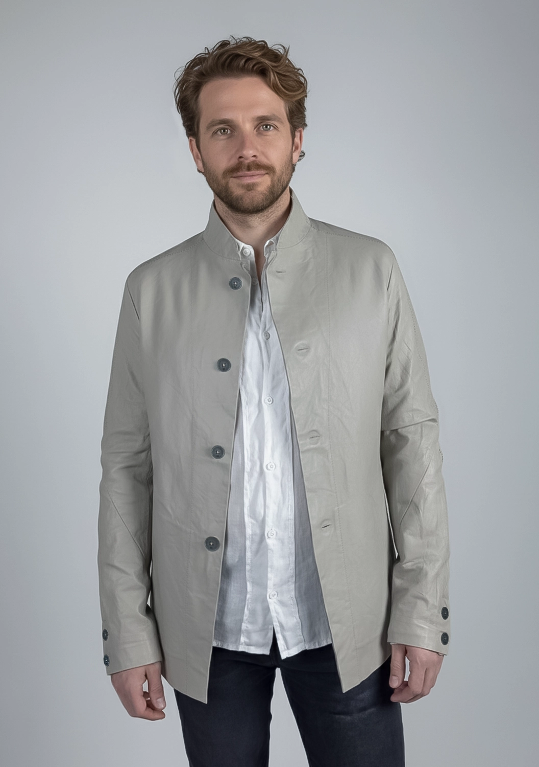 Минималистичный жакет из натуральной кожи от бренда Transit — универсальный элемент гардероба с выразительной фактурой и мягкой посадкой. Материал тактильно напоминает пергамент: плотный, но податливый, красиво драпируется в движении. Асимметричная линия застёжки и декоративные швы придают модели архитектурный характер.