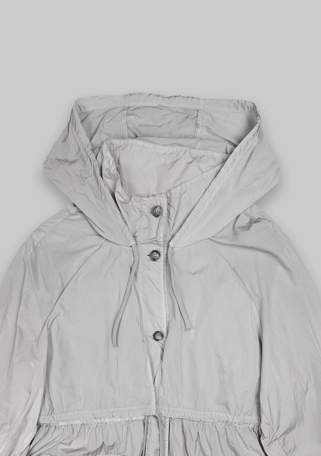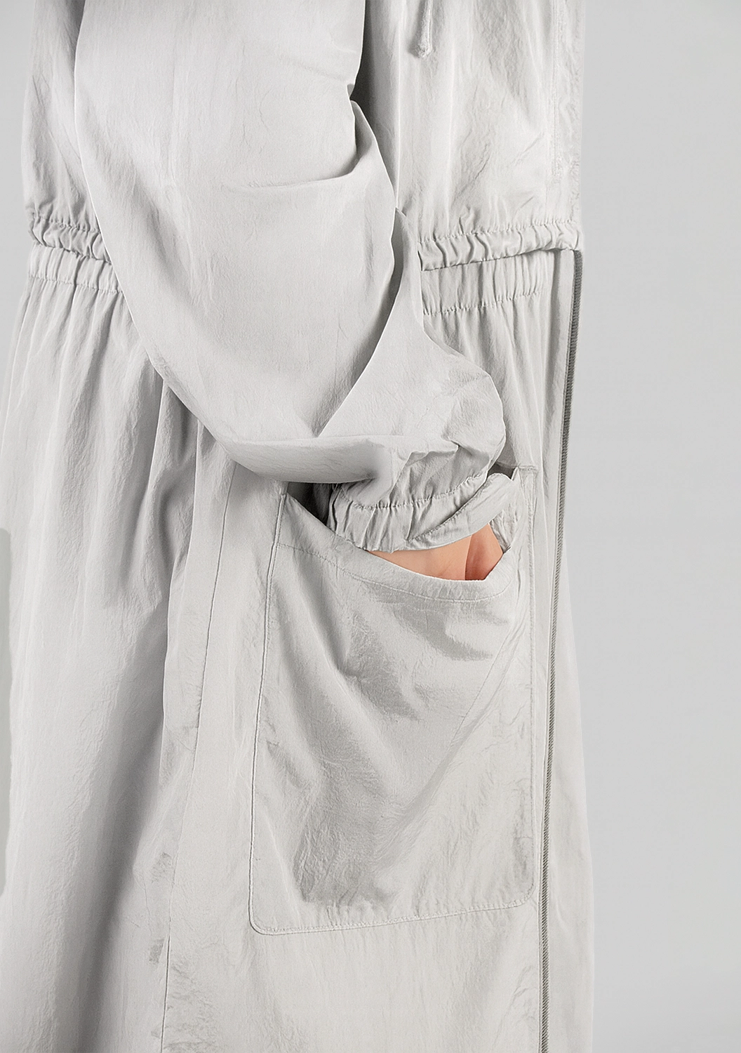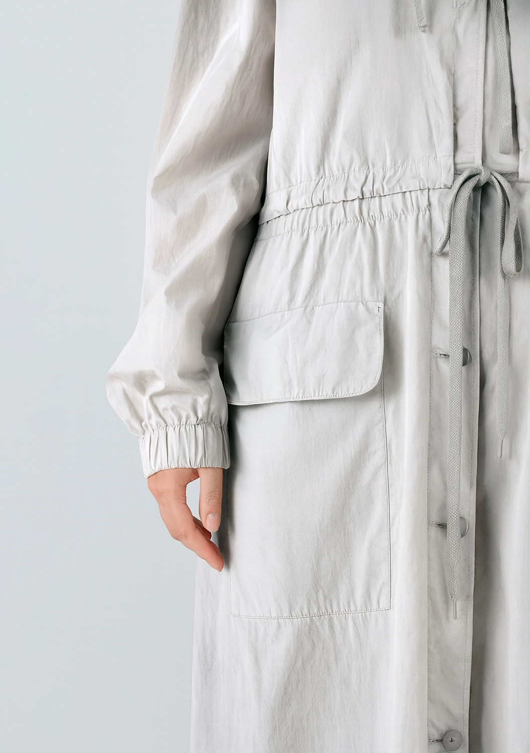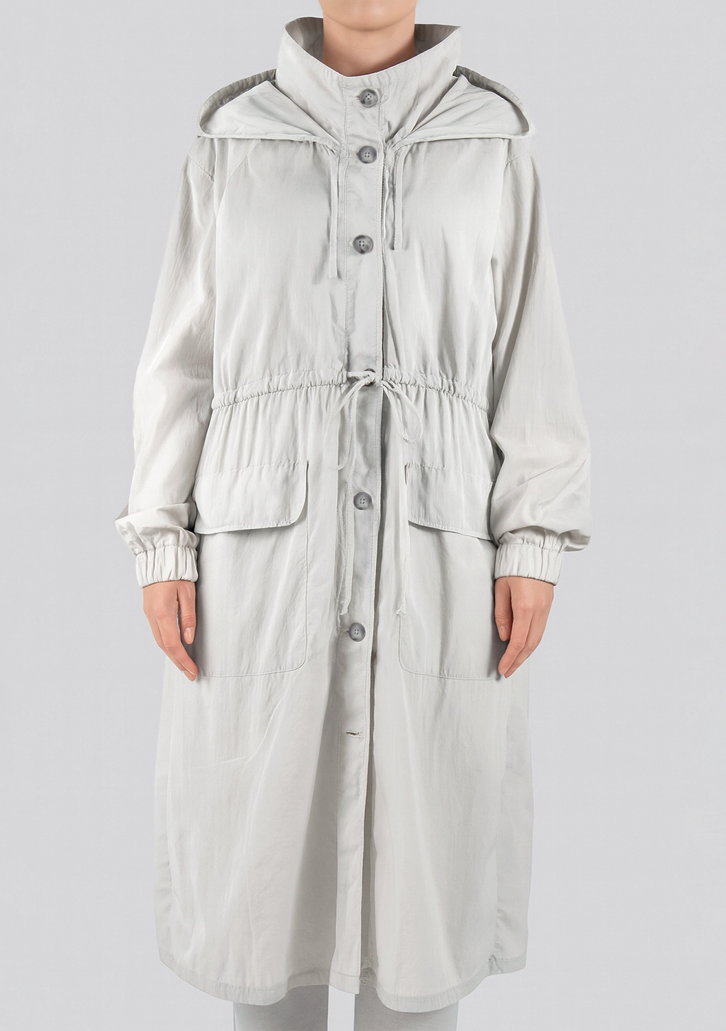 Стильный плащ из легкой водоотталкивающей ткани с регулируемой резинкой на талии и высоким воротником идеально подходит для переменчивой погоды. Прямой крой и глубокие карманы добавляют практичности, а сдержанный жемчужный оттенок подчеркивает утонченный вкус. Отличный выбор для городской моды и непогоды.