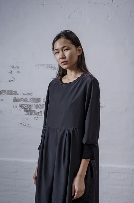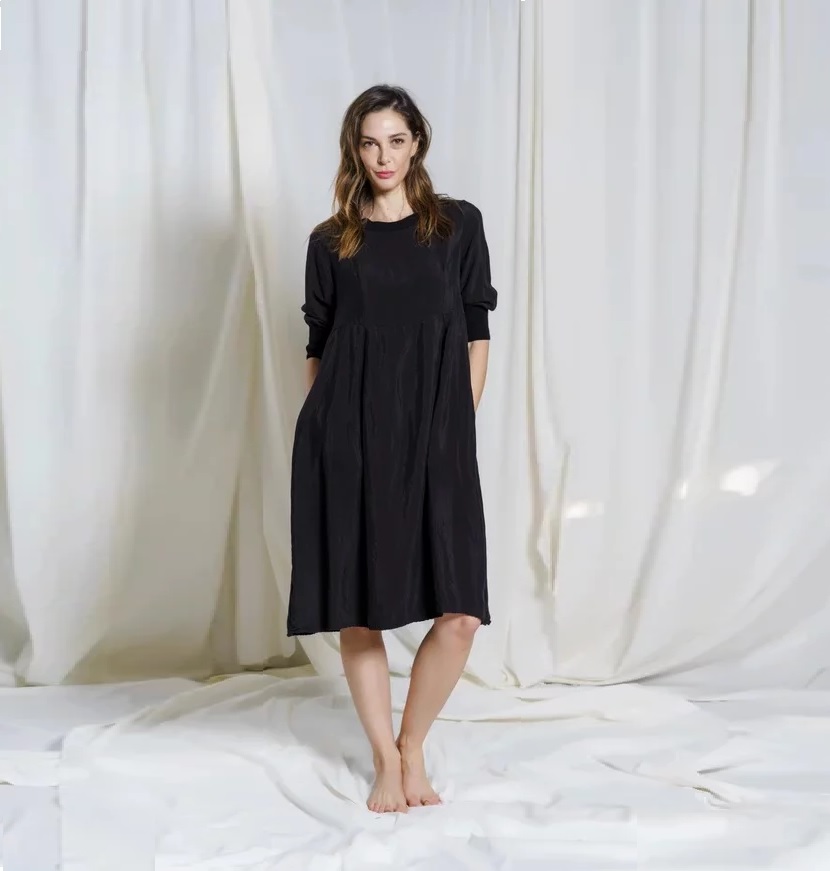 Платье средней длинны с круглый вырезом из струящейся ткани, смеси купро и вискозы. Отрезная талия декорирована двумя встречными складками, ворот и рукава декорированы текстильной резинкой на несколько тонов темнее основного цвета платья, есть два кармана.