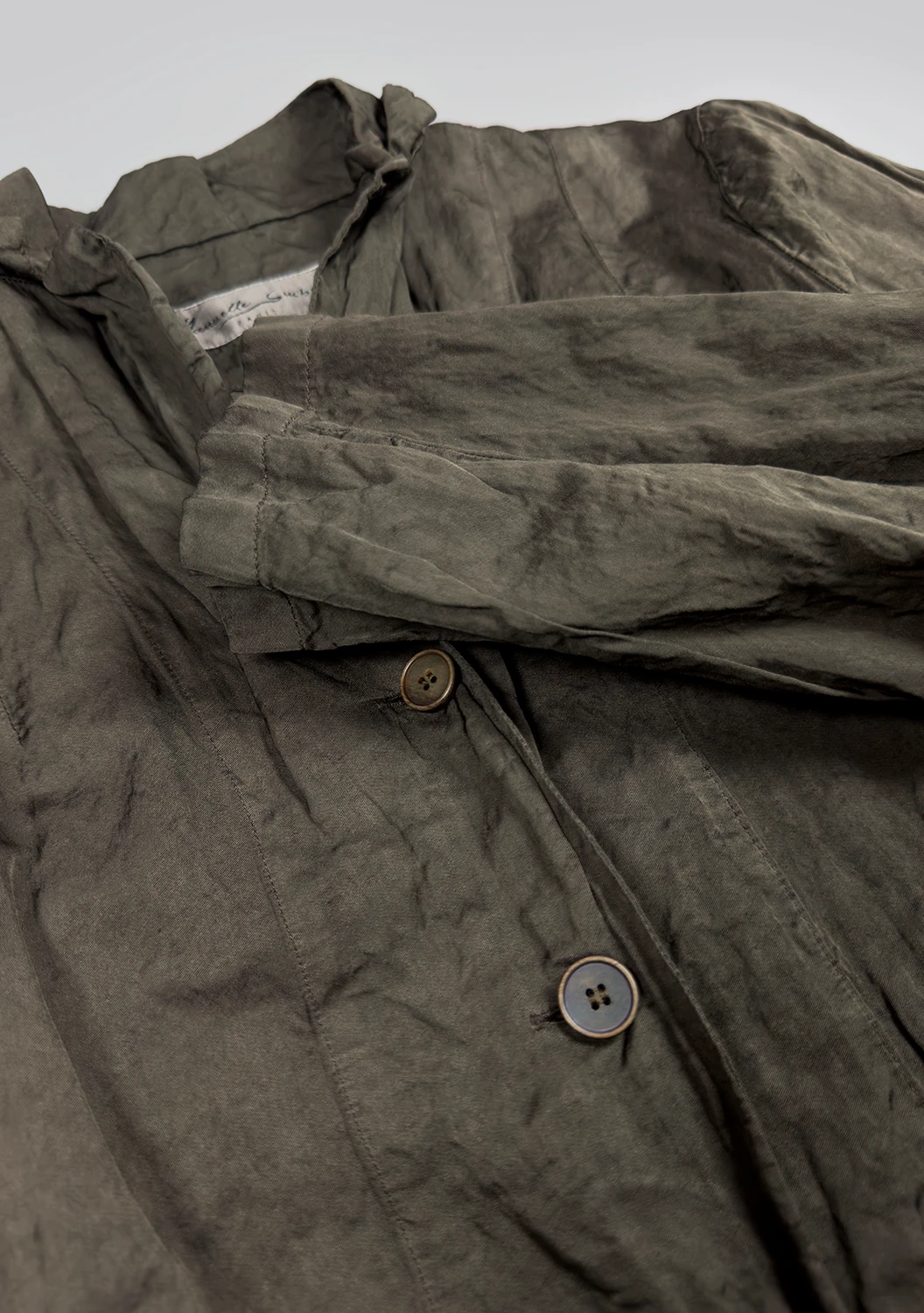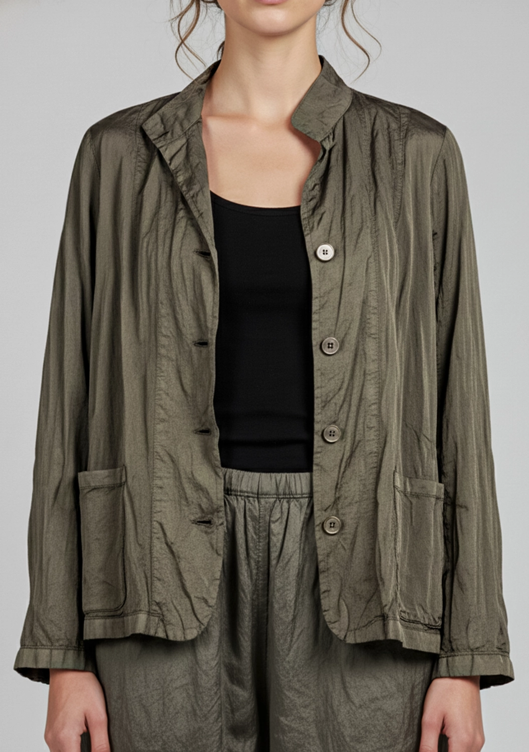 Прямой силуэт, накладные карманы и лаконичный крой делают вещь универсальной — она легко впишется как в кэжуал-гардероб, так и в более художественные образы. Нежный шелест ткани при движении и чуть прохладное прикосновение к коже добавляют особого ощущения — этот жакет хочется носить и чувствовать.